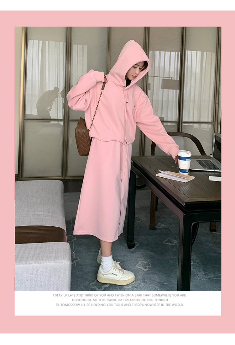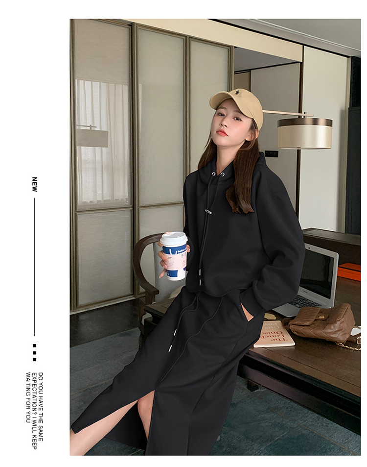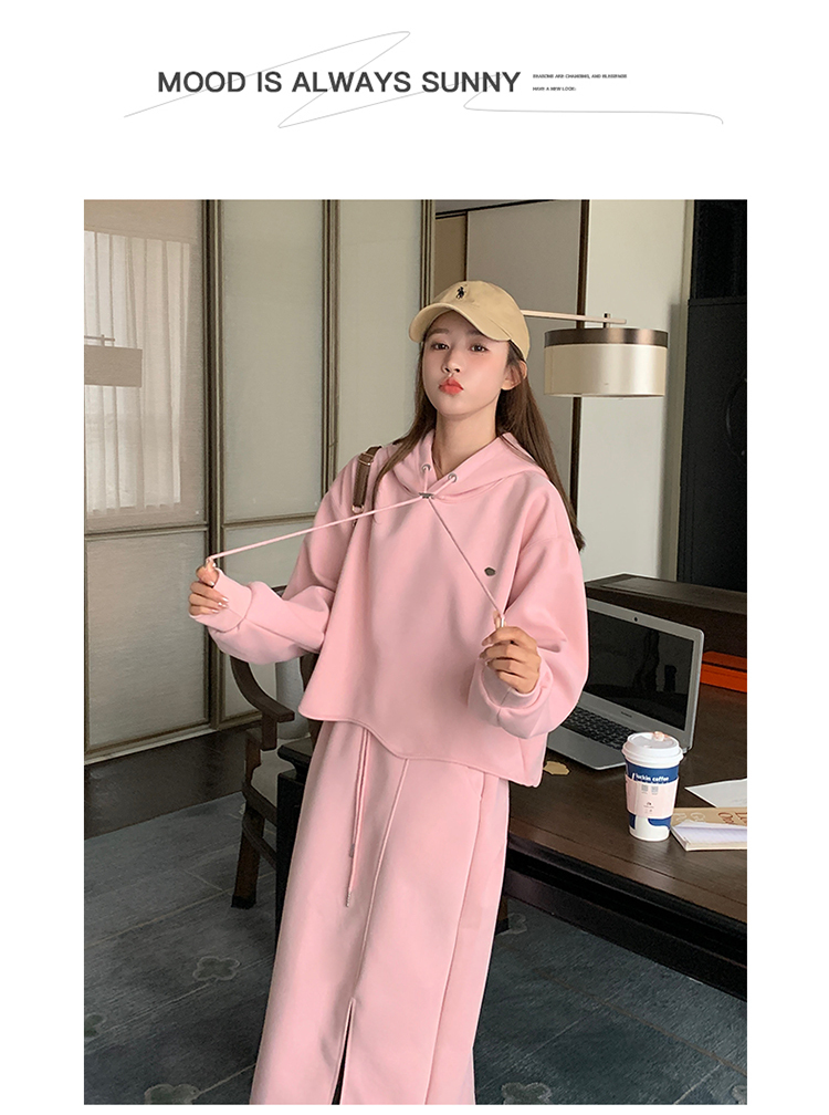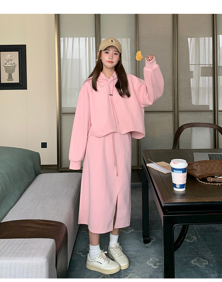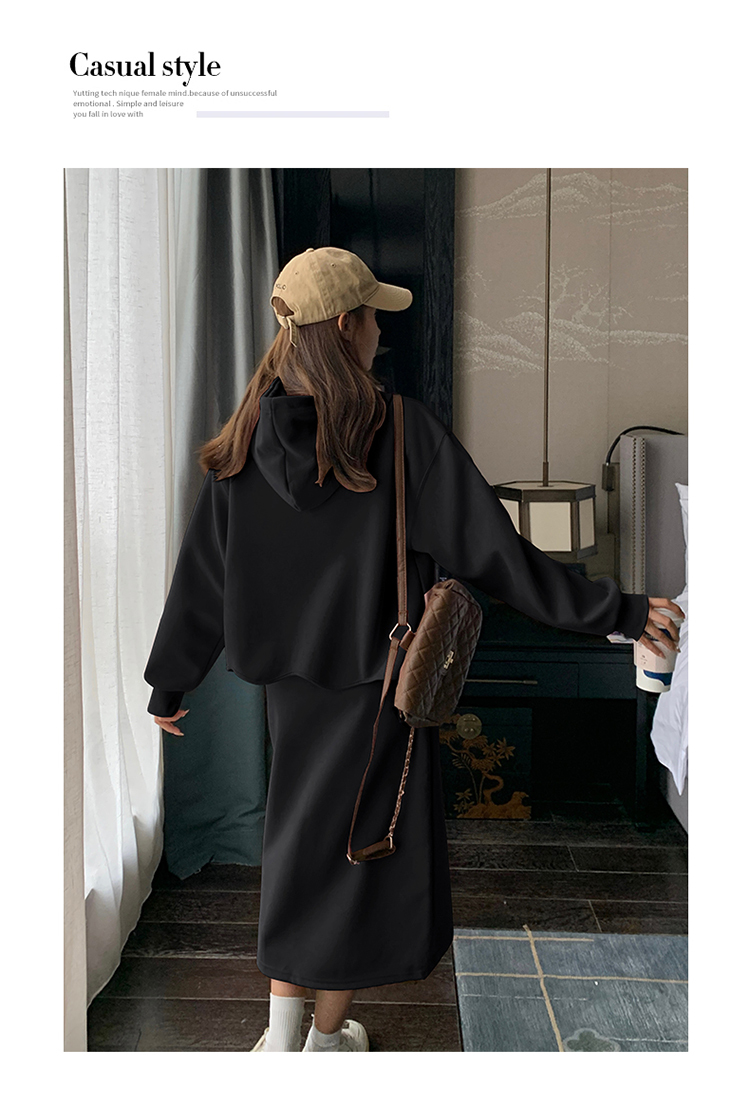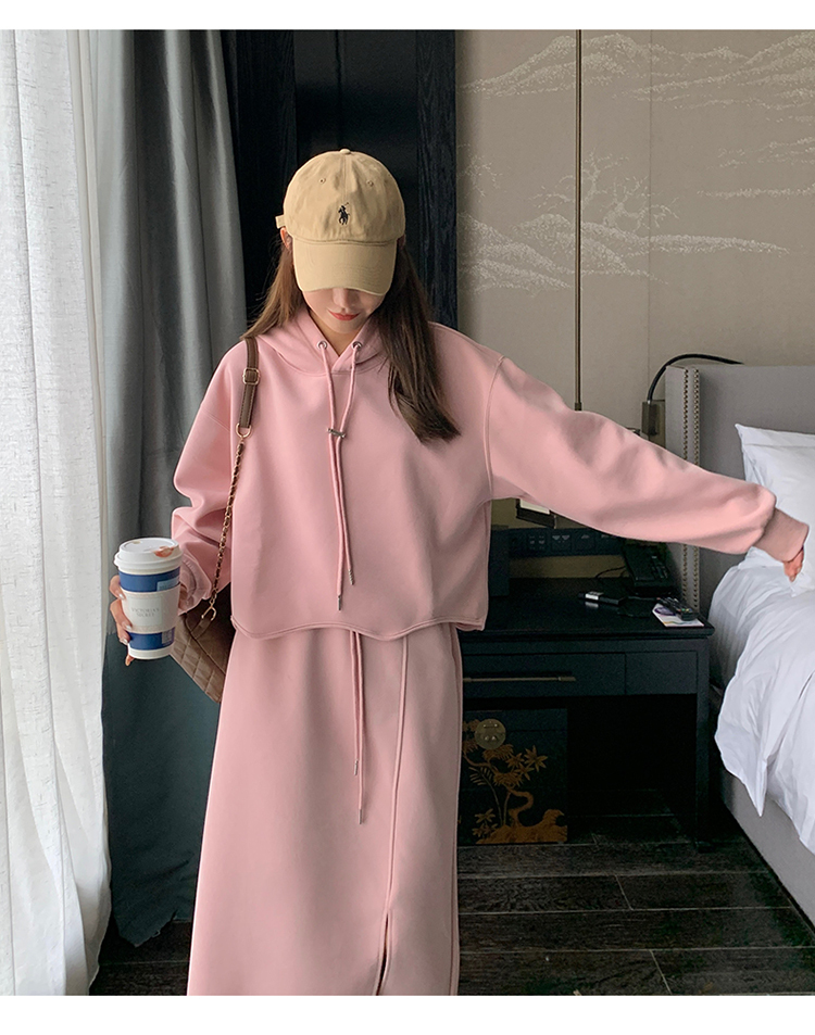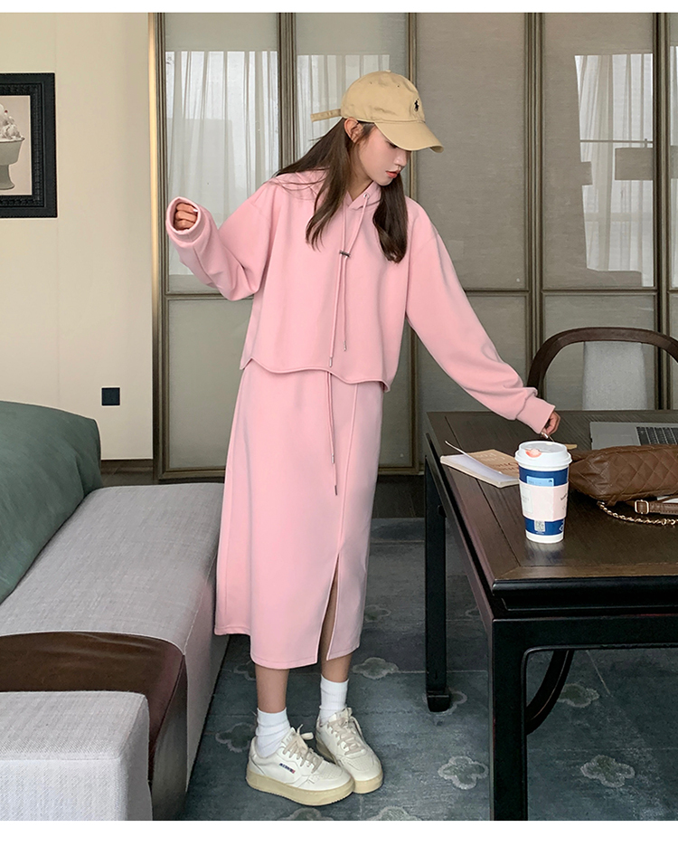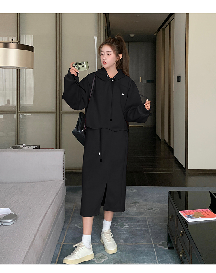 獨家訂製│韓系慵懶感連帽T恤+開叉A字裙兩件式套裝組-2色(01H5627)
