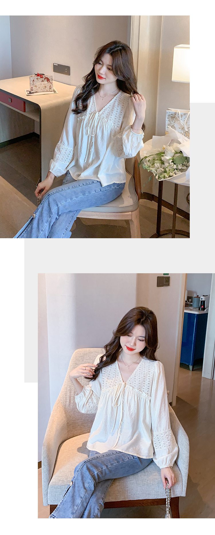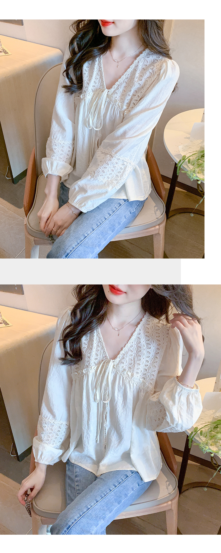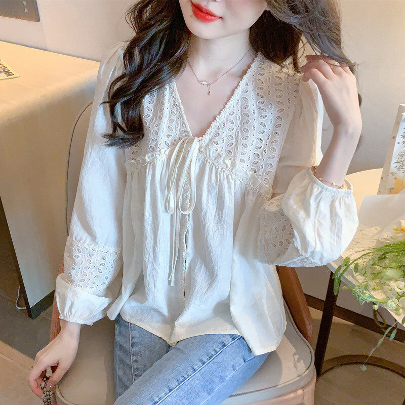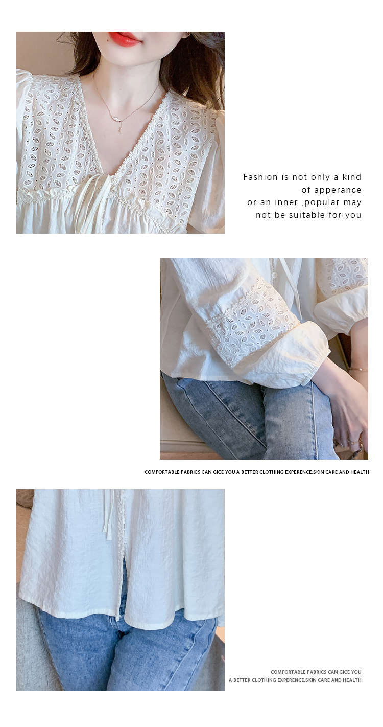 限量特惠|氣質甜美V領蕾絲鏤空繫帶娃娃衫(01H5826)