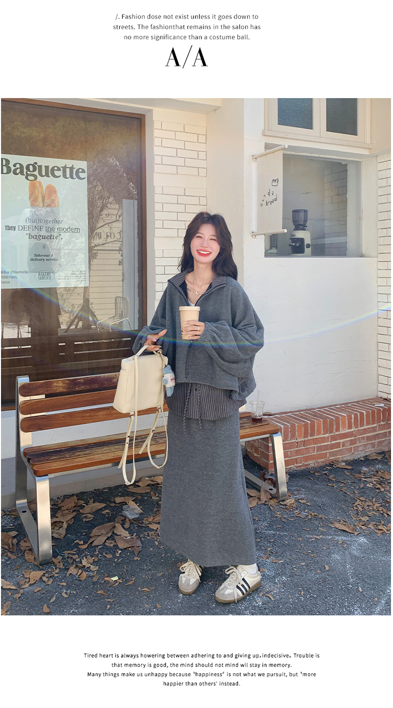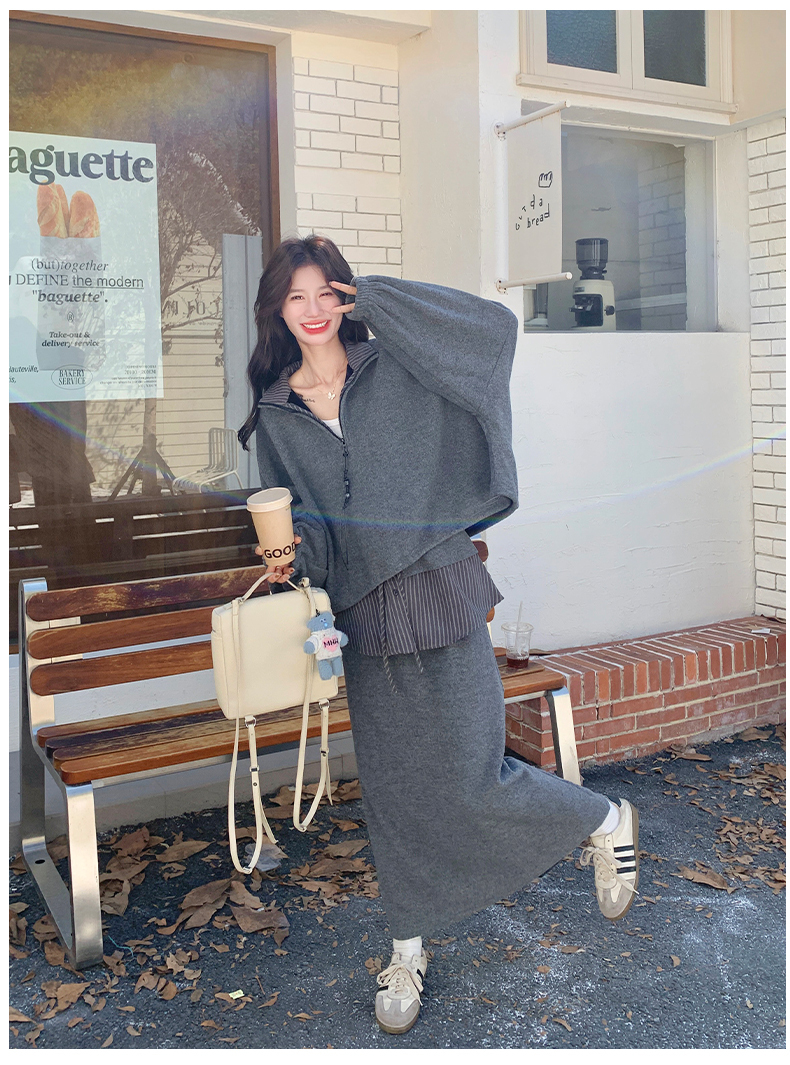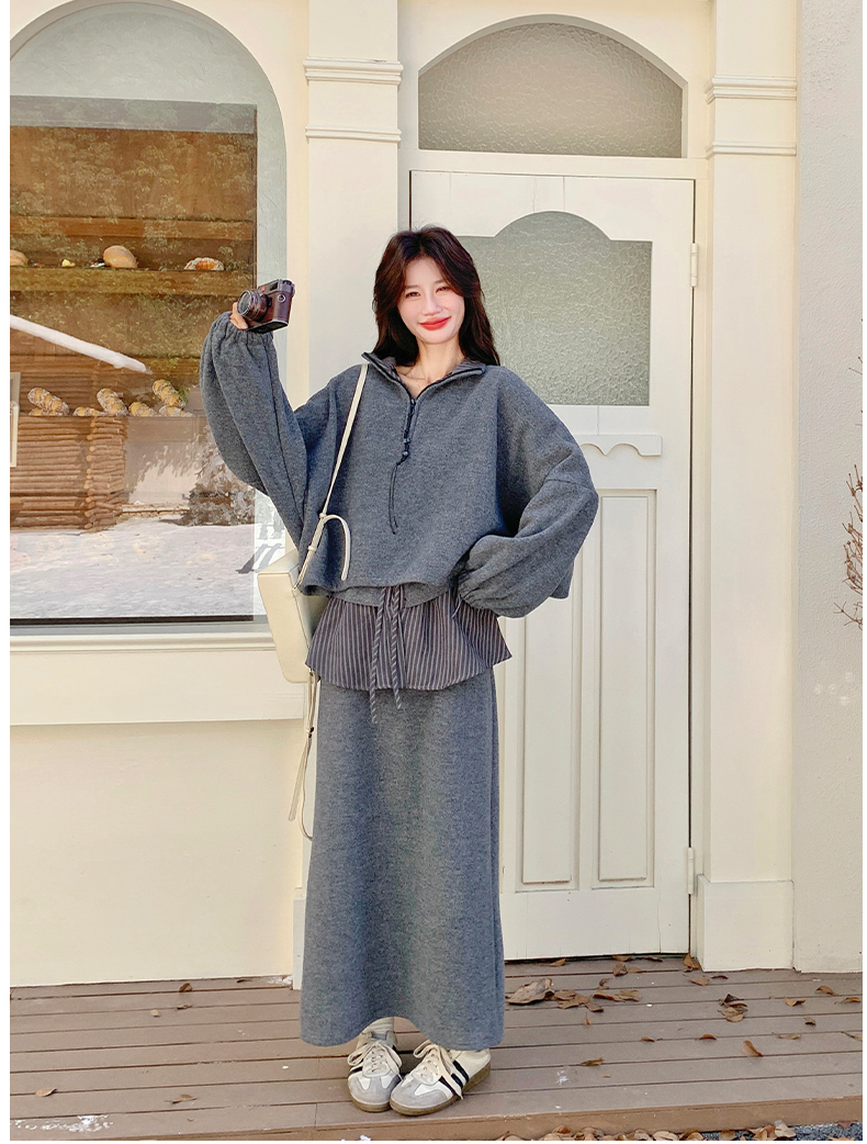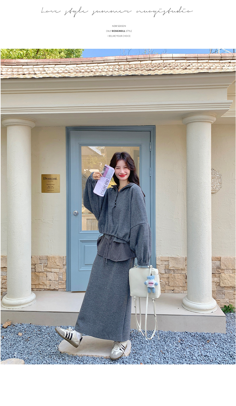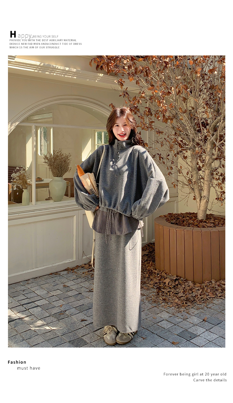 獨家訂製│2件式 翻領上衣+條紋拼接A字裙(02A1862)