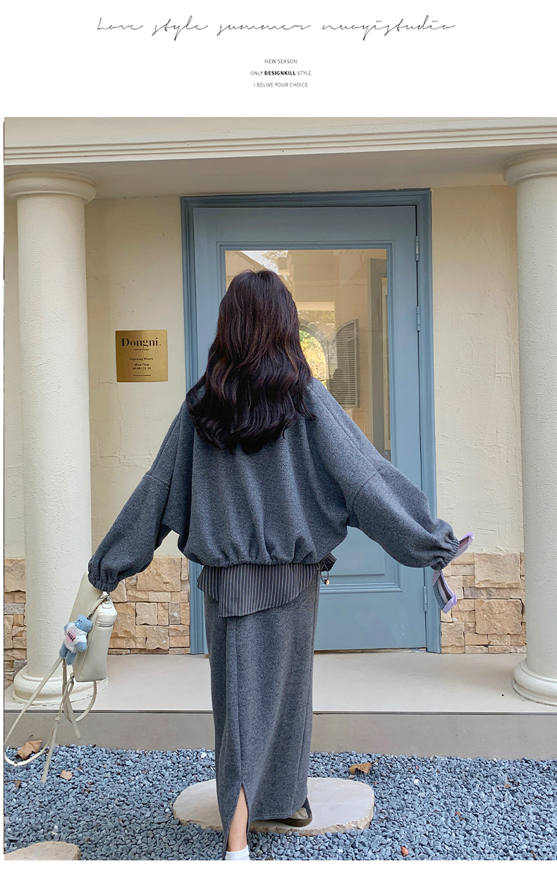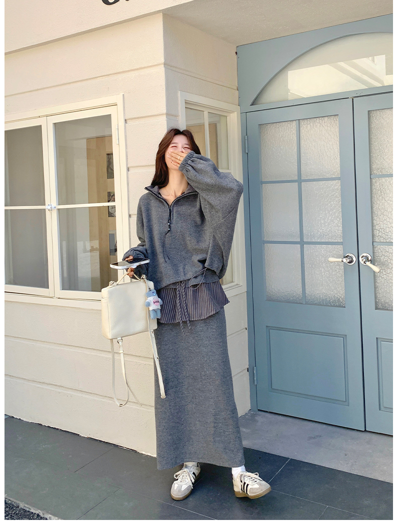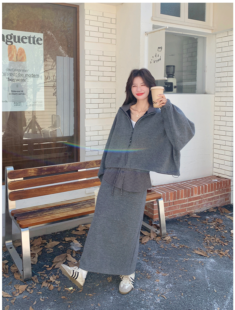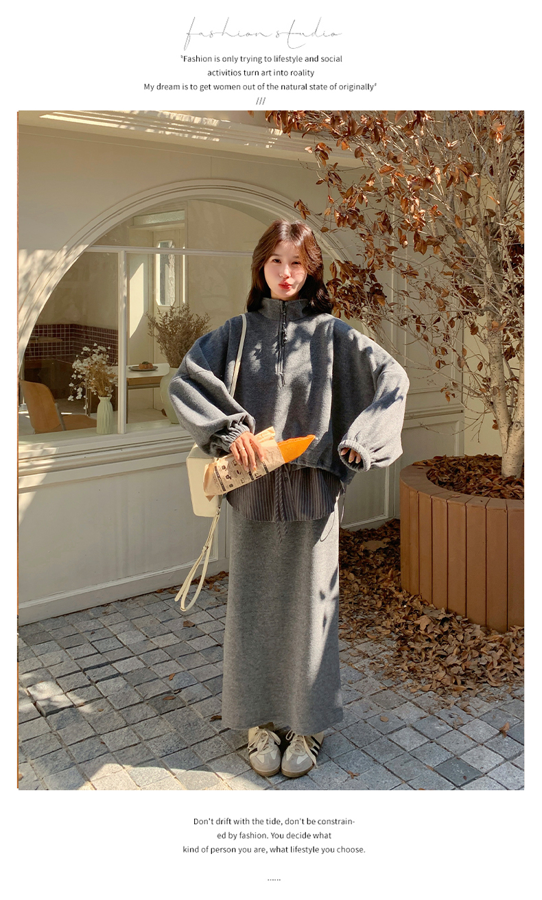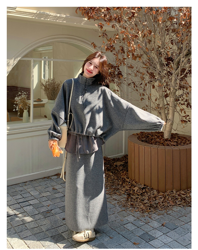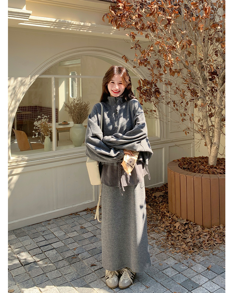 獨家訂製│2件式 翻領上衣+條紋拼接A字裙(02A1862)
