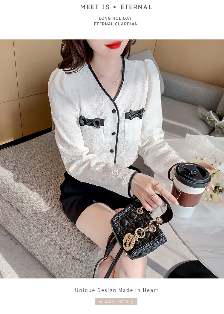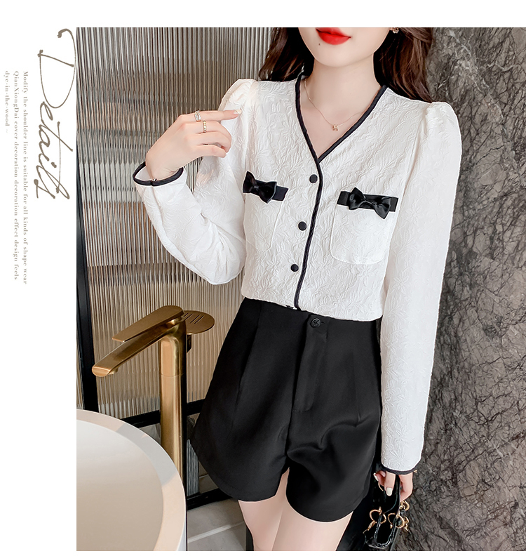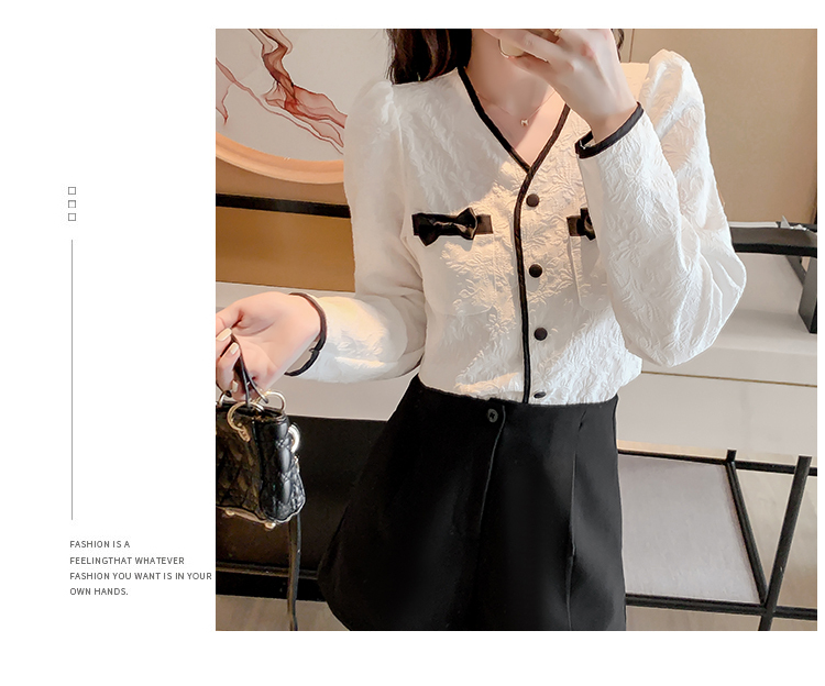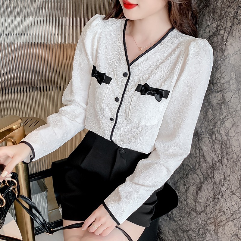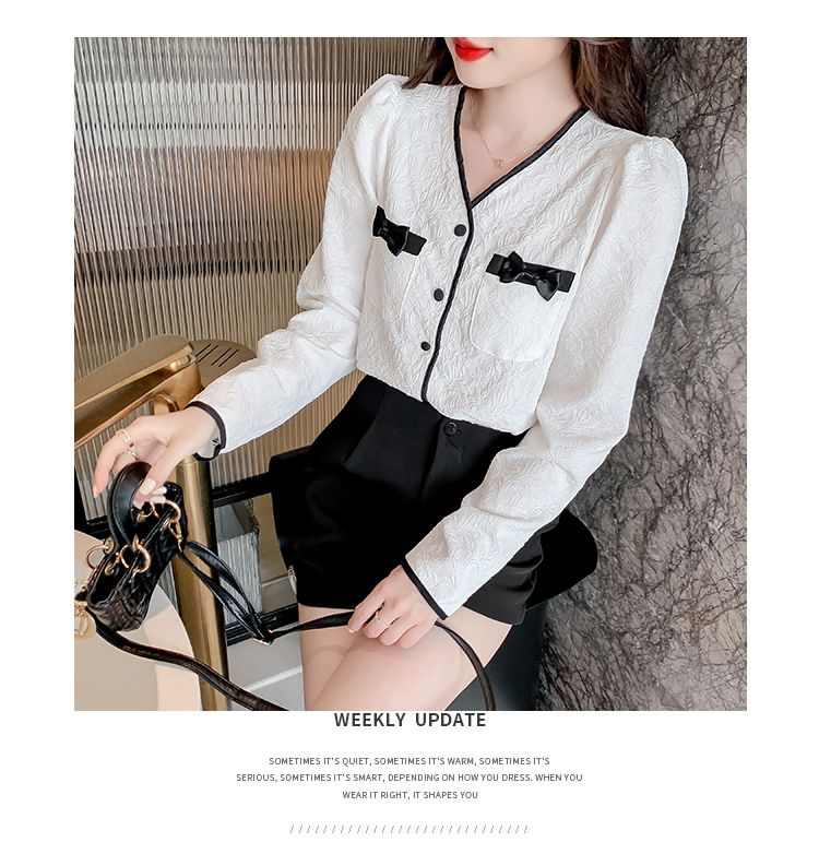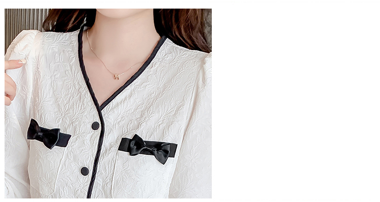 限量特惠|氣質V領撞色蝴蝶結壓紋雪紡衫(02M2387)