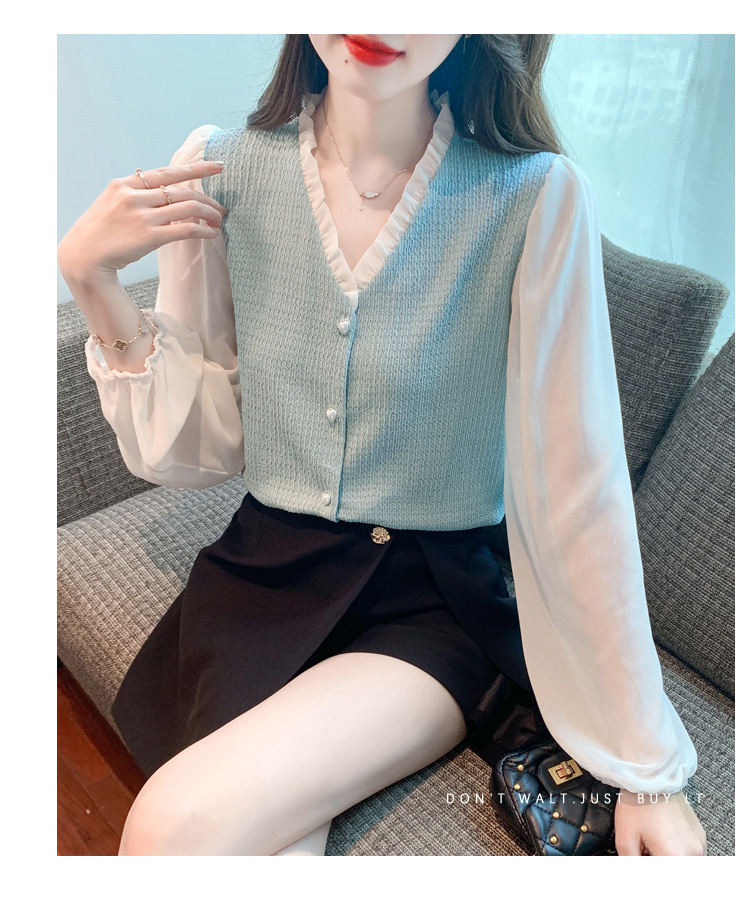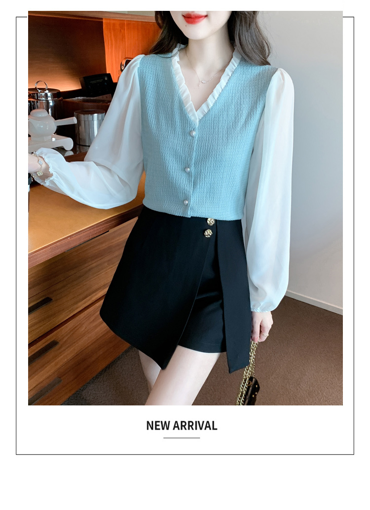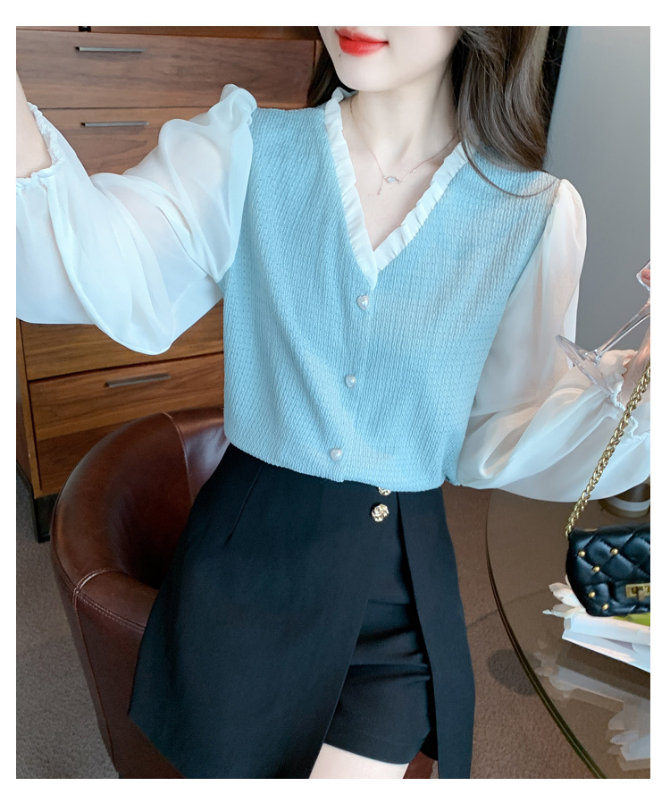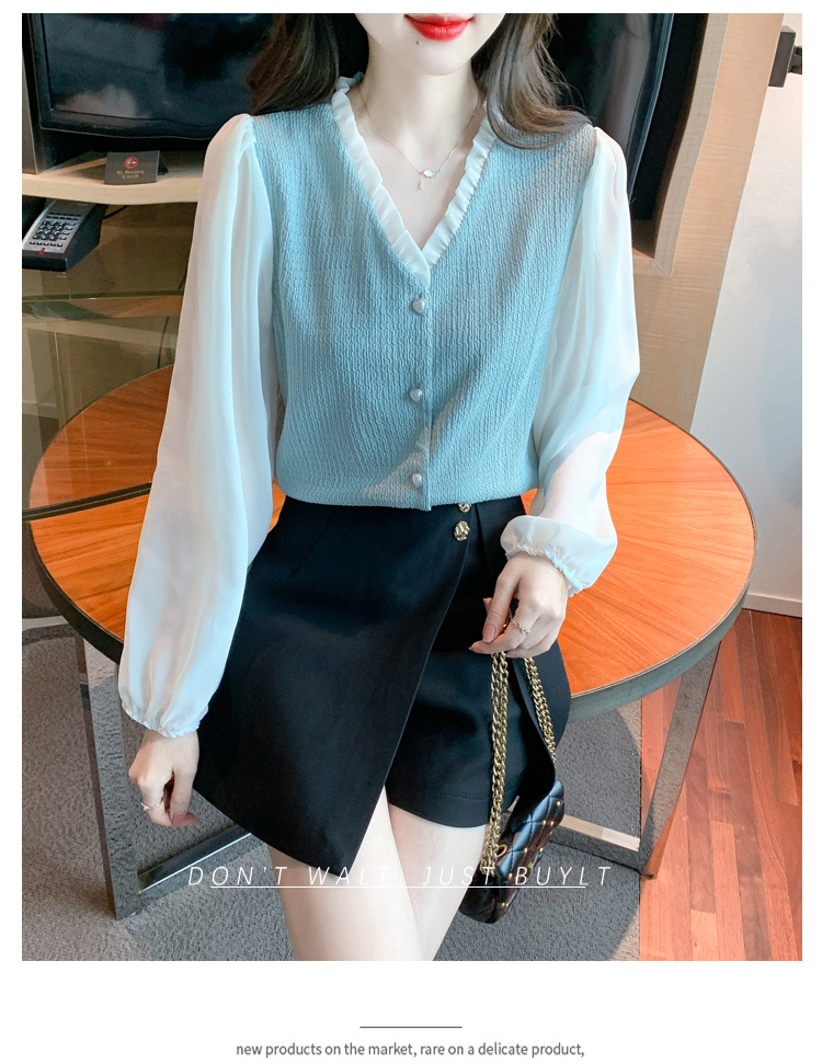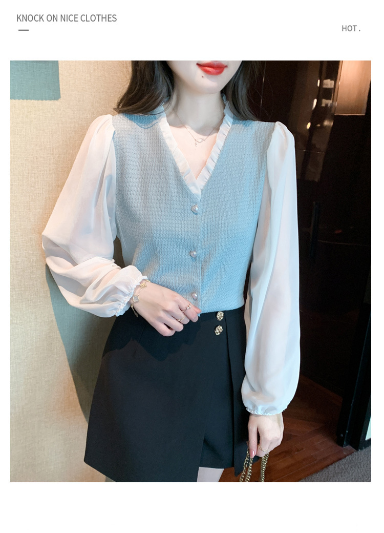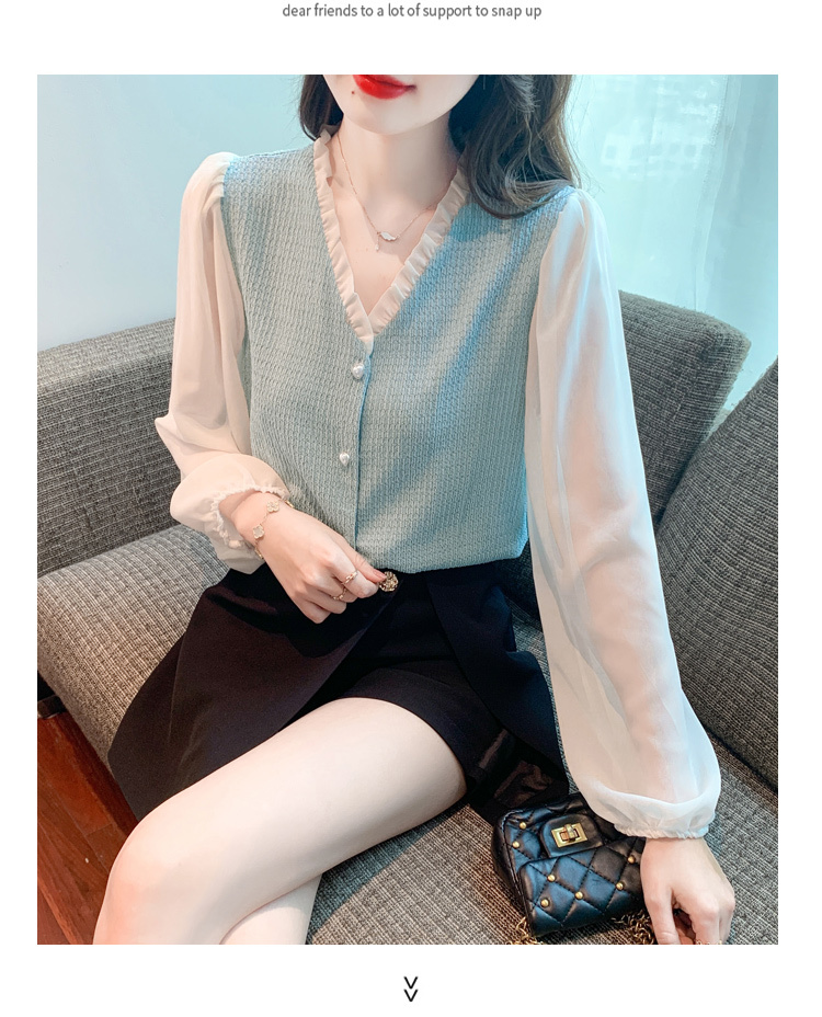 限量特惠|氣質木耳邊V領撞色拼接雪紡衫(02M2417)