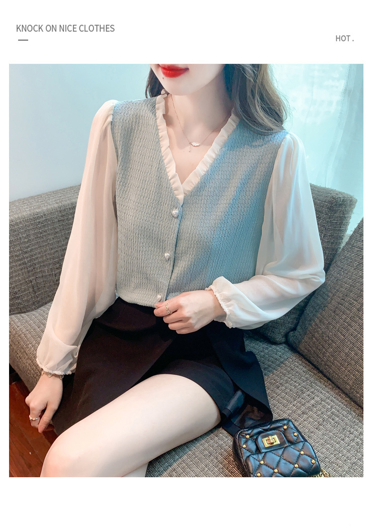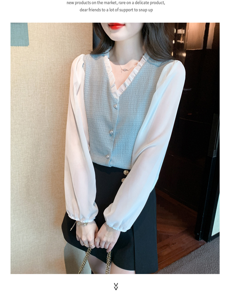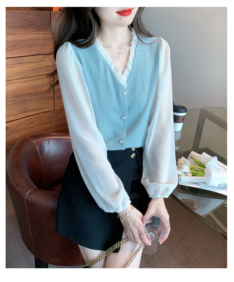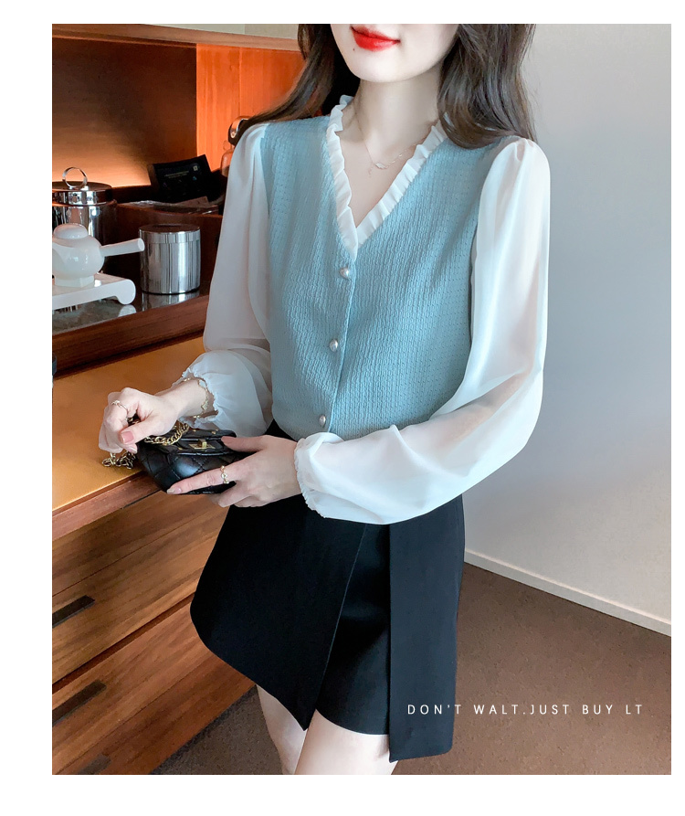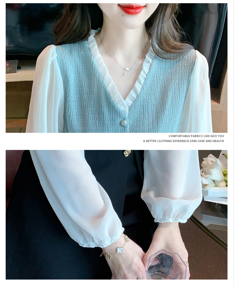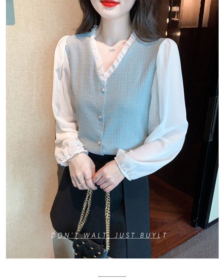 限量特惠|氣質木耳邊V領撞色拼接雪紡衫(02M2417)
