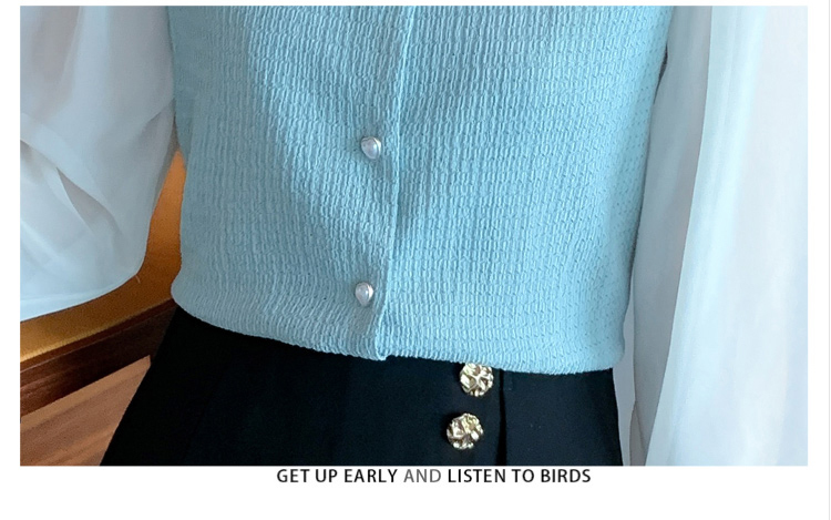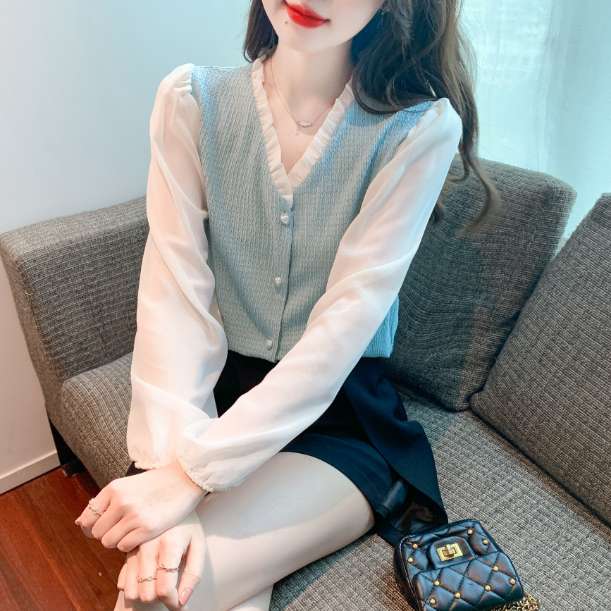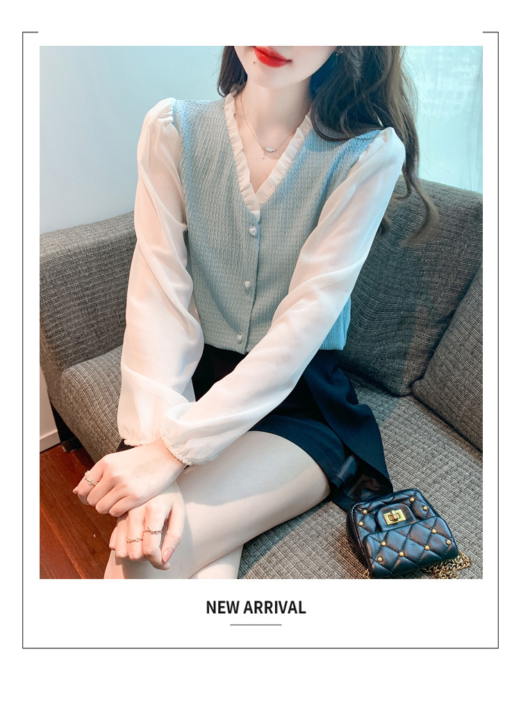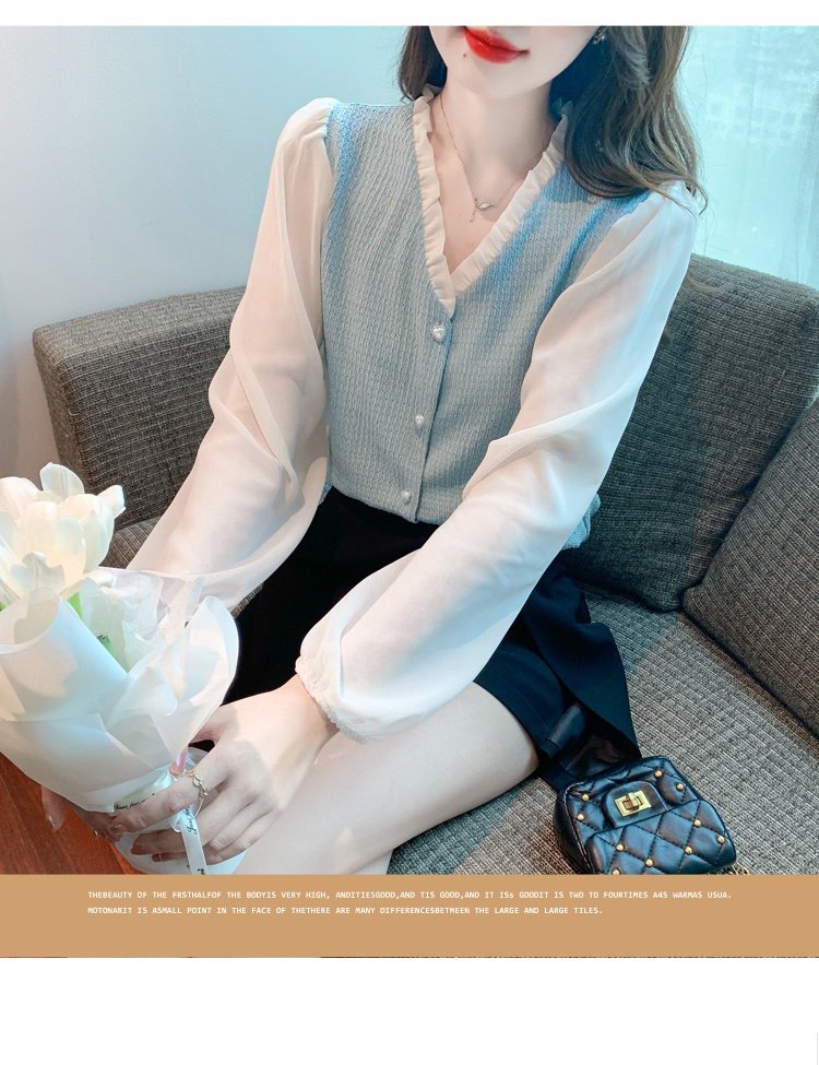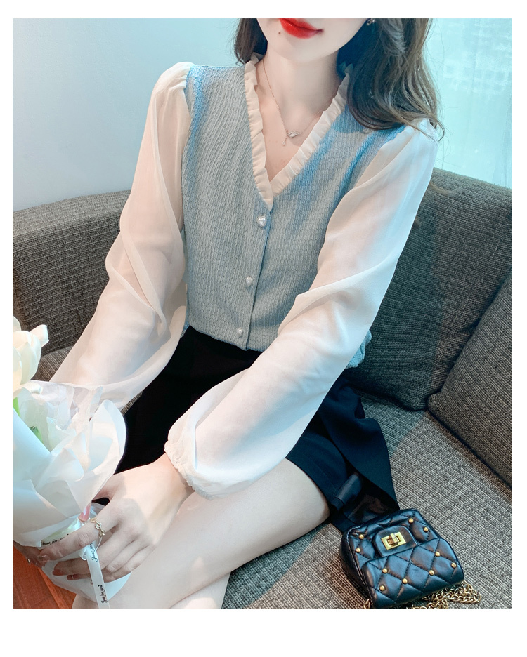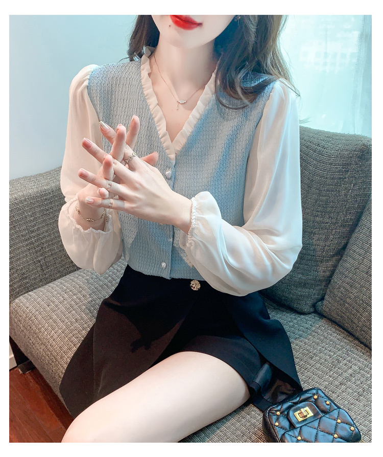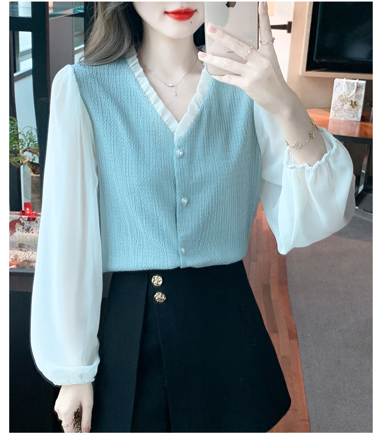 限量特惠|氣質木耳邊V領撞色拼接雪紡衫(02M2417)