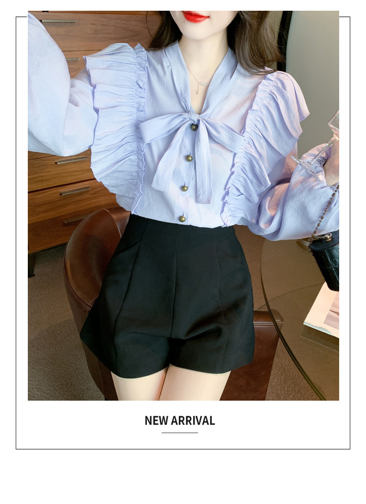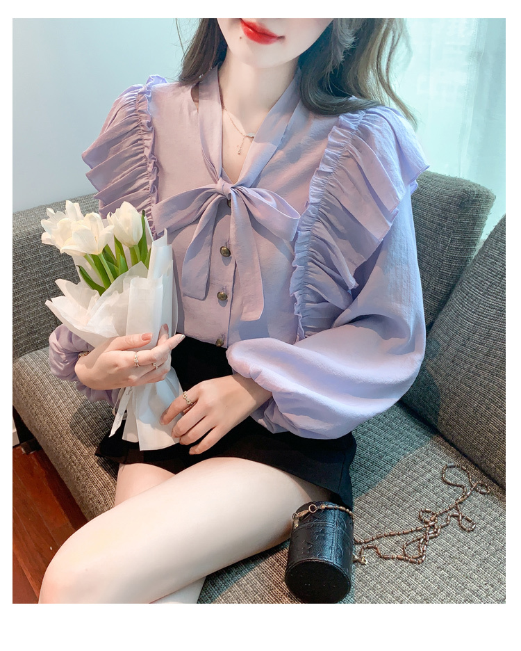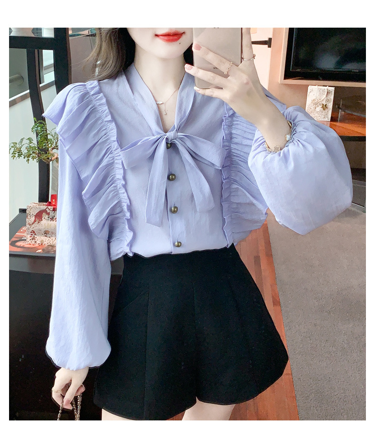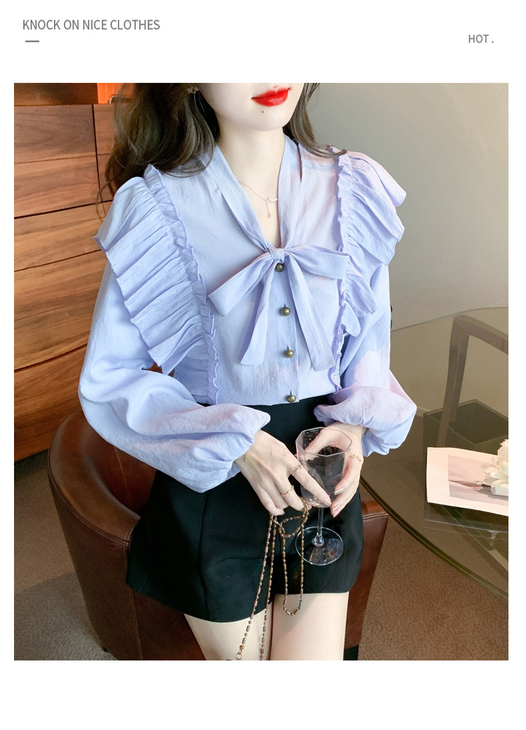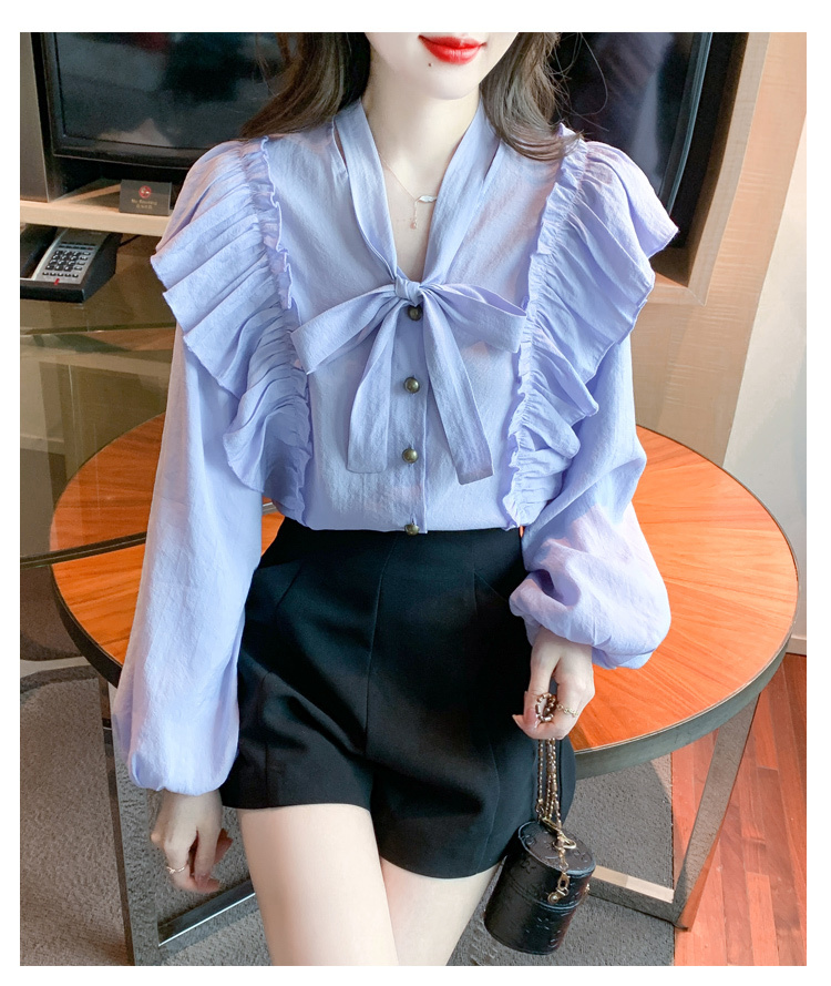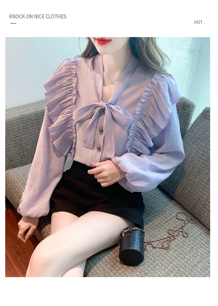 限量特惠|氣質V領繫帶拼接荷葉邊造型雪紡衫(02M2418)