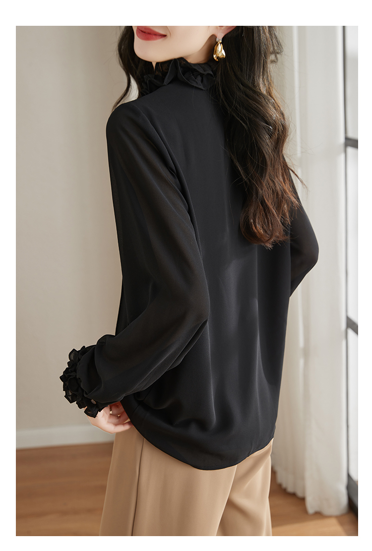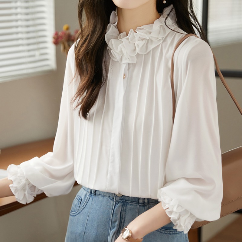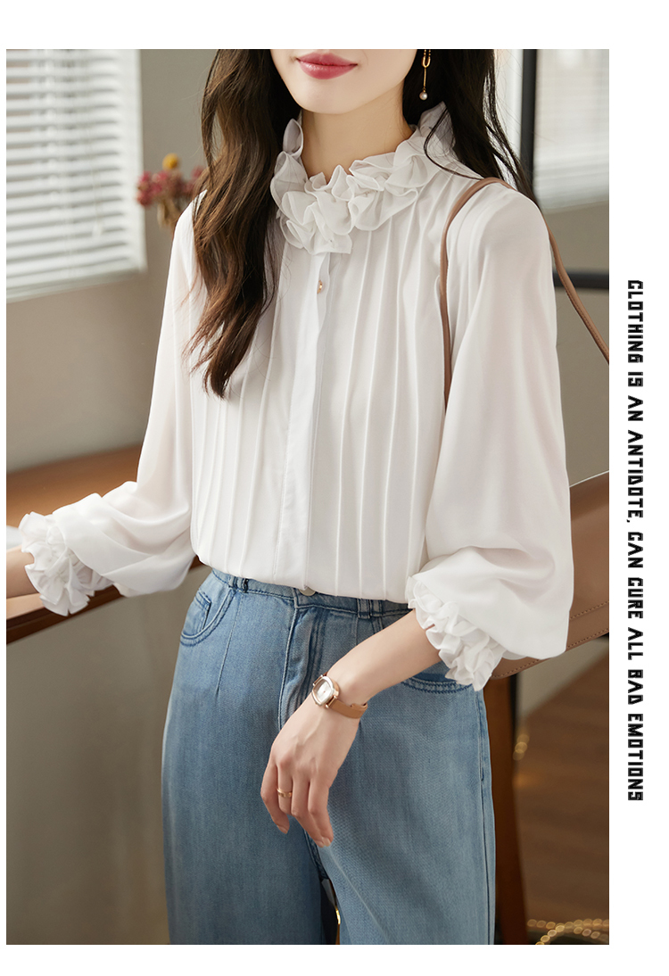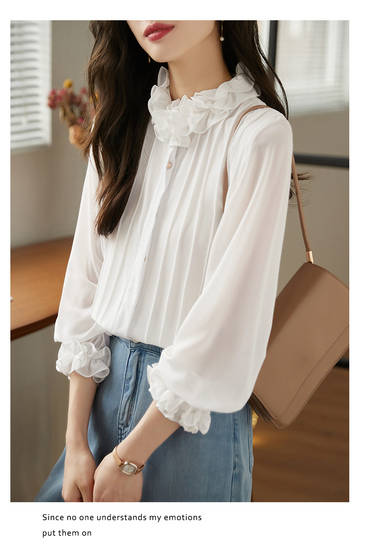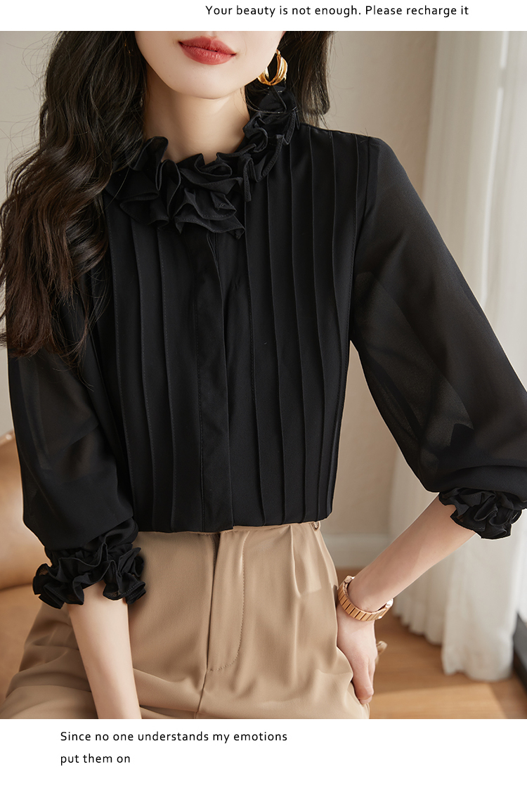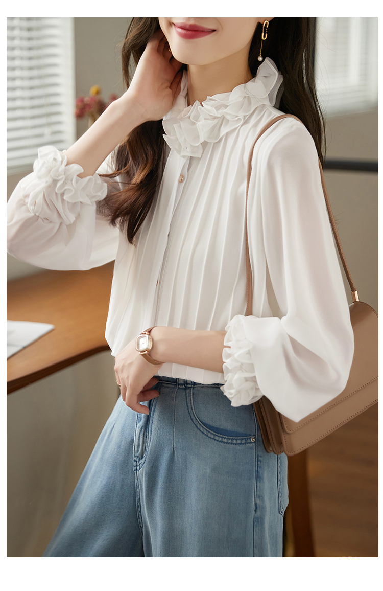 限量特惠|法式木耳邊立領褶皺雪紡衫-2色(02M2444)