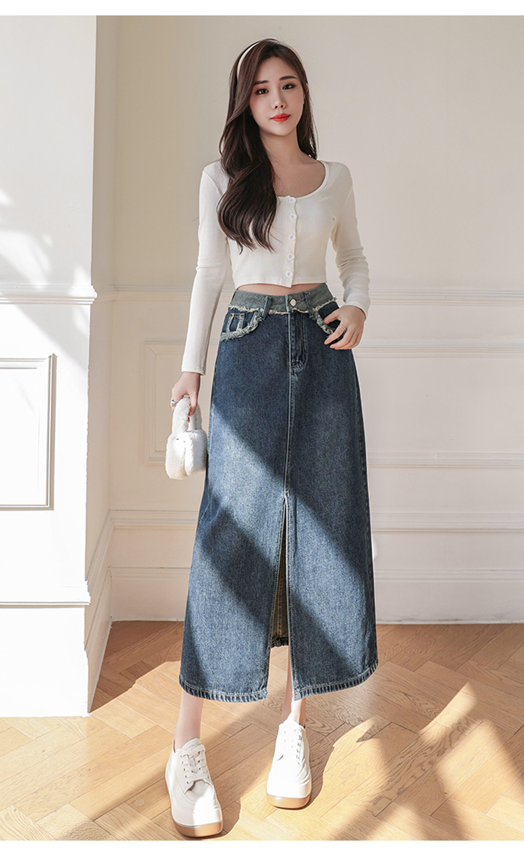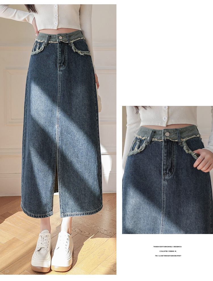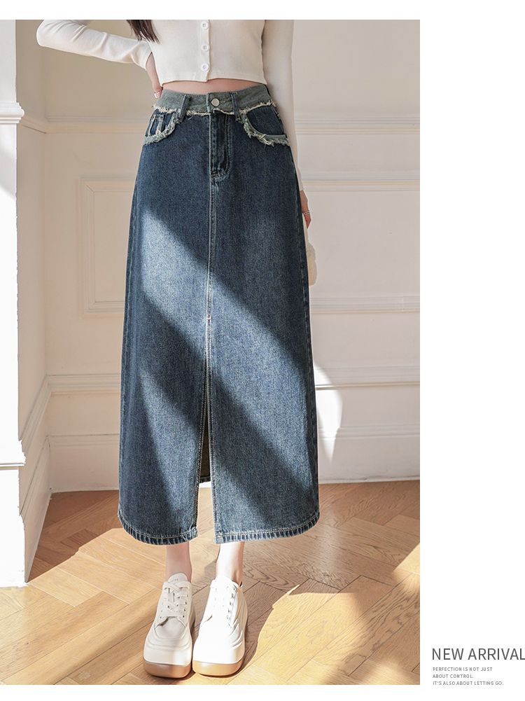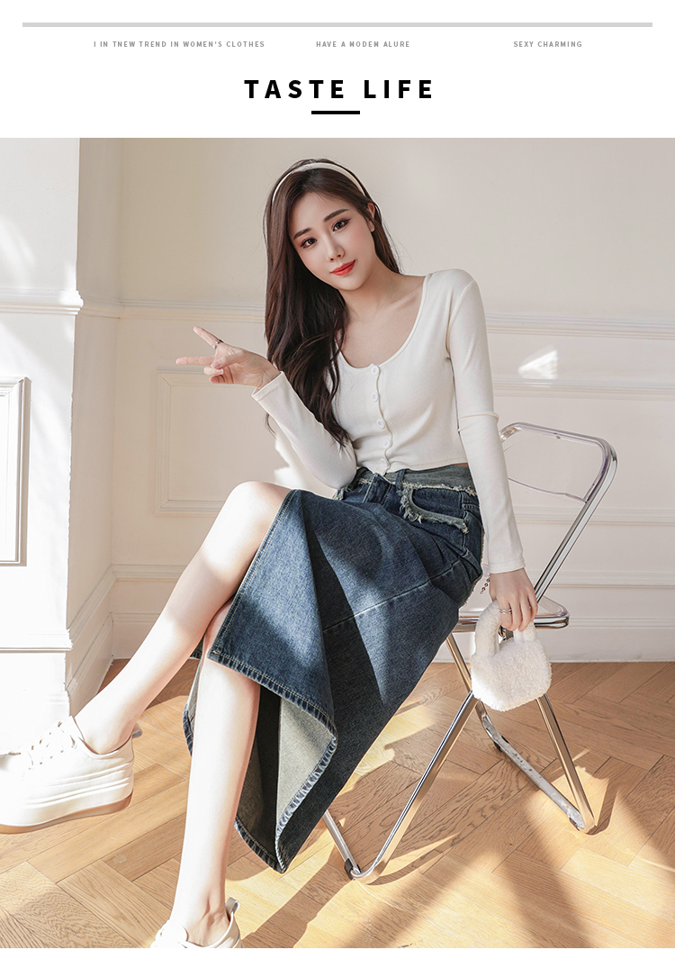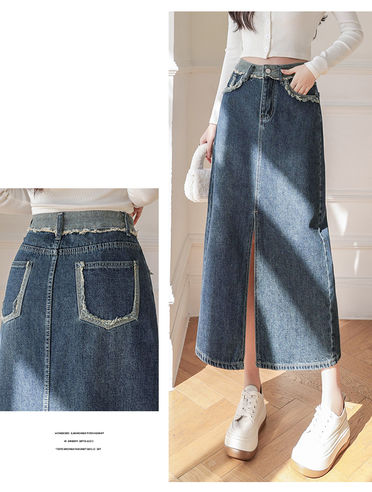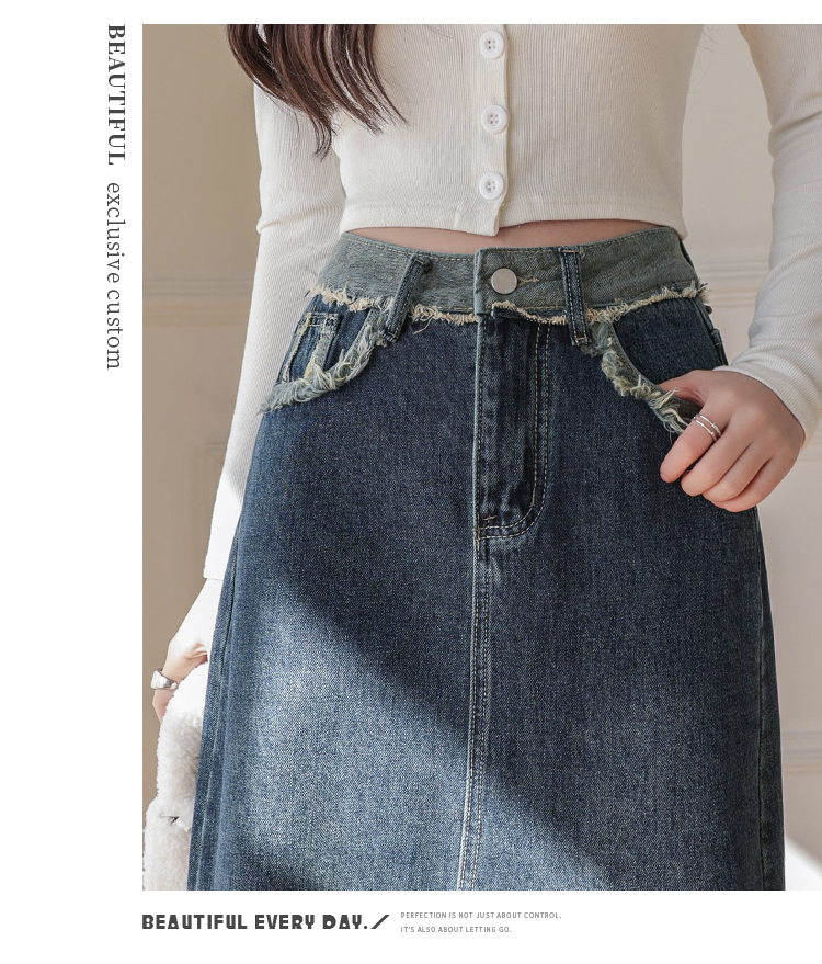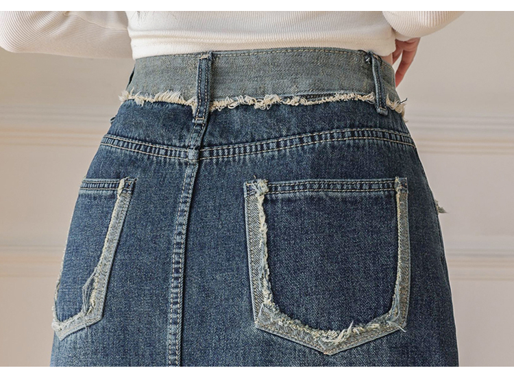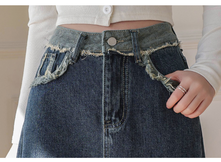 限量特惠|個性腰部撞色毛邊開叉A字牛仔裙(02M2510)