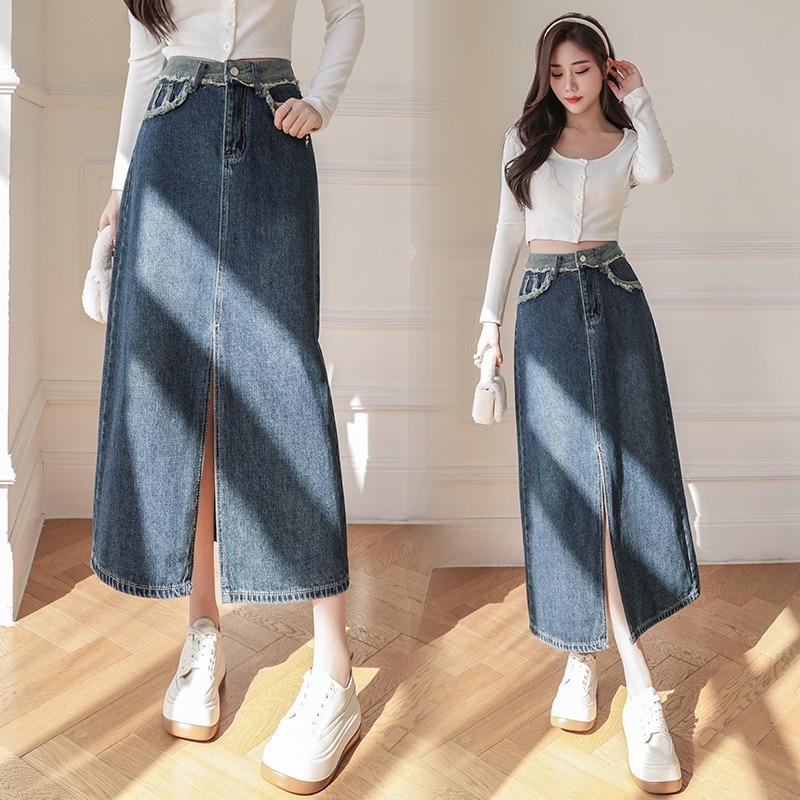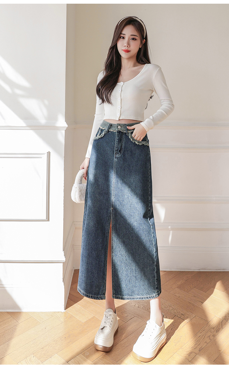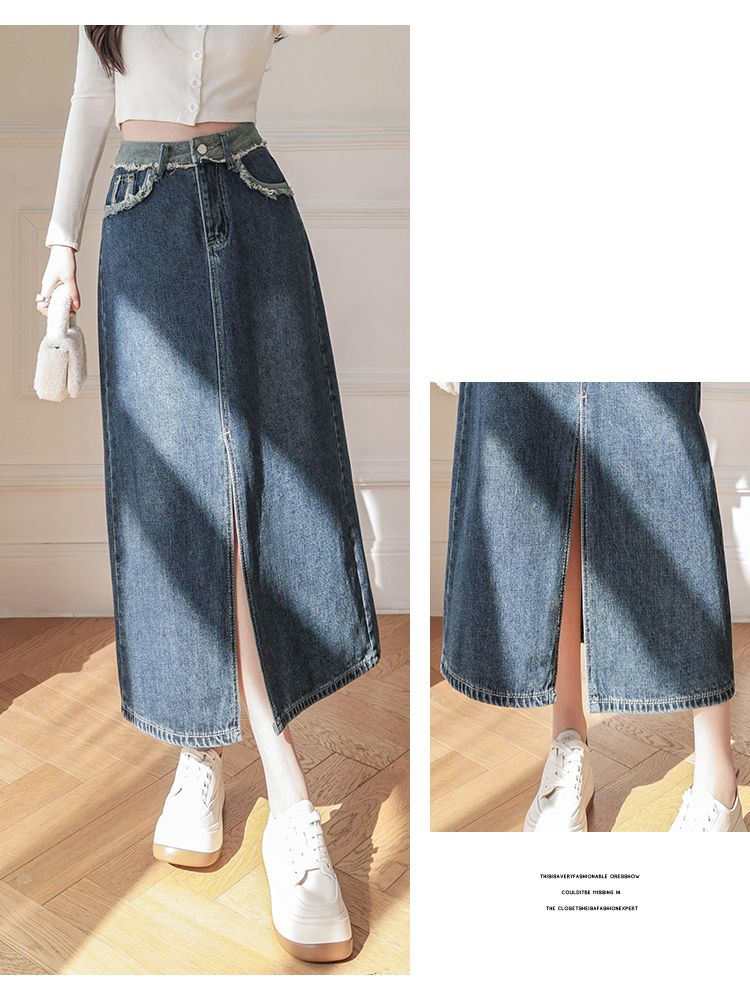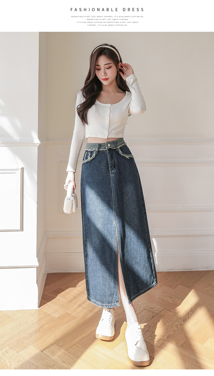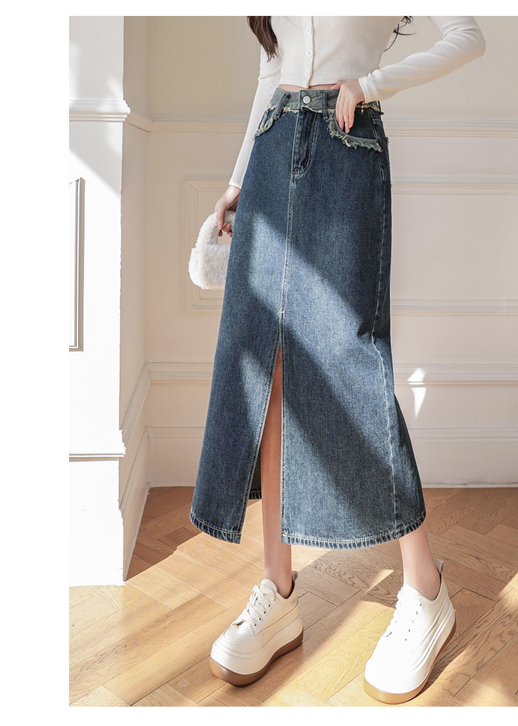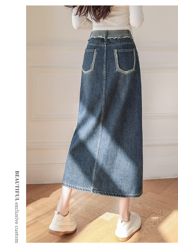 限量特惠|個性腰部撞色毛邊開叉A字牛仔裙(02M2510)