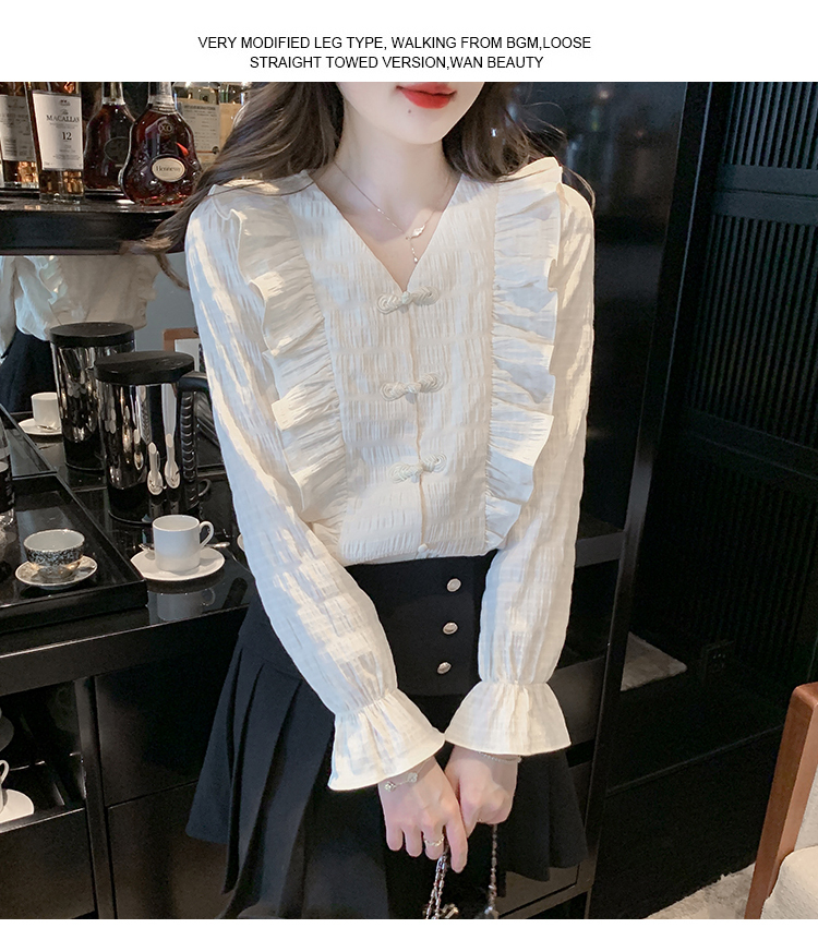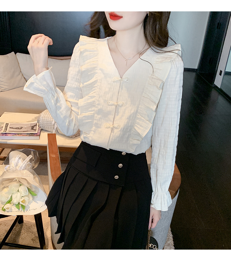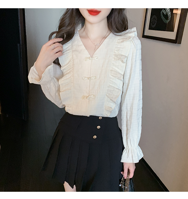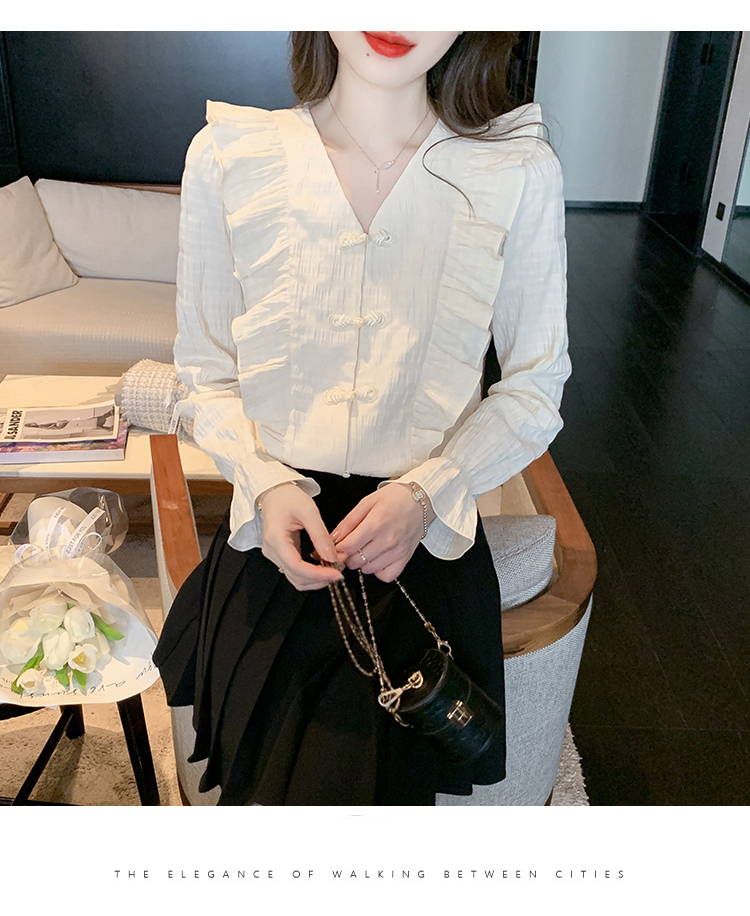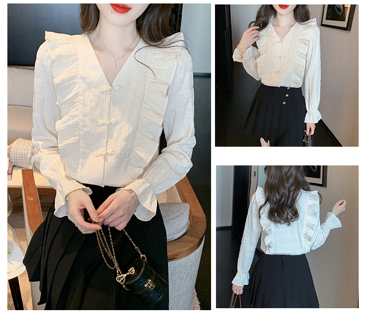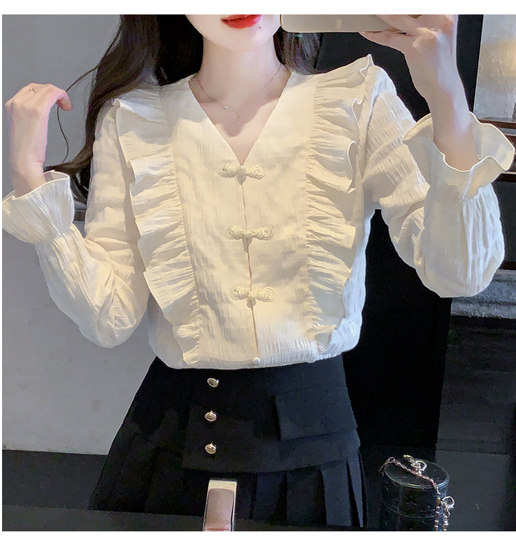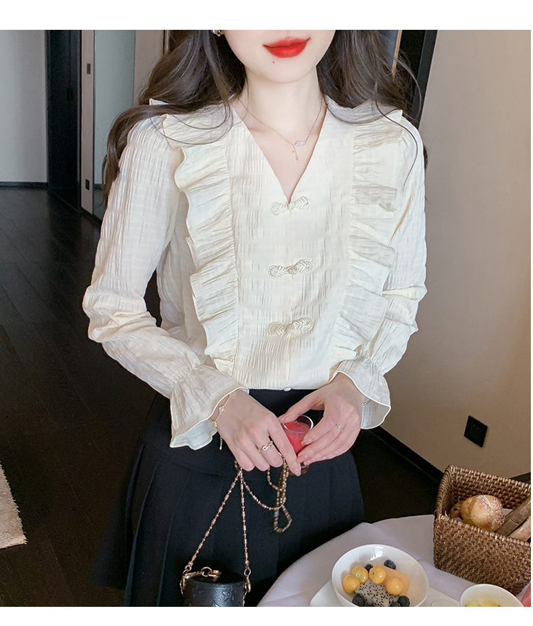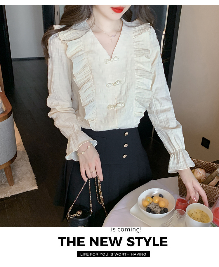 限量特惠|法式荷葉邊V領盤扣造型雪紡衫(02M2546)