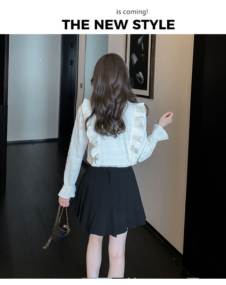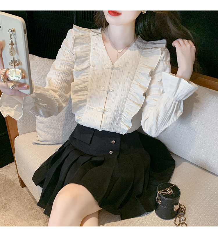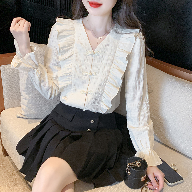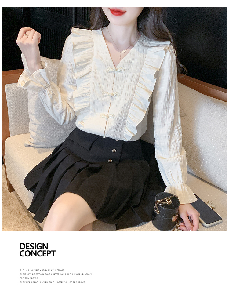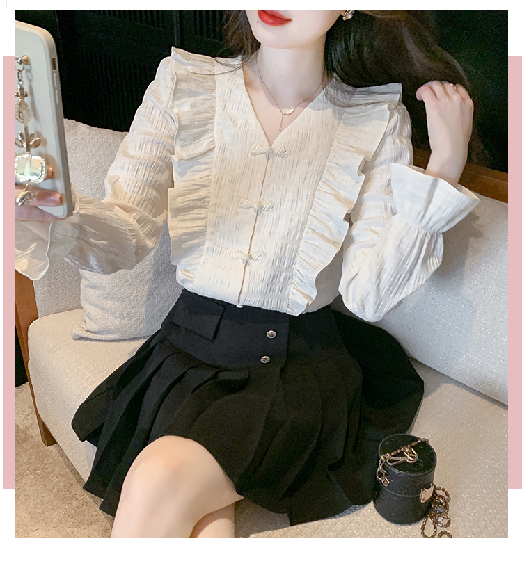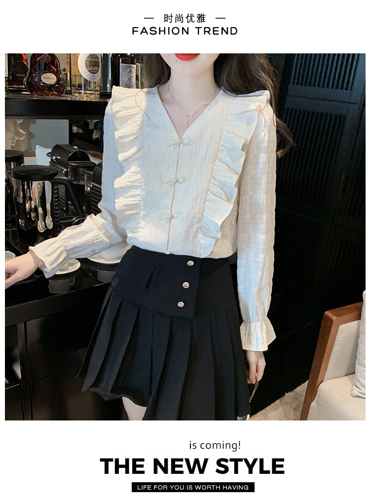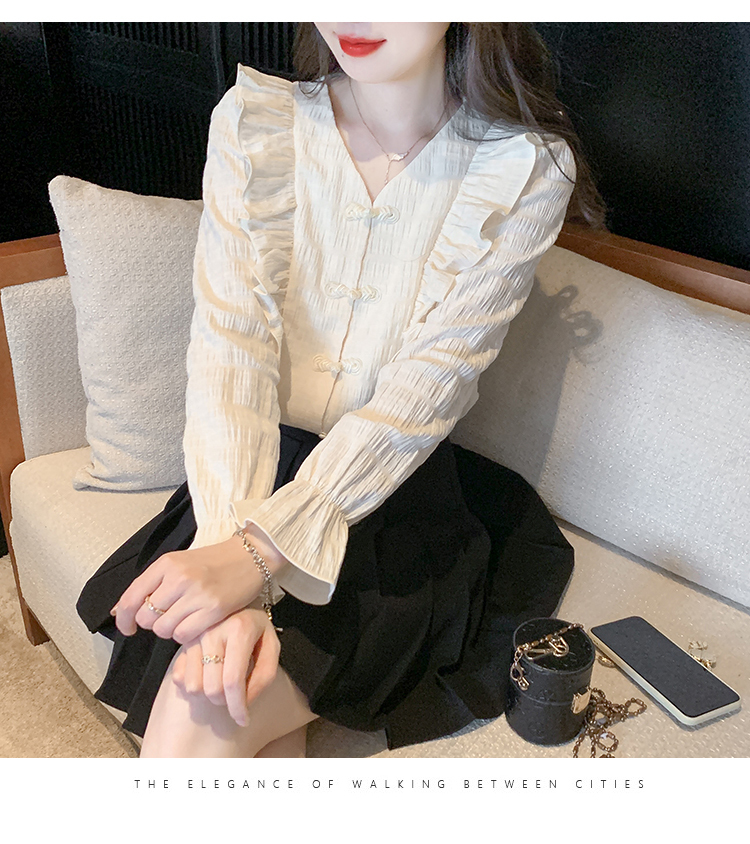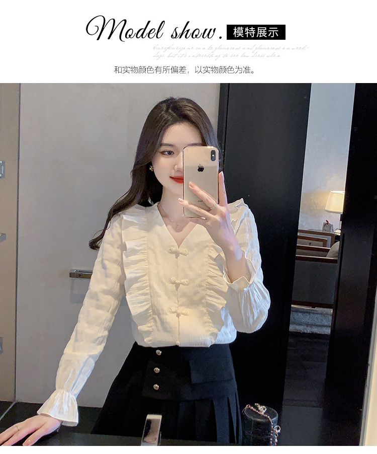 限量特惠|法式荷葉邊V領盤扣造型雪紡衫(02M2546)