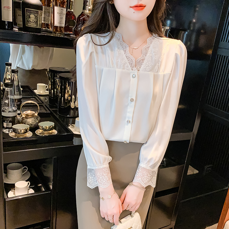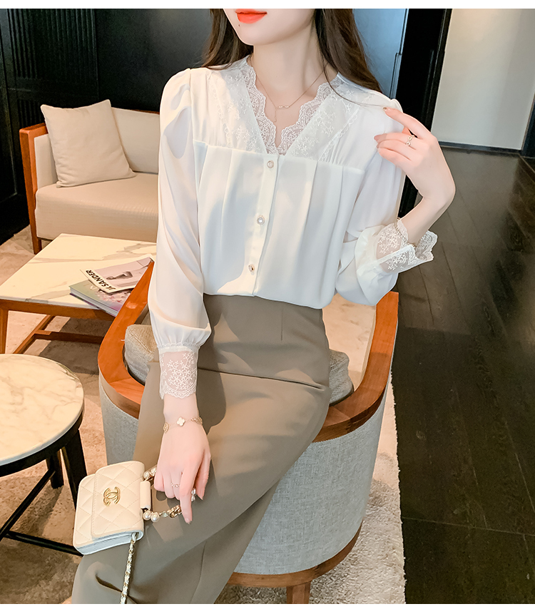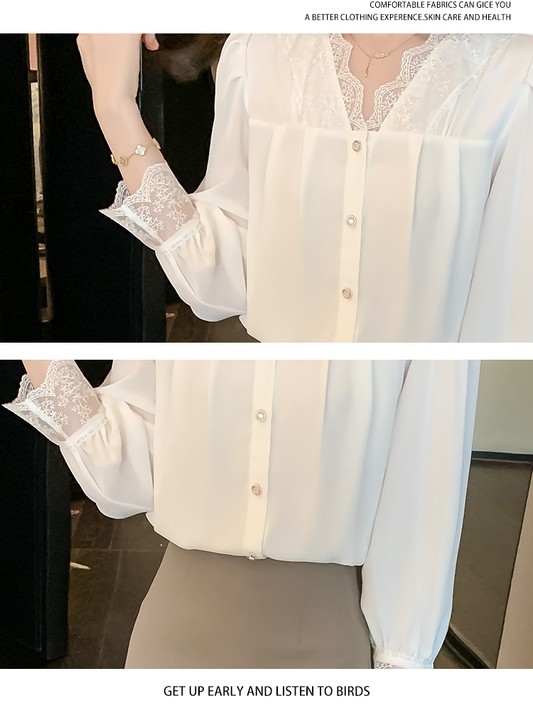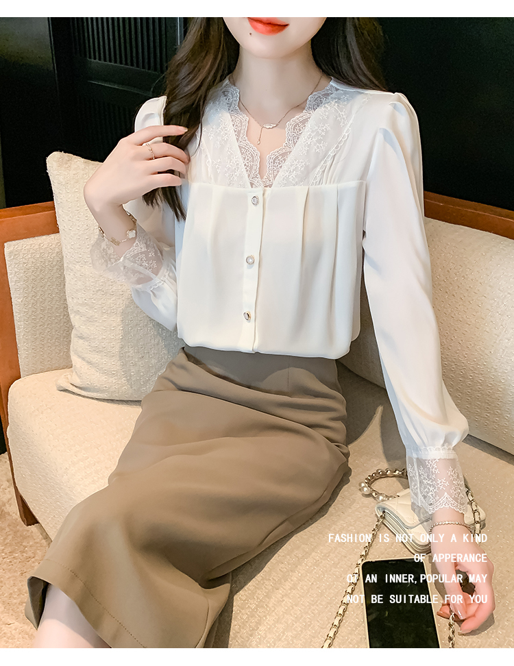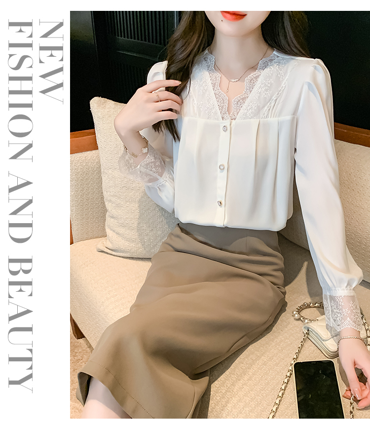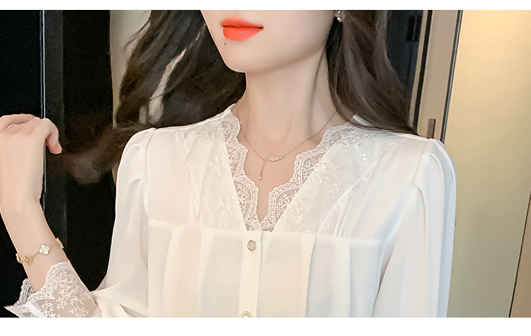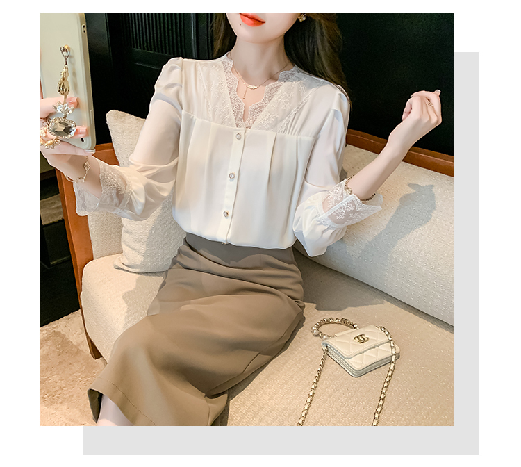 限量特惠|氣質V領拼接蕾絲抓褶雪紡衫(02M2549)