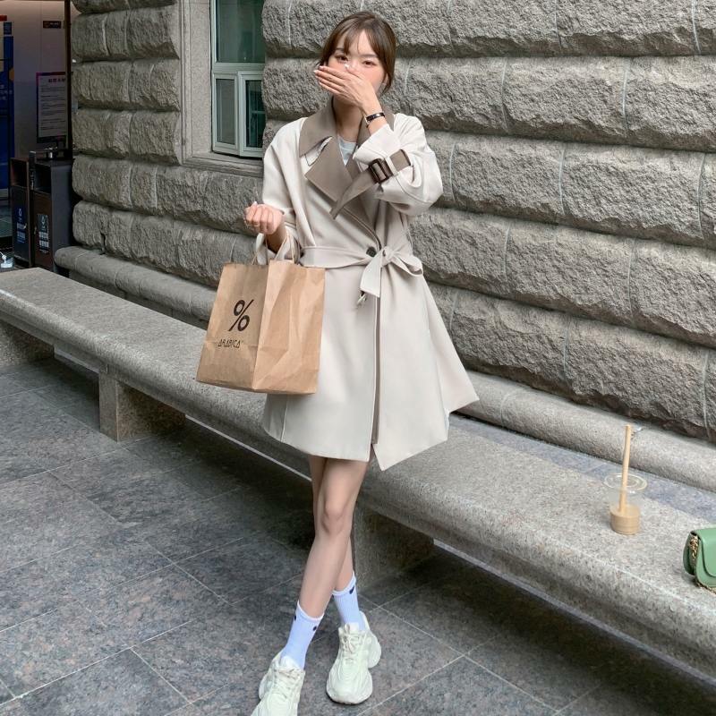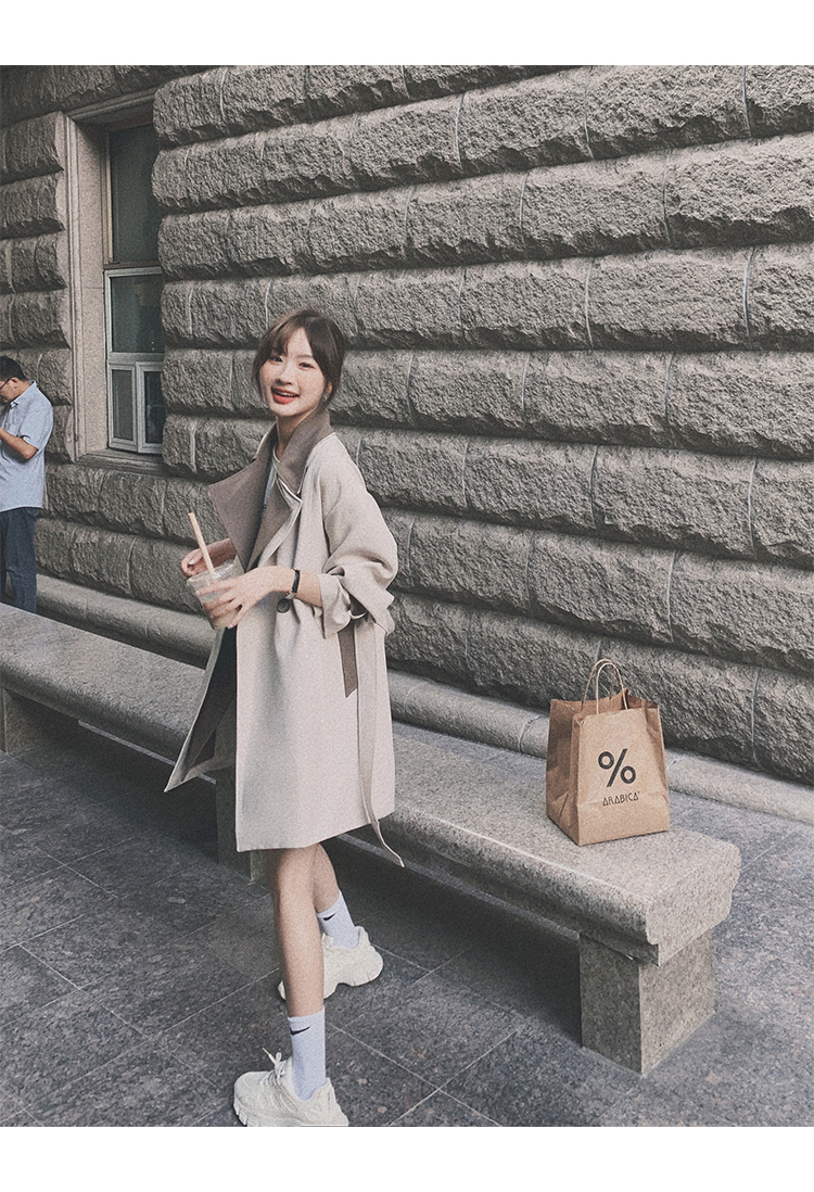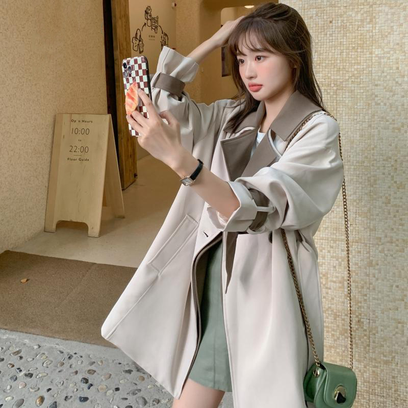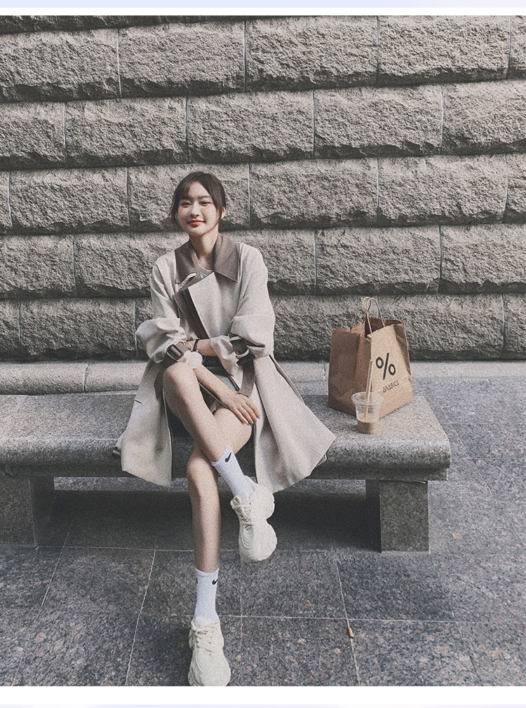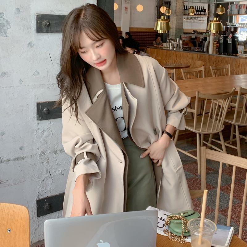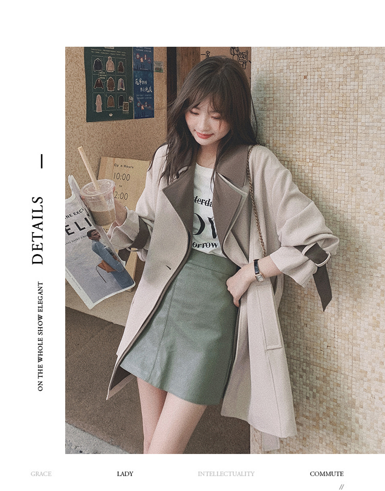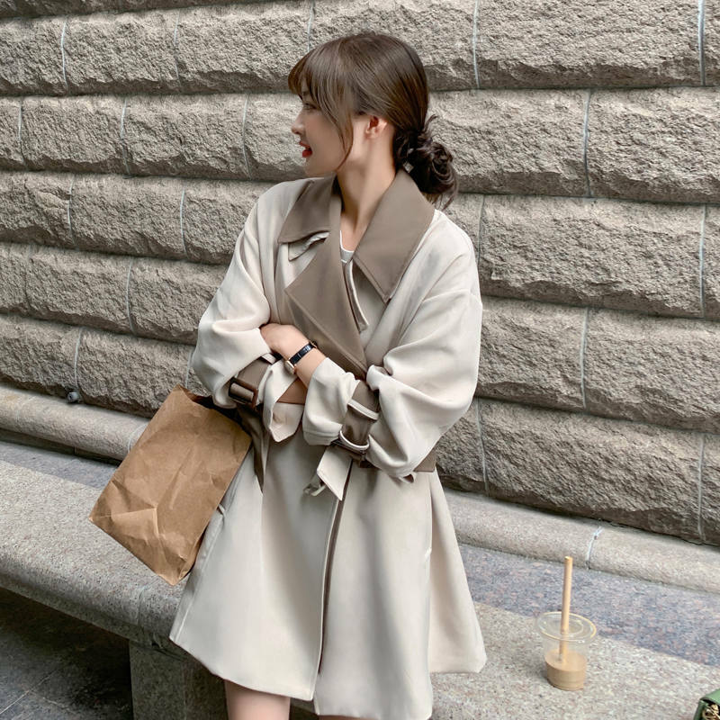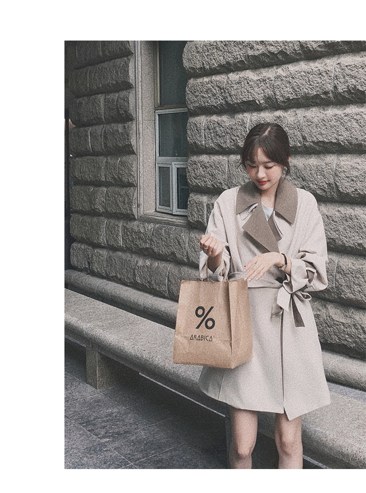 獨家訂製│氣質知性撞色雙層翻領造型繫帶假兩件式風衣外套(02TA0226)
