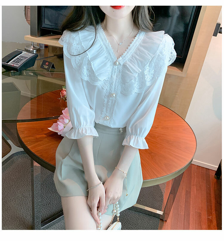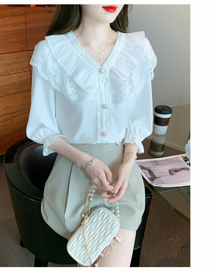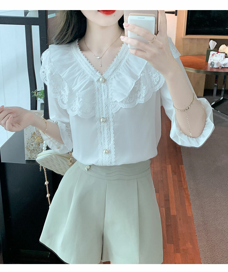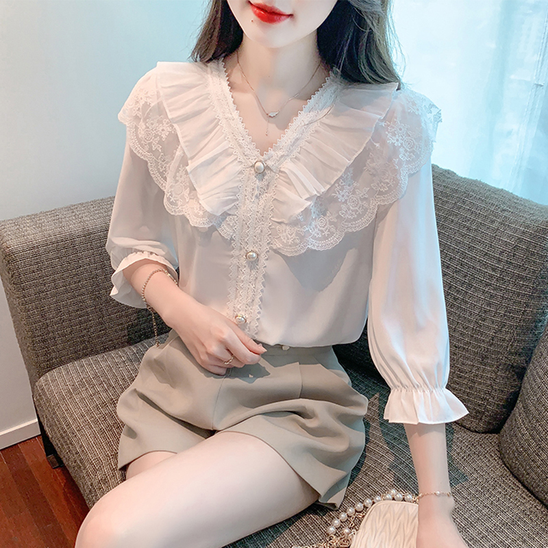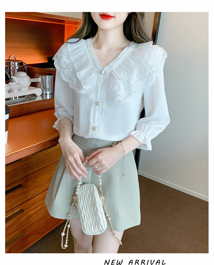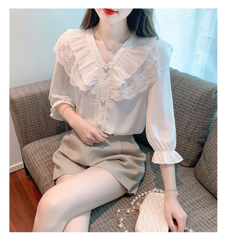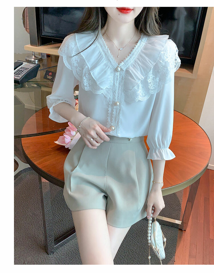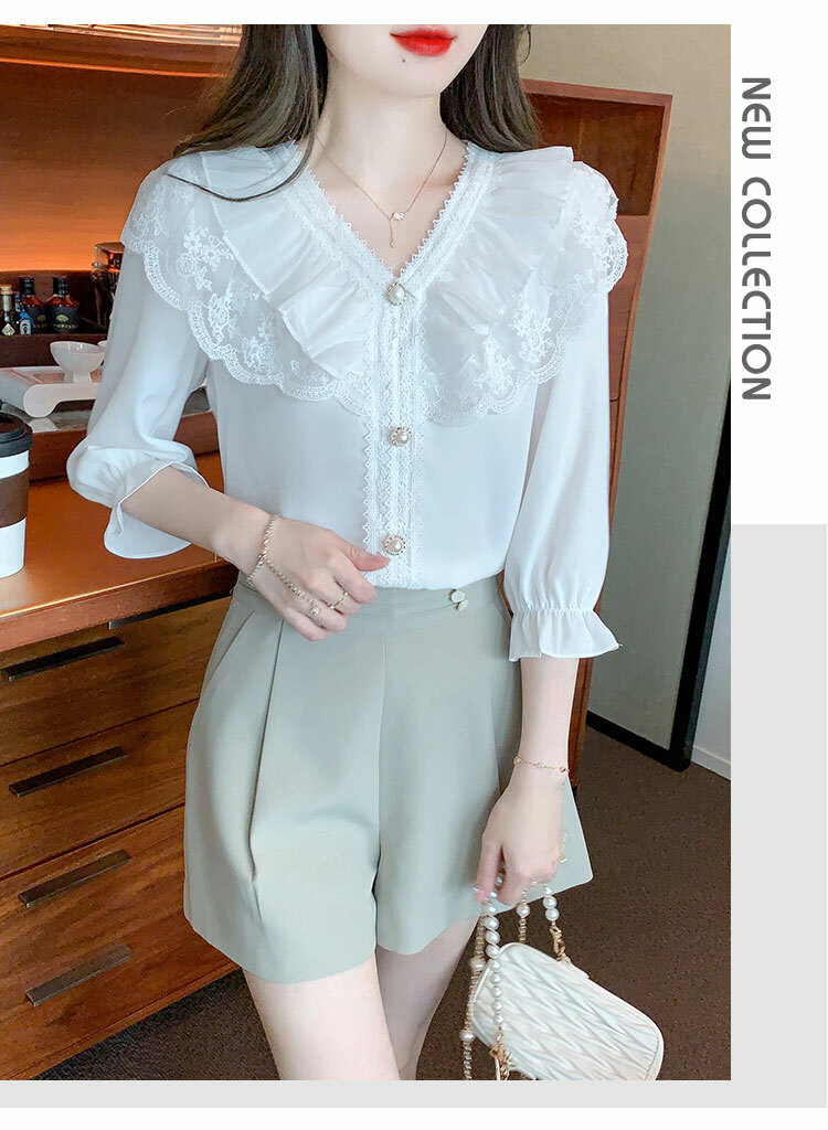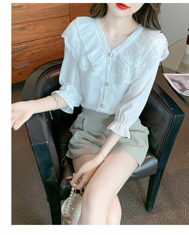 限量特惠|法式蕾絲荷葉邊拼接V領雪紡衫(03H3140)