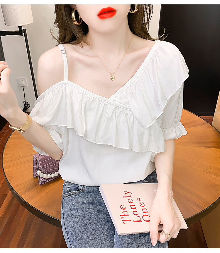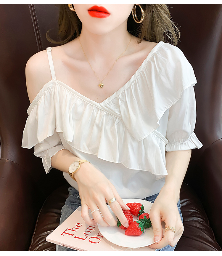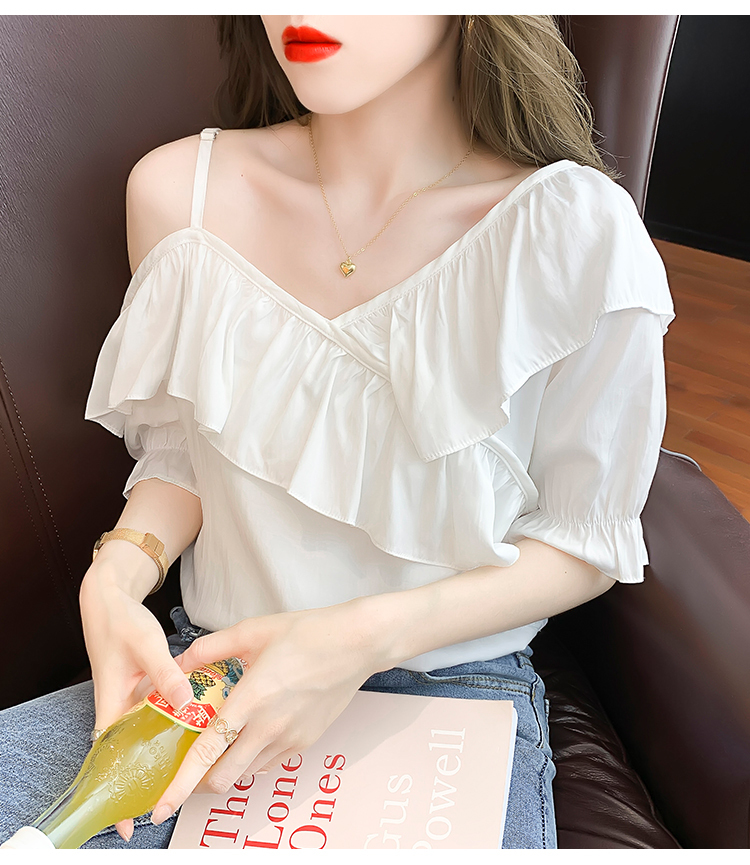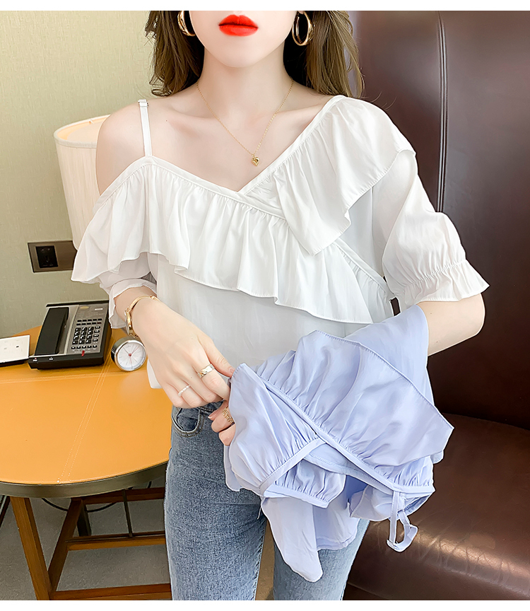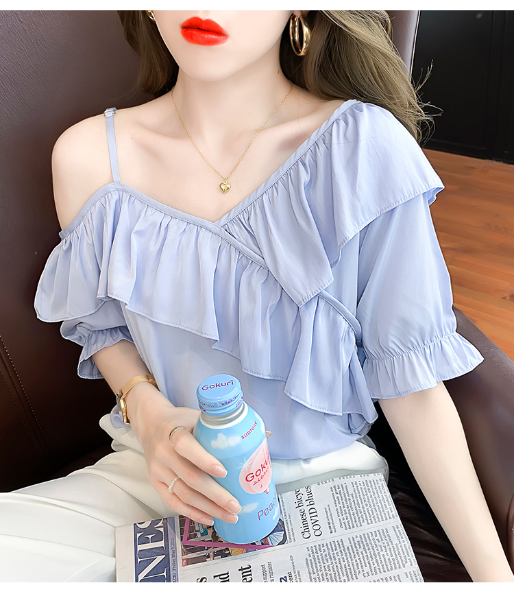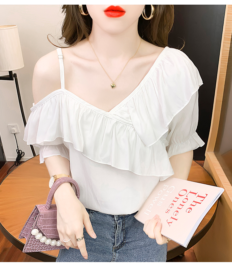 限量特惠|甜美不規則荷葉邊一字斜肩吊帶雪紡衫-2色(03H3175)