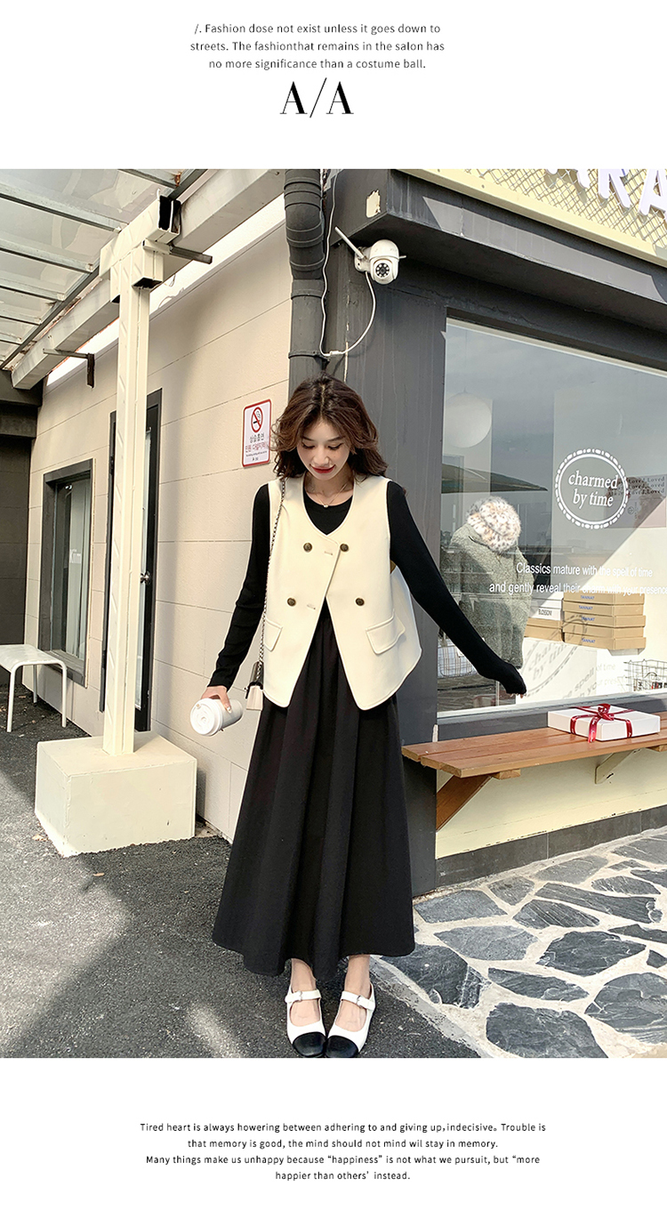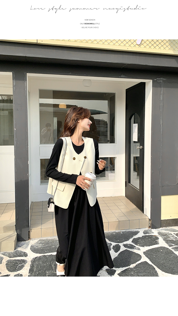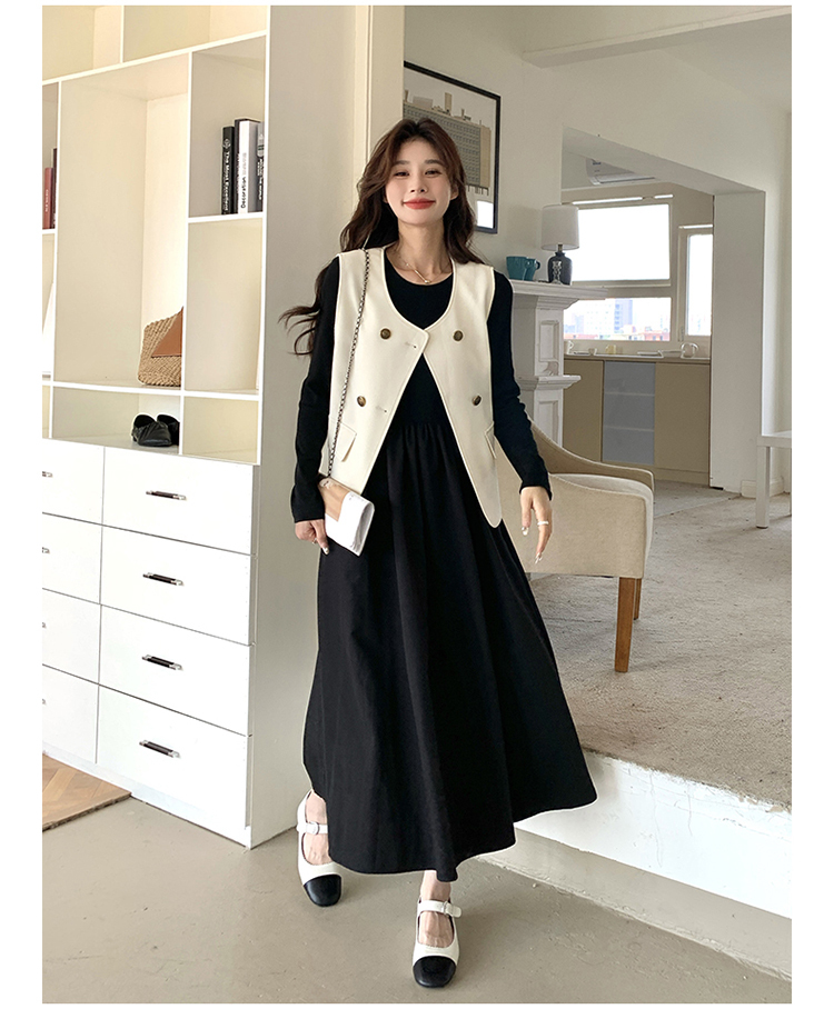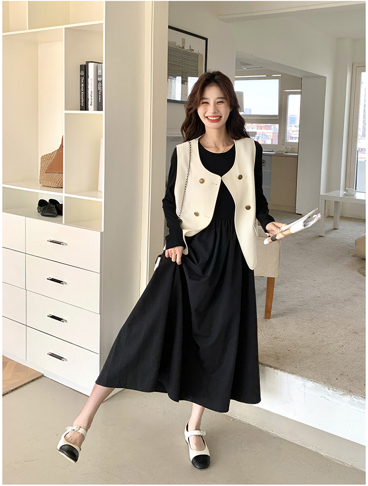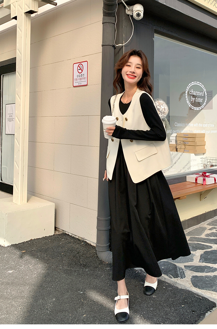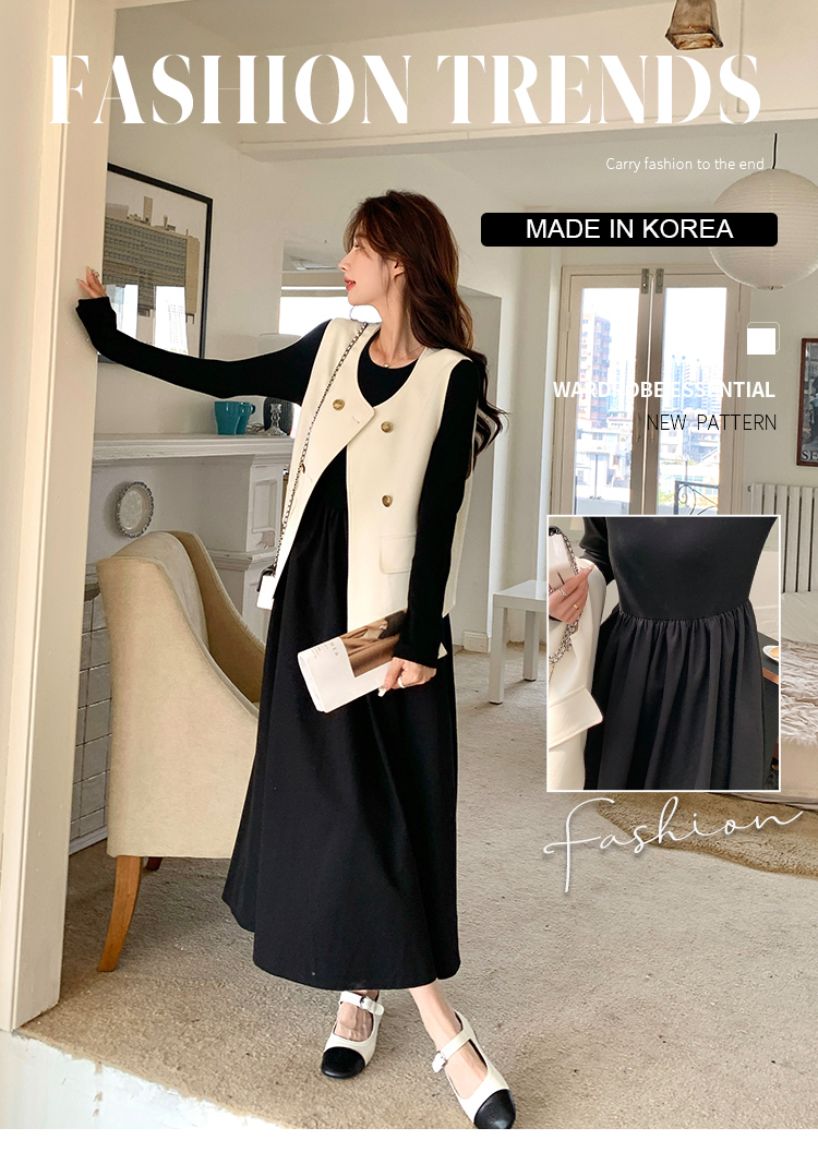 獨家訂製│韓系甜姐兒雙排釦背心+收腰連衣裙兩件式套裝組(03H6042)