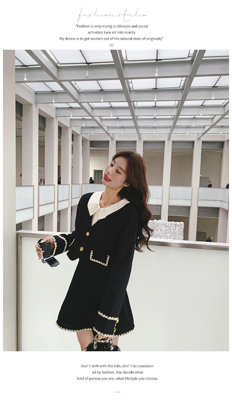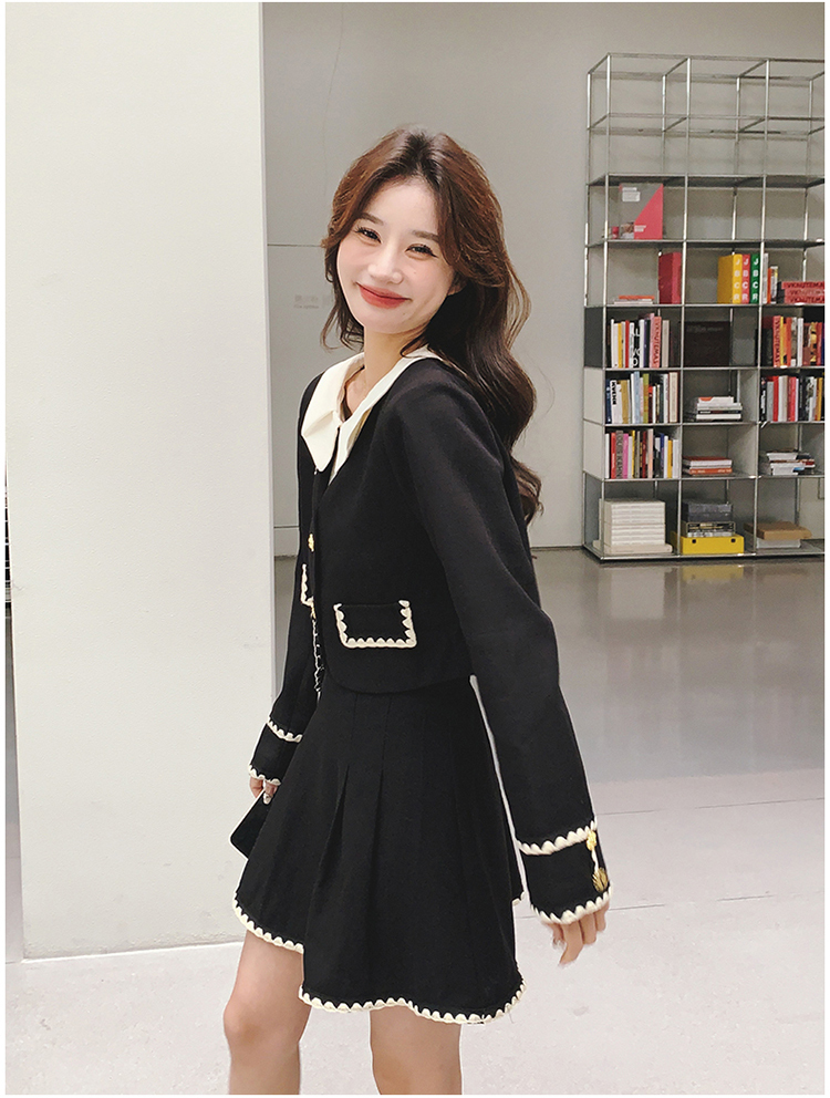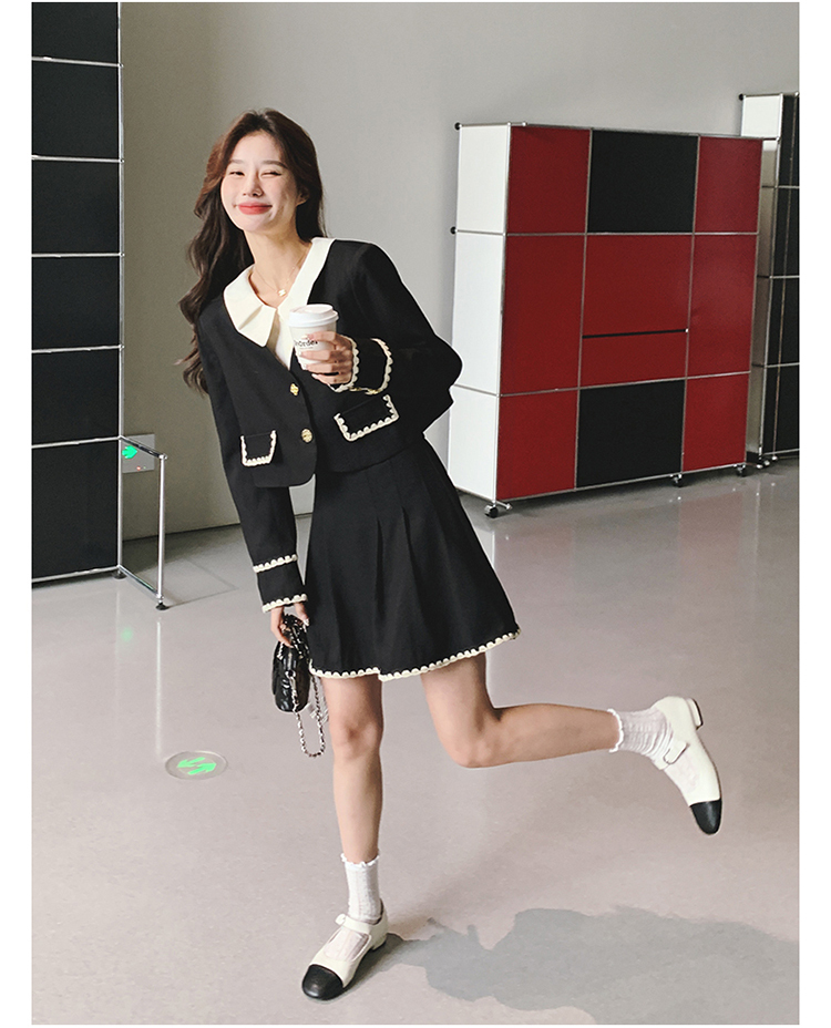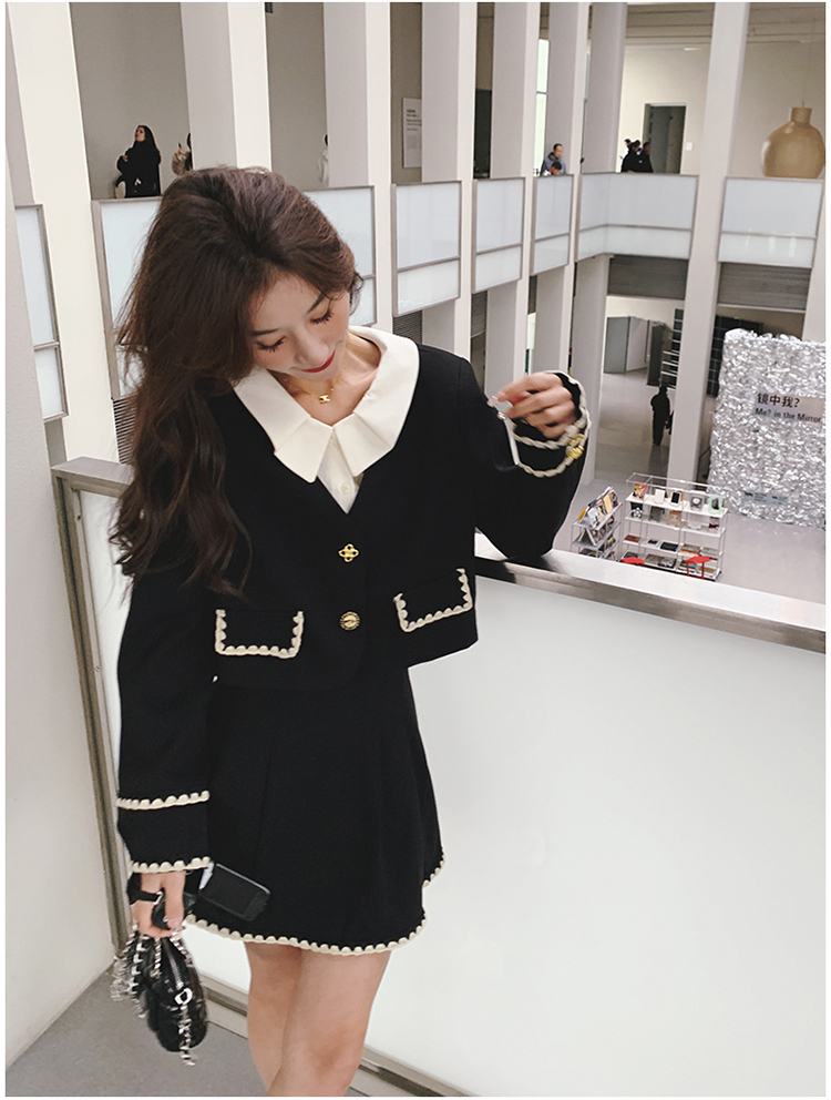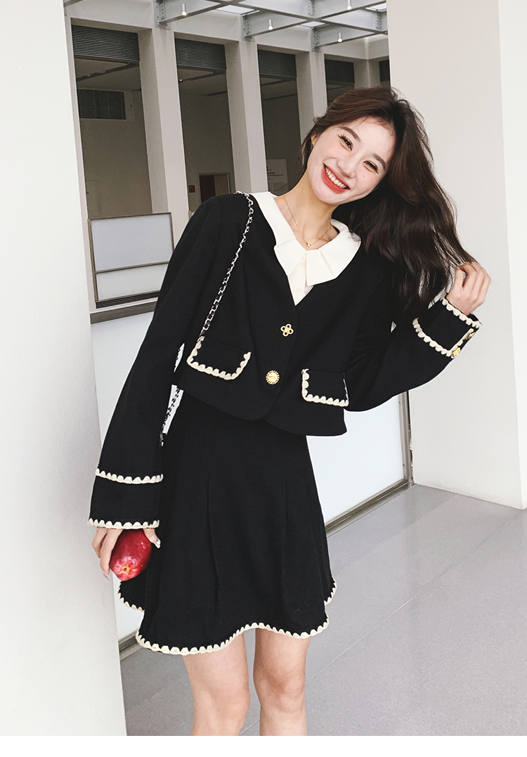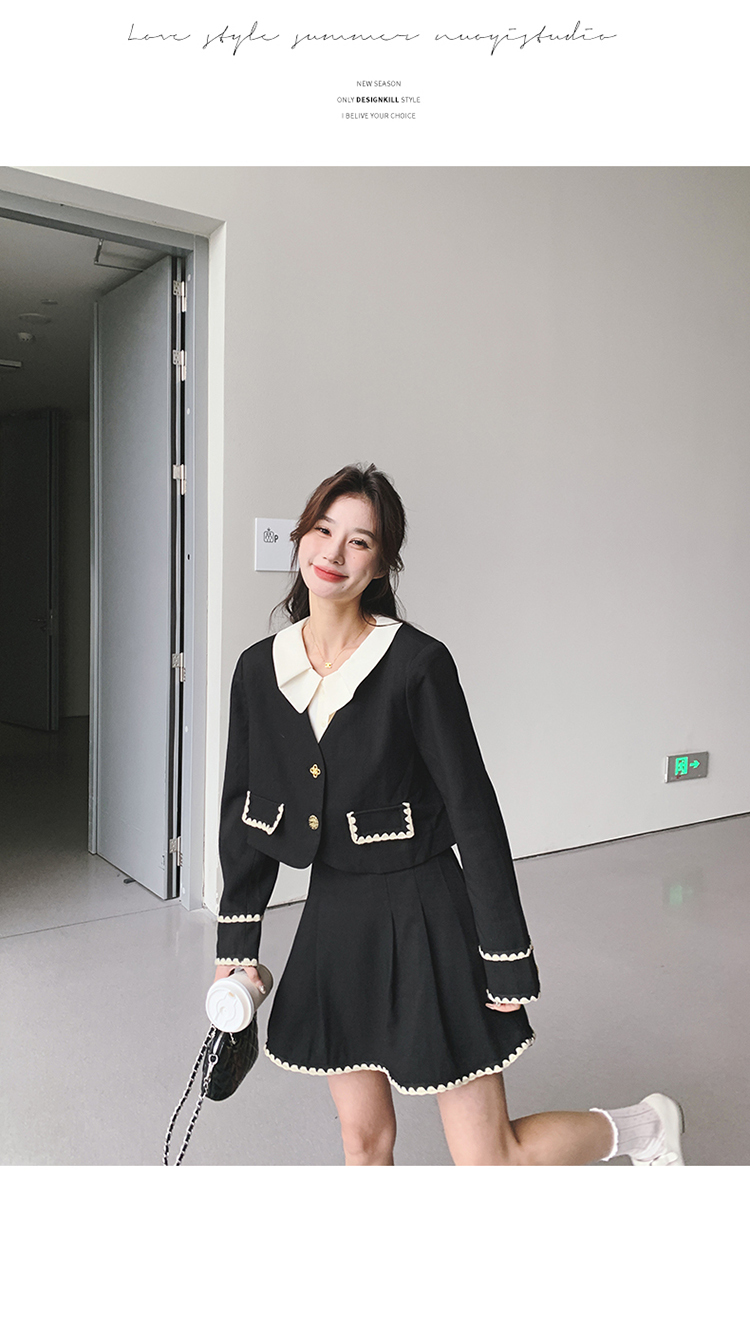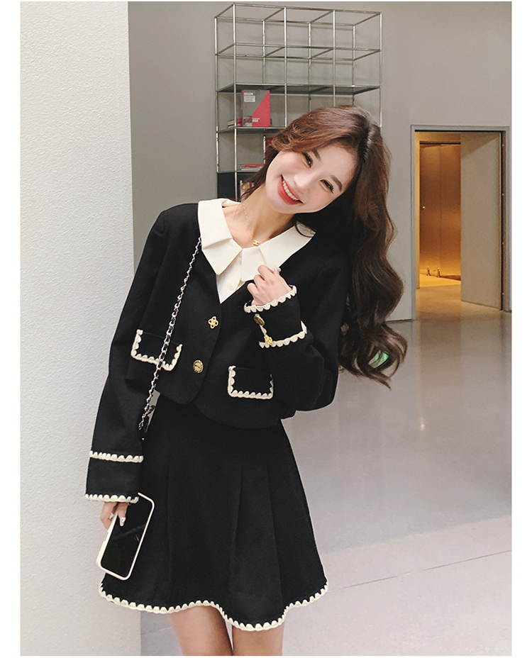 獨家訂製│韓系小香風撞色拼接假兩件式上衣+短裙兩件式套裝組(03H6080)