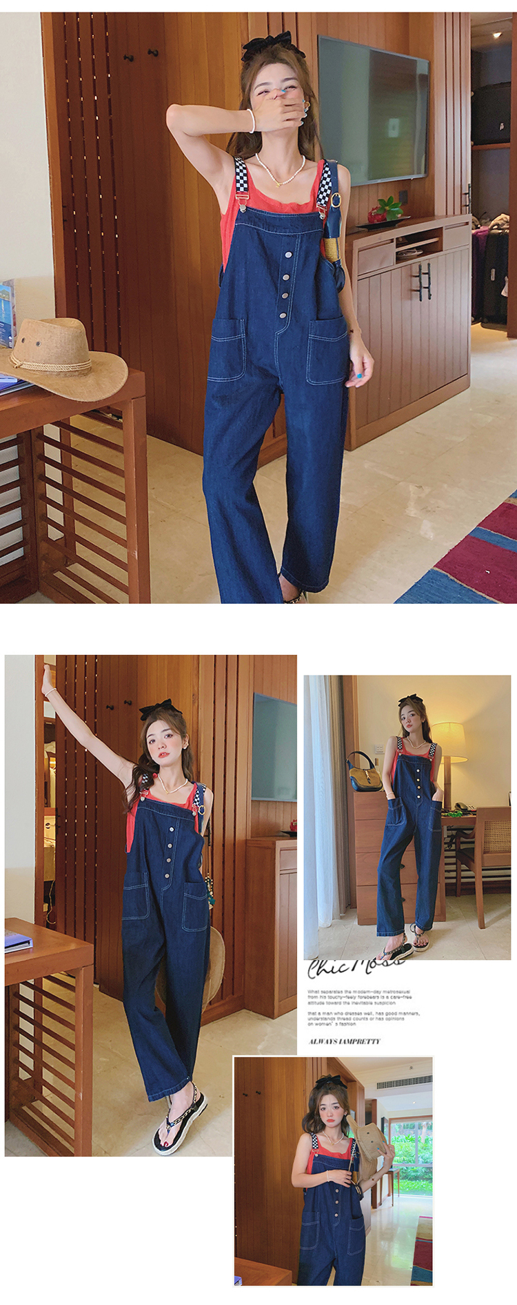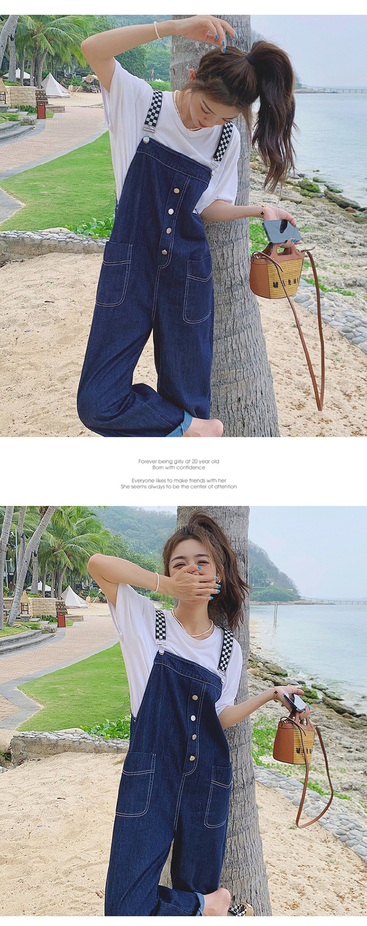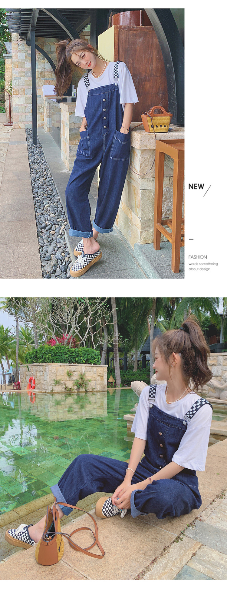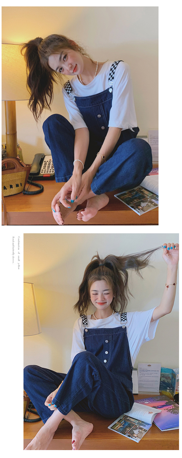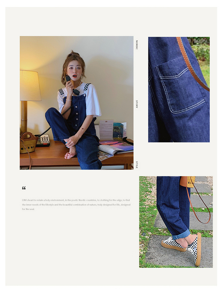 獨家訂製│韓系甜酷風棋盤格肩帶排釦造型吊帶褲(03H6134)