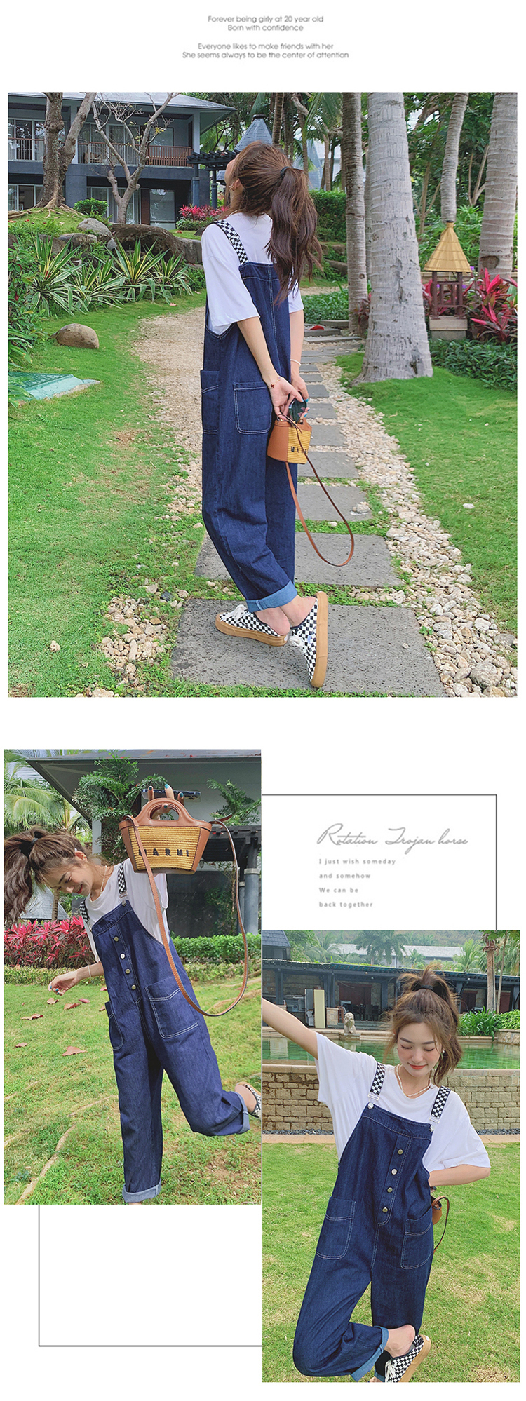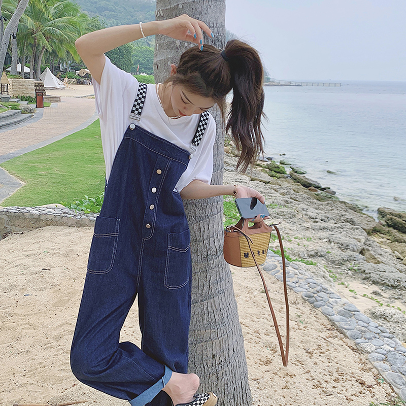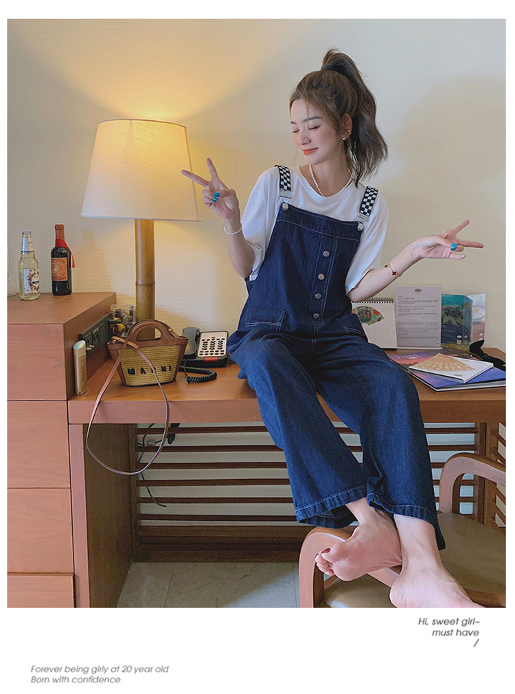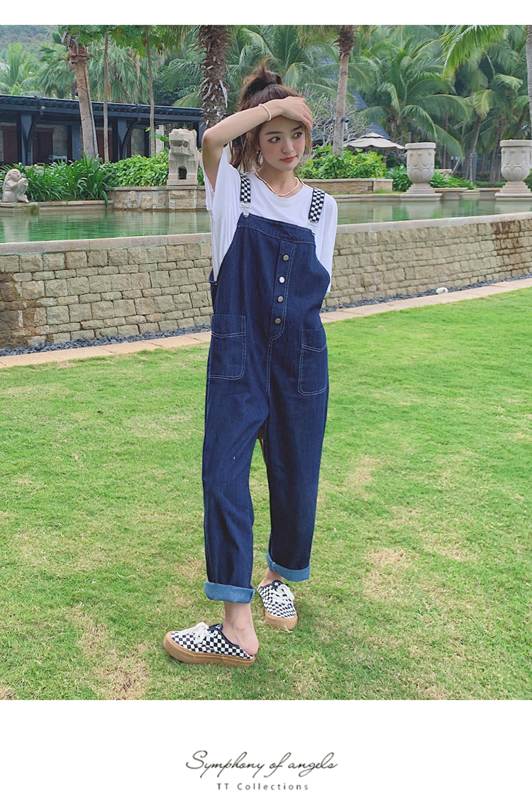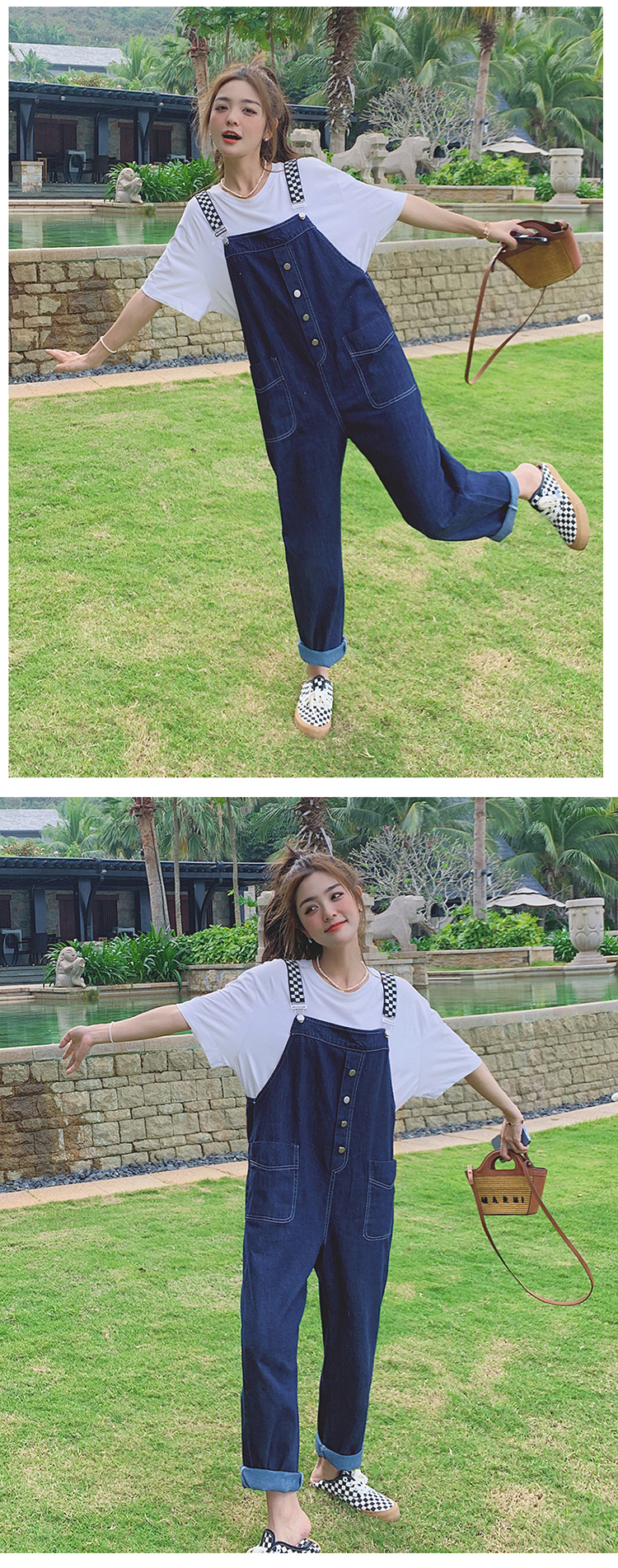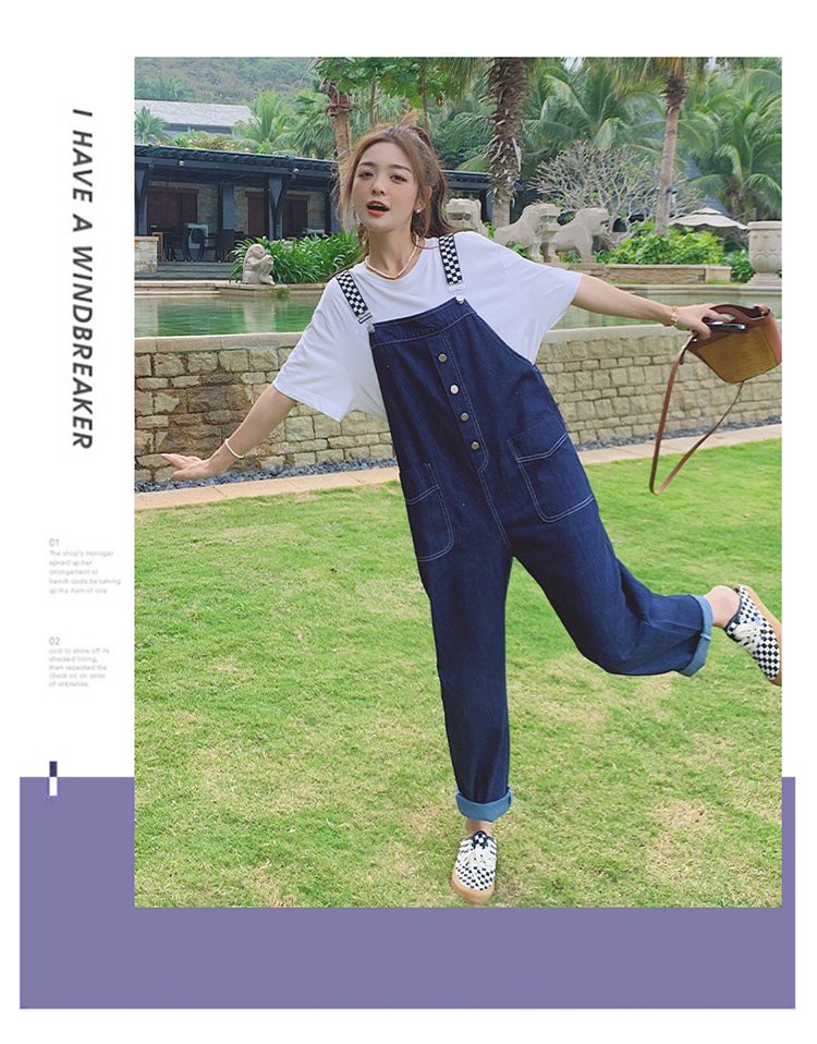 獨家訂製│韓系甜酷風棋盤格肩帶排釦造型吊帶褲(03H6134)