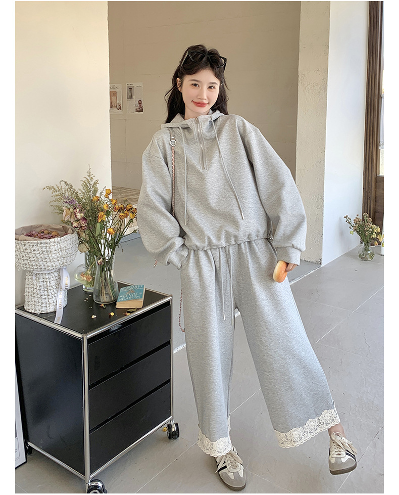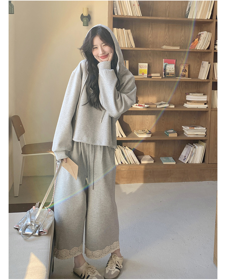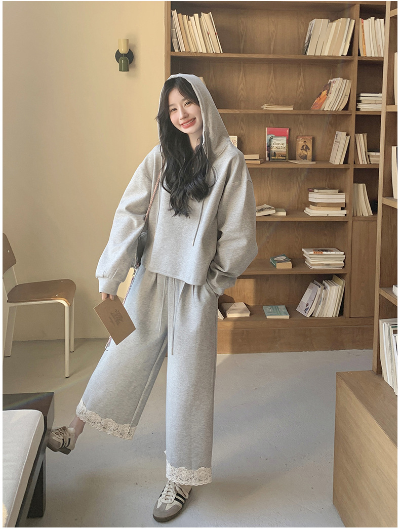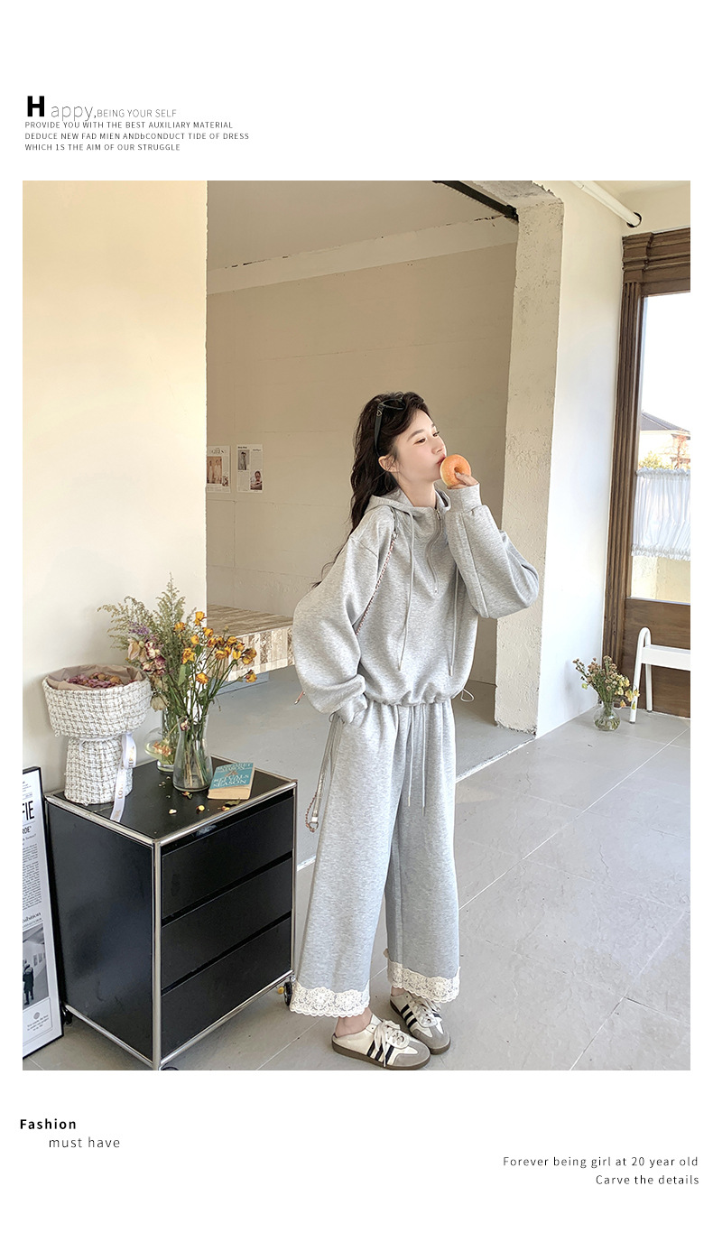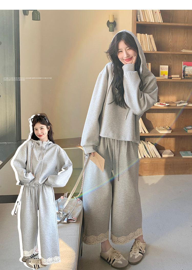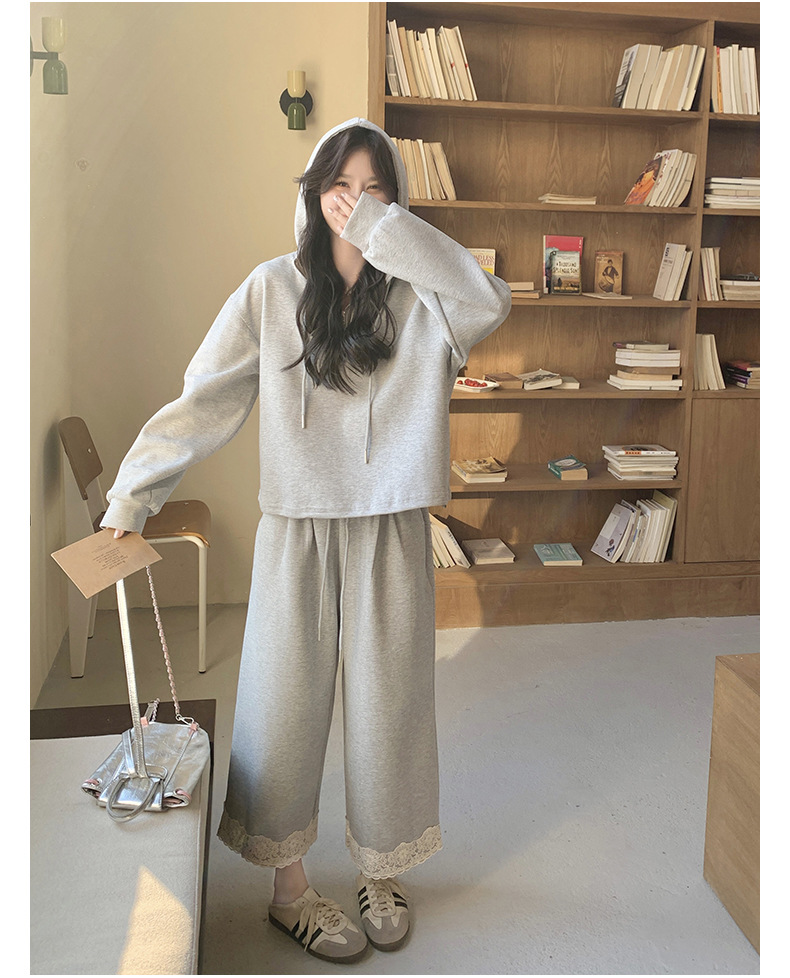 獨家訂製│2件式 韓系休閒感連帽上衣+蕾絲拼接造型闊腿褲(03H7939)