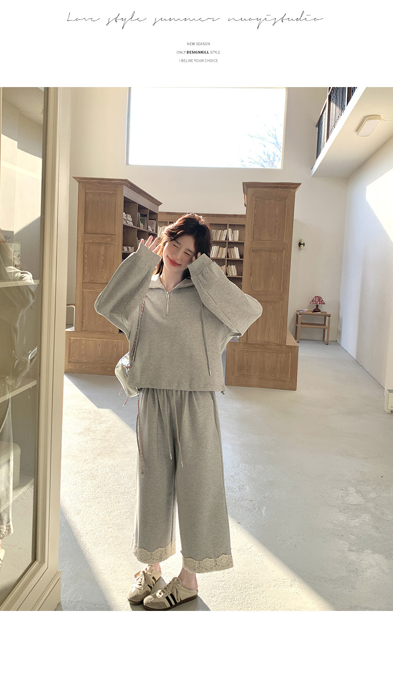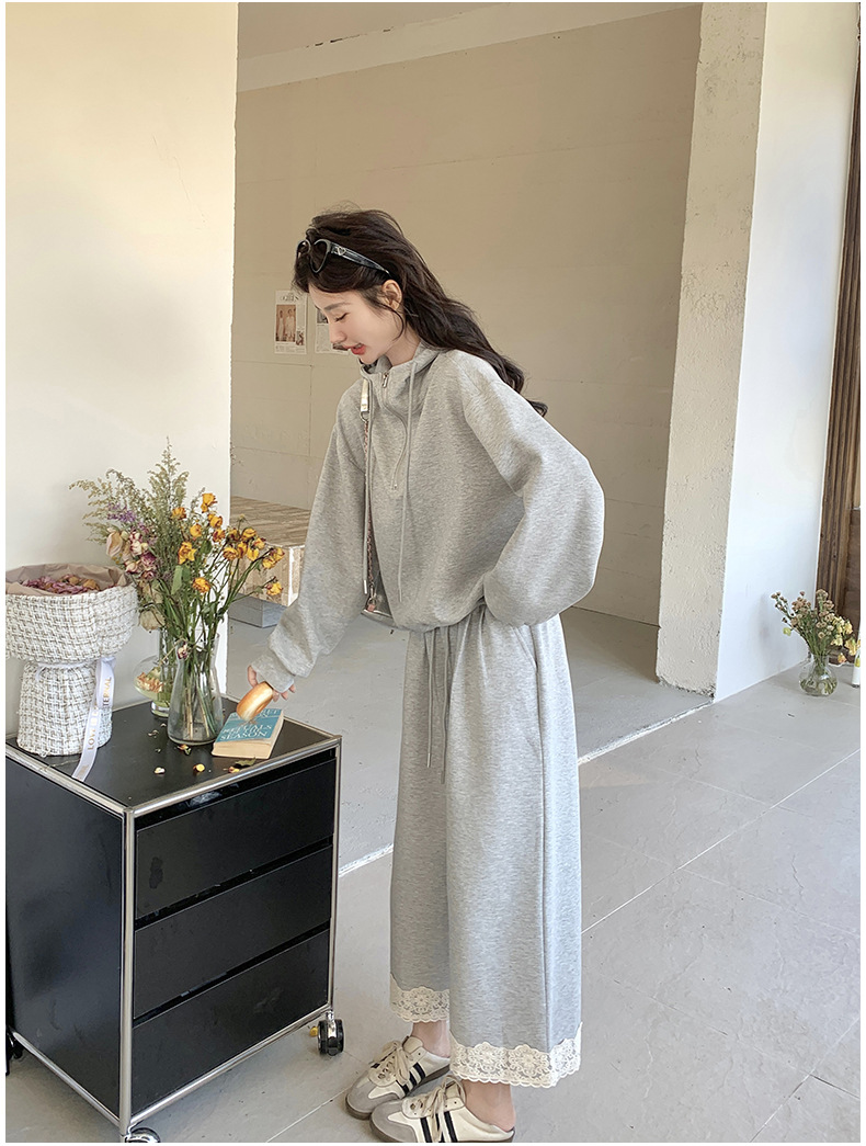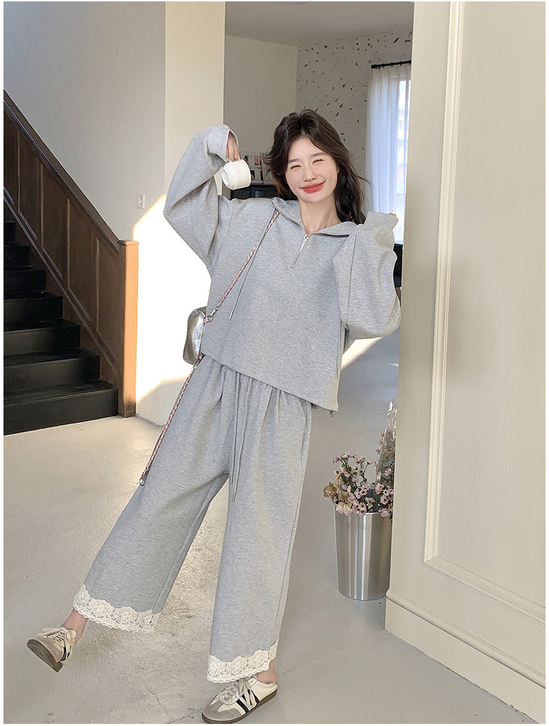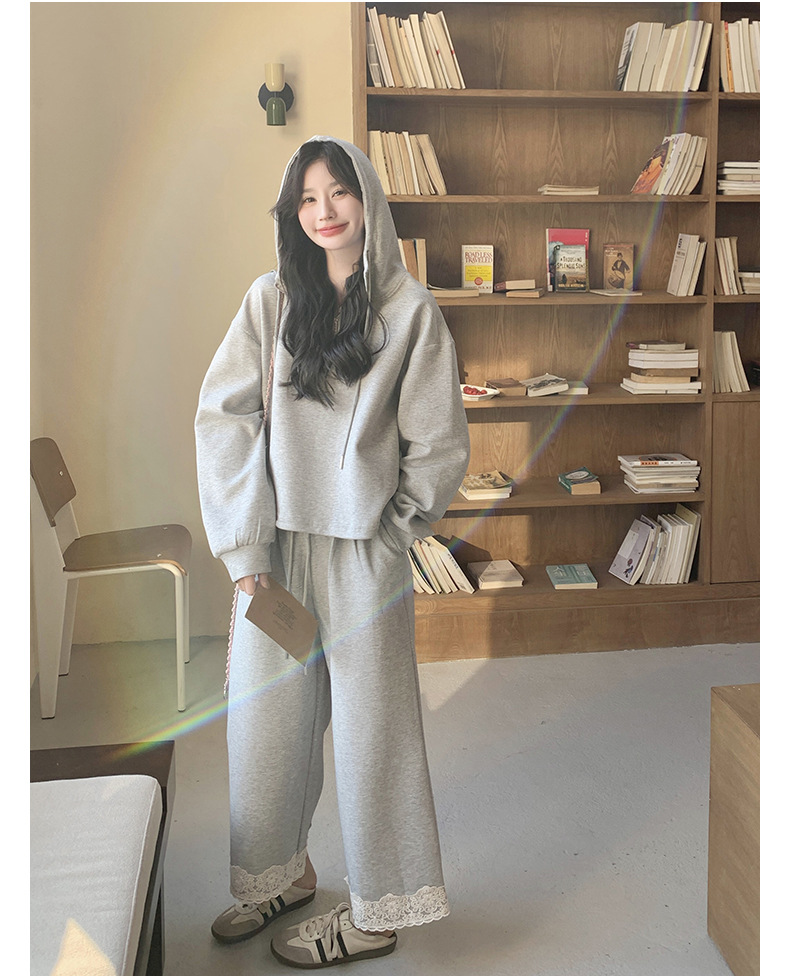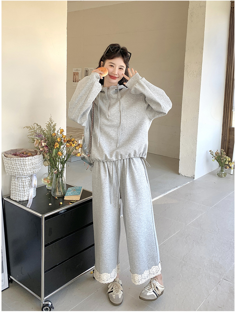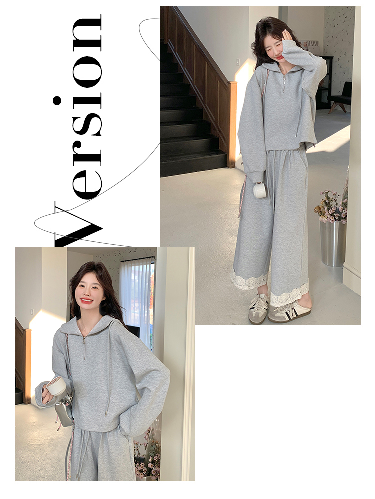 獨家訂製│2件式 韓系休閒感連帽上衣+蕾絲拼接造型闊腿褲(03H7939)