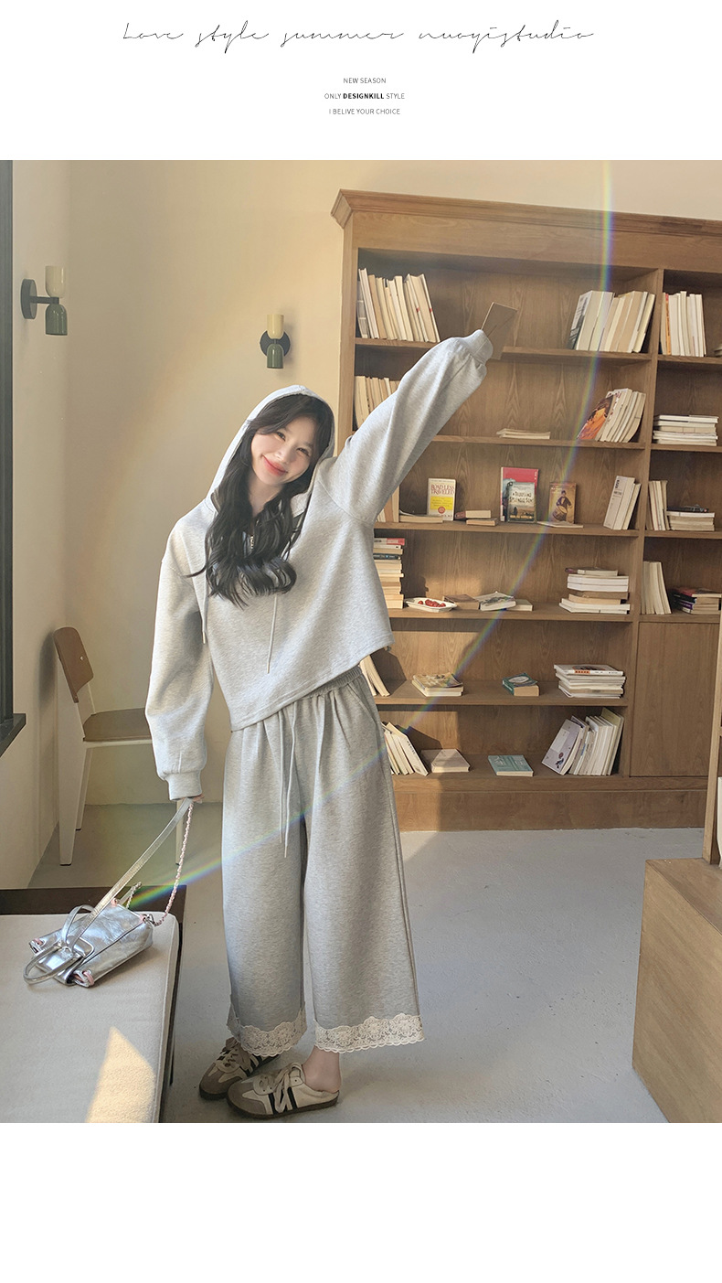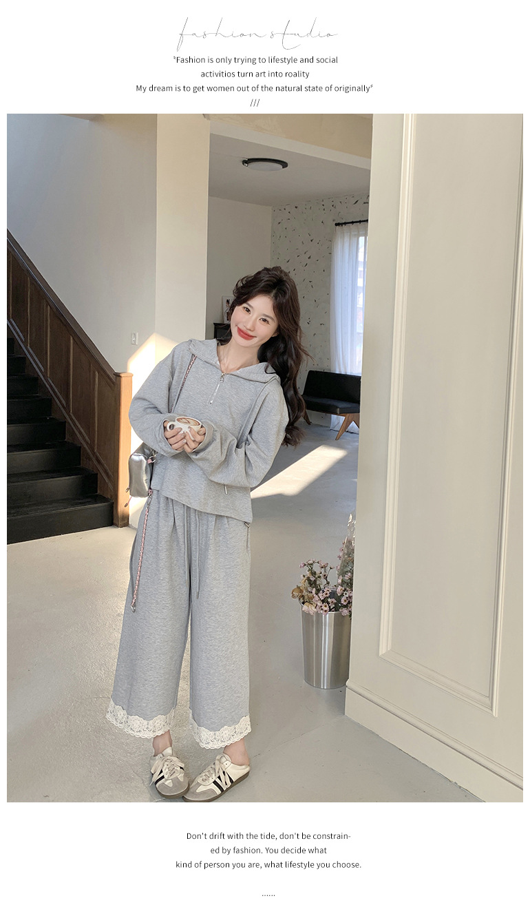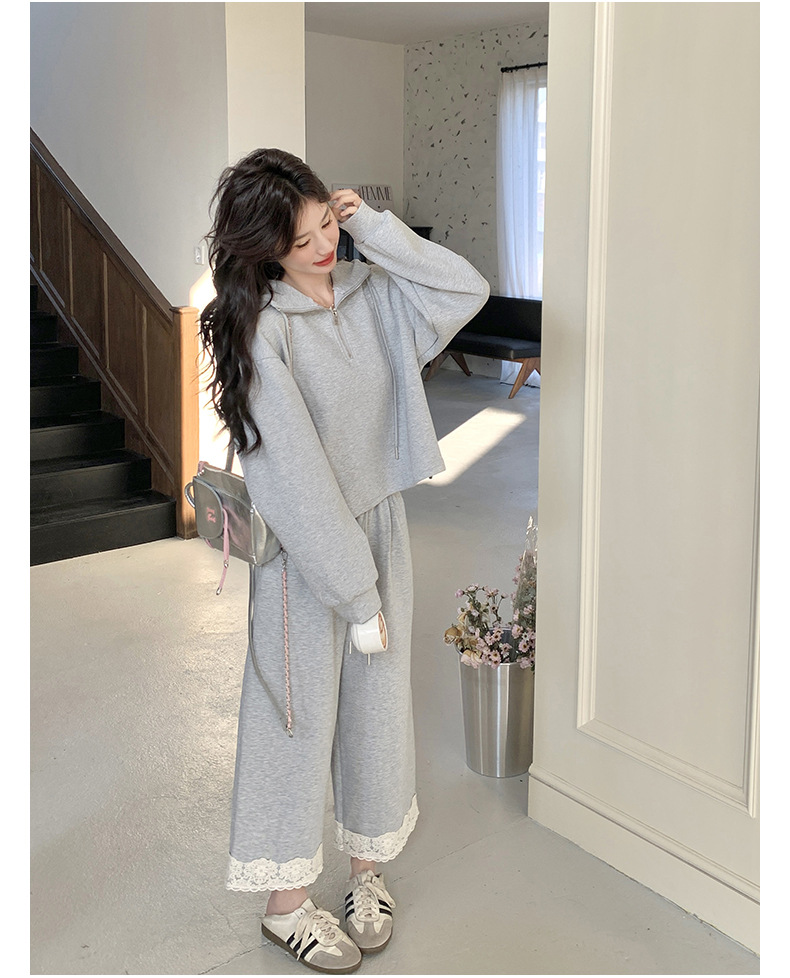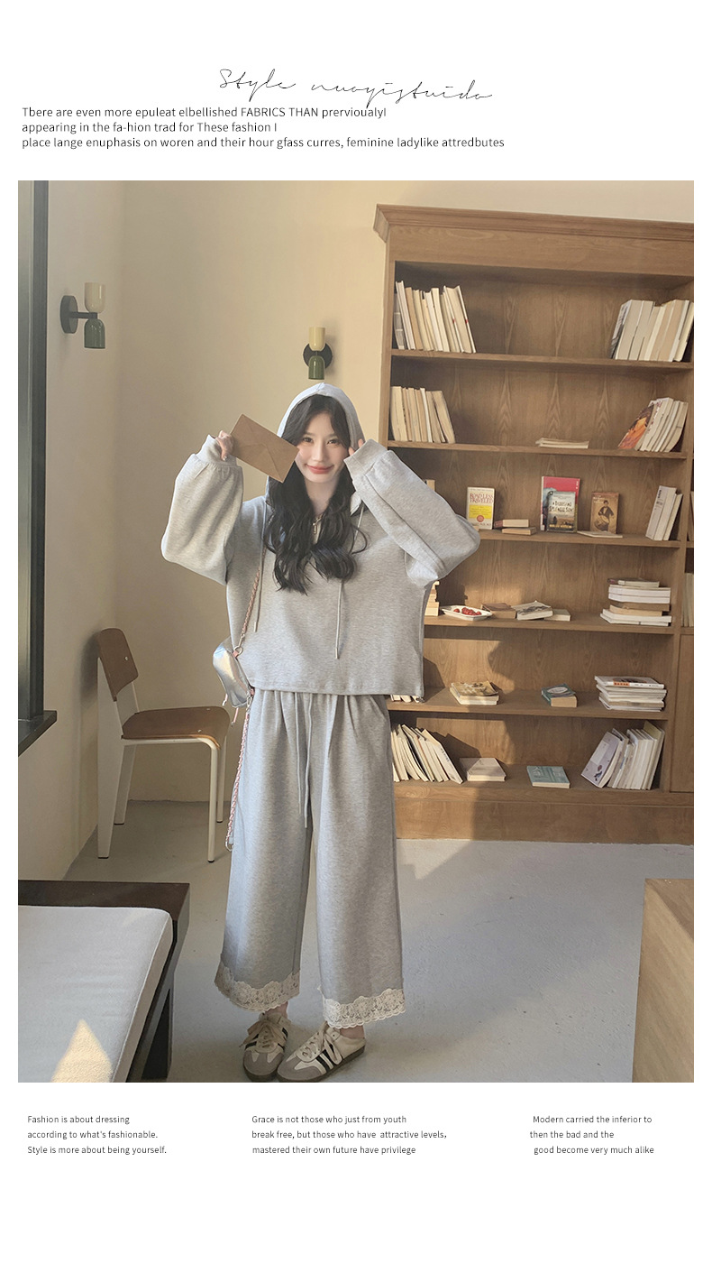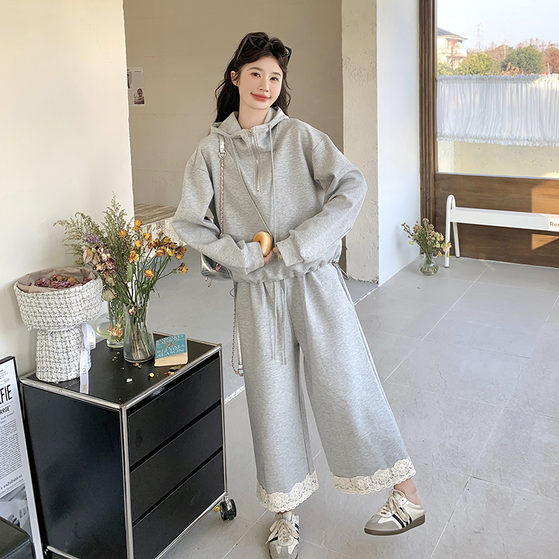 獨家訂製│2件式 韓系休閒感連帽上衣+蕾絲拼接造型闊腿褲(03H7939)