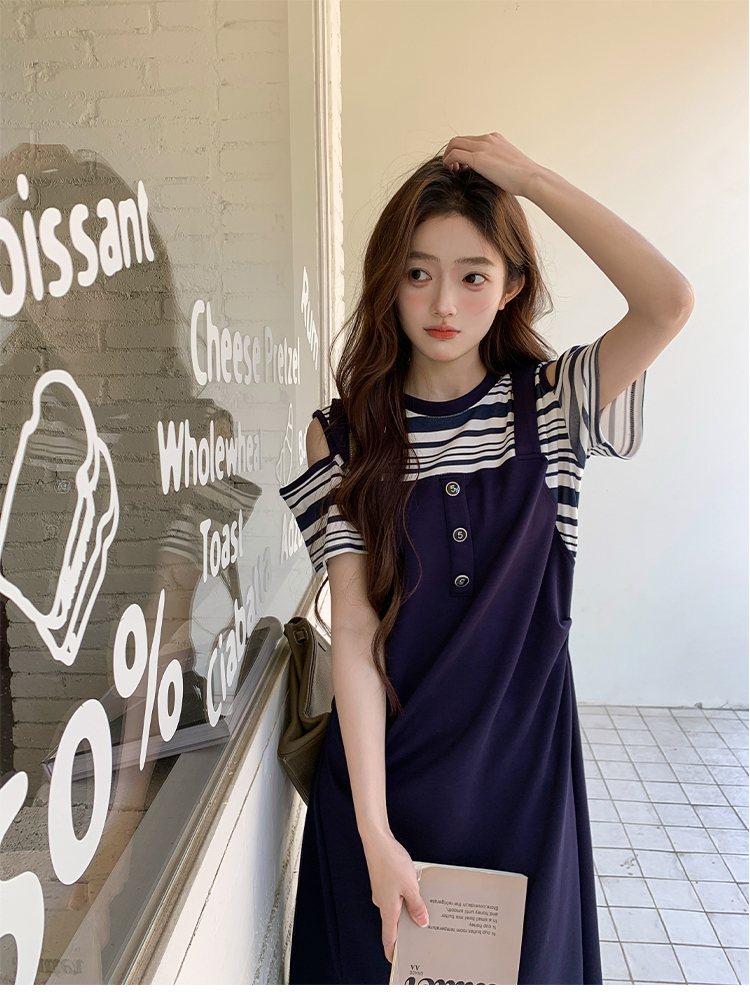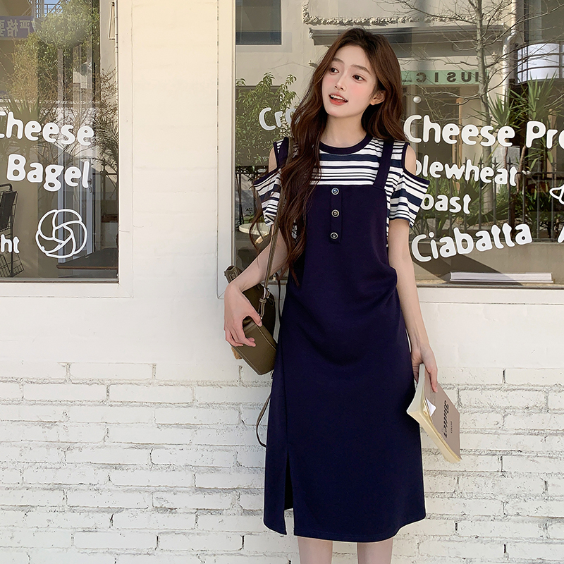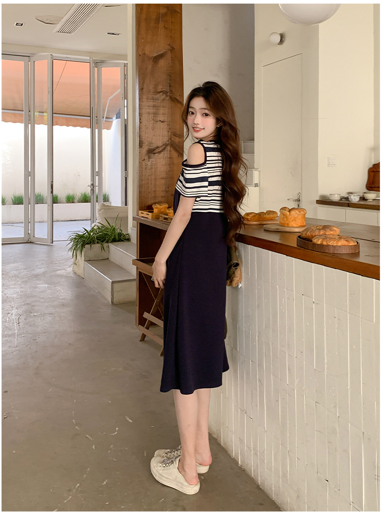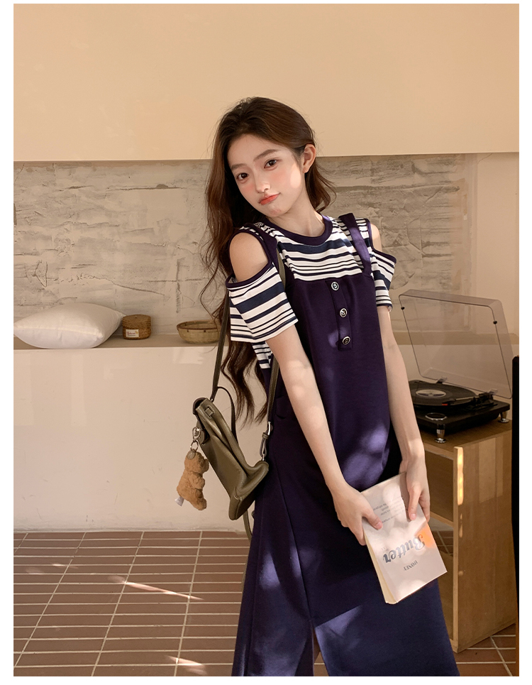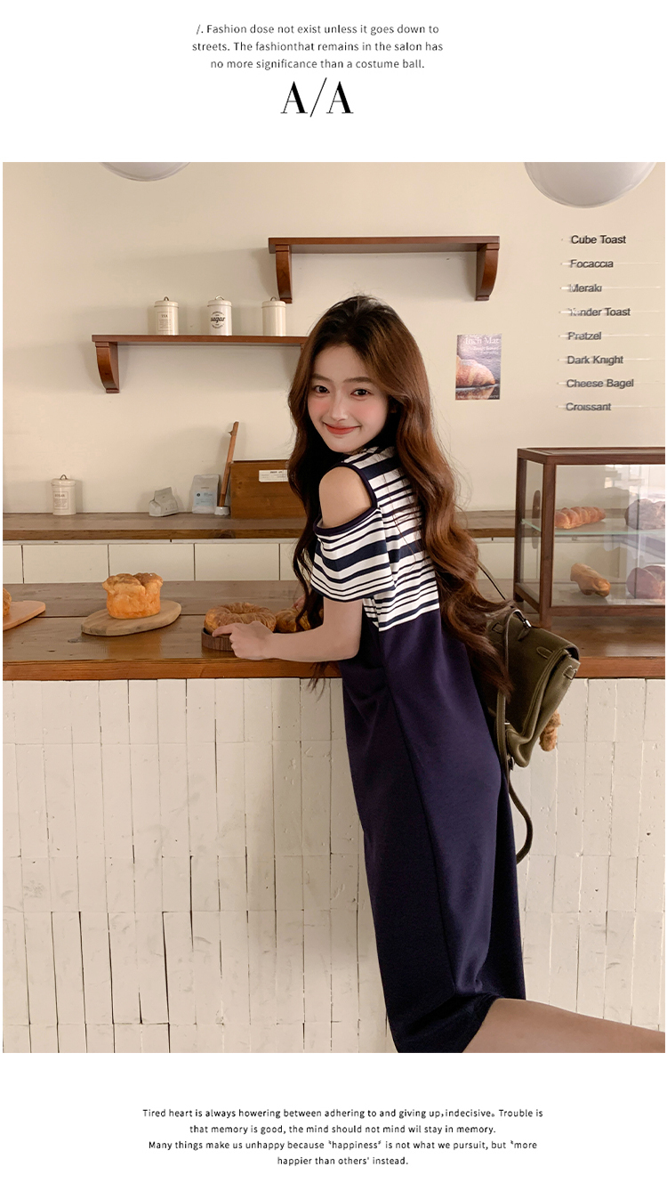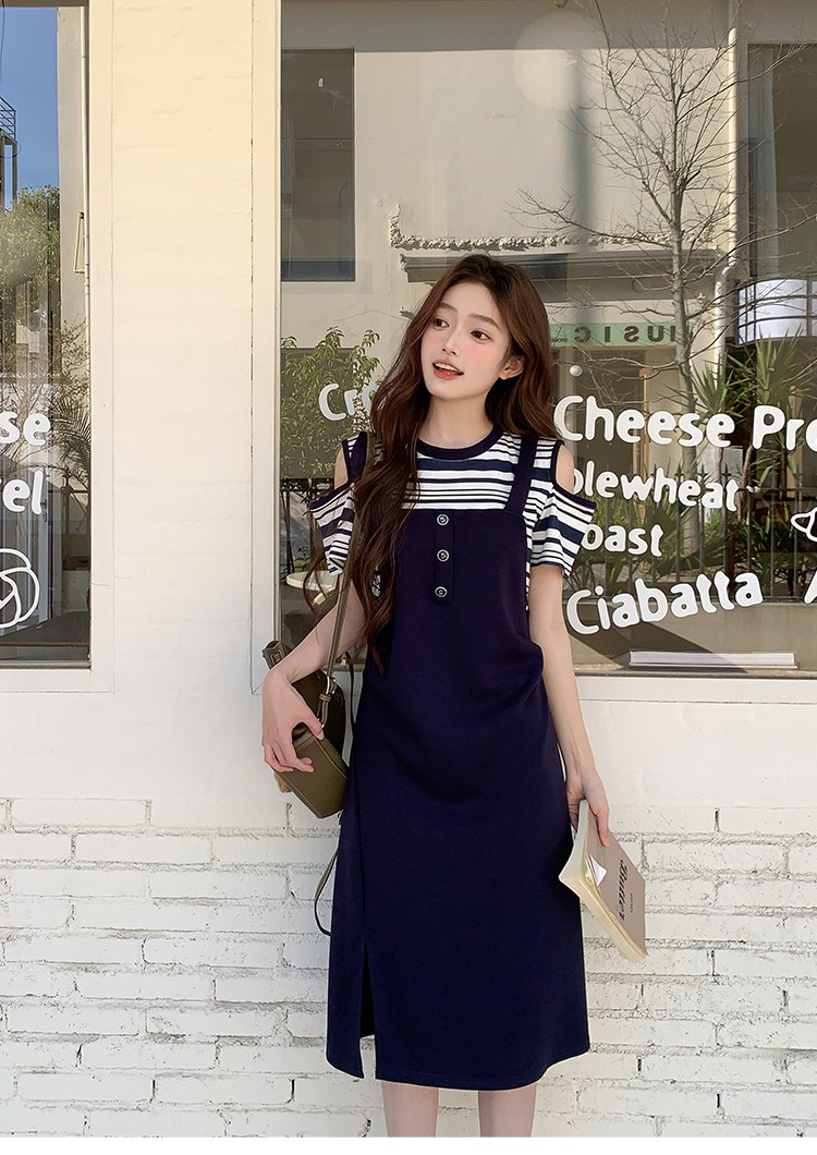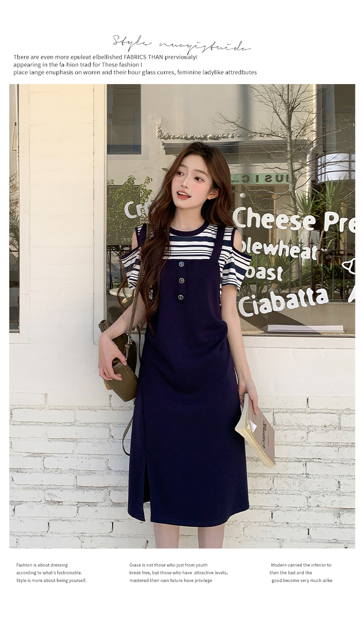 獨家訂製│假2件連衣裙 韓系微性感露肩條紋拼接連衣裙(04A1172)