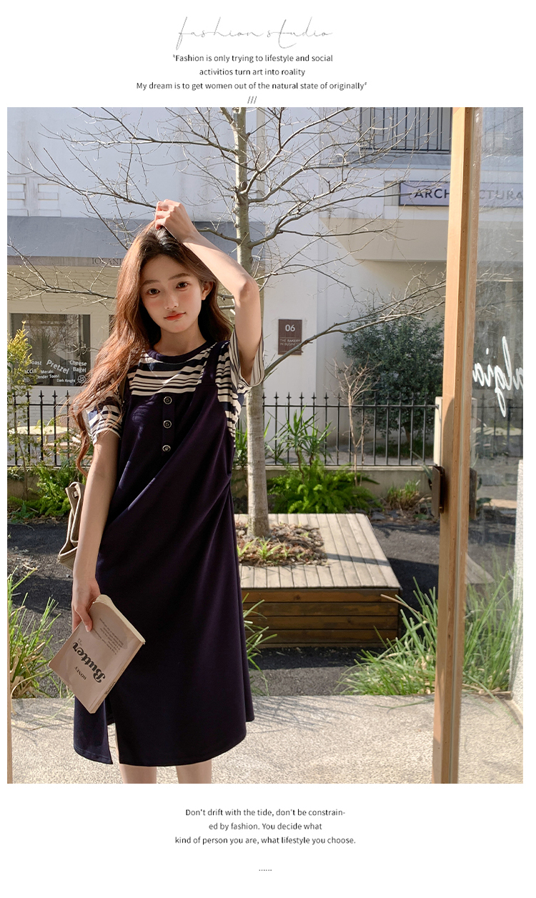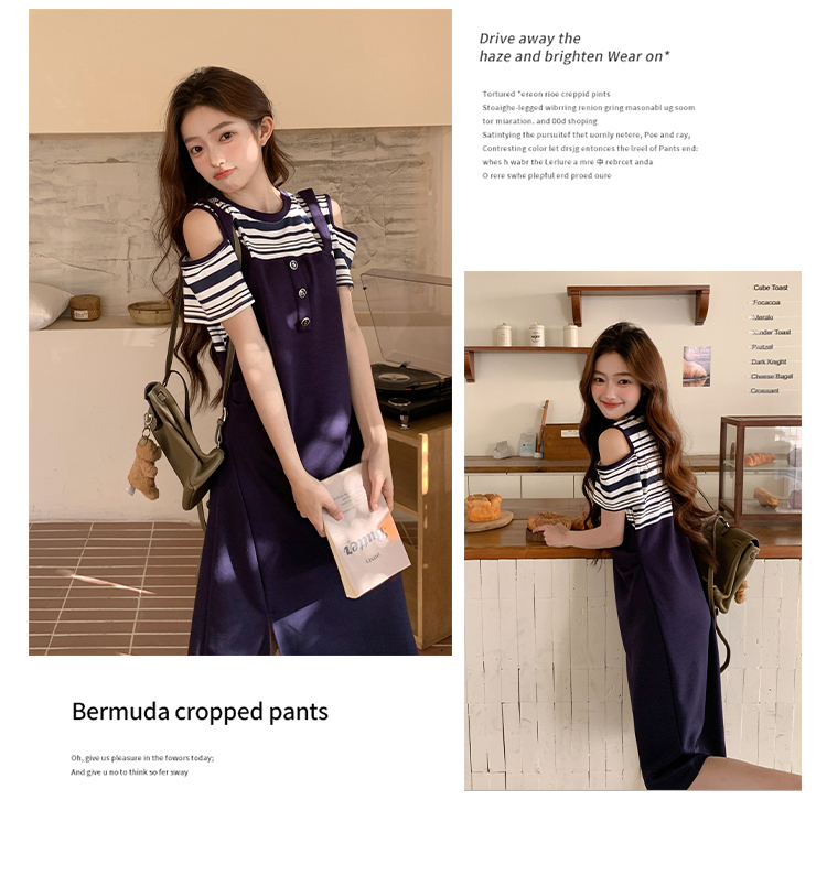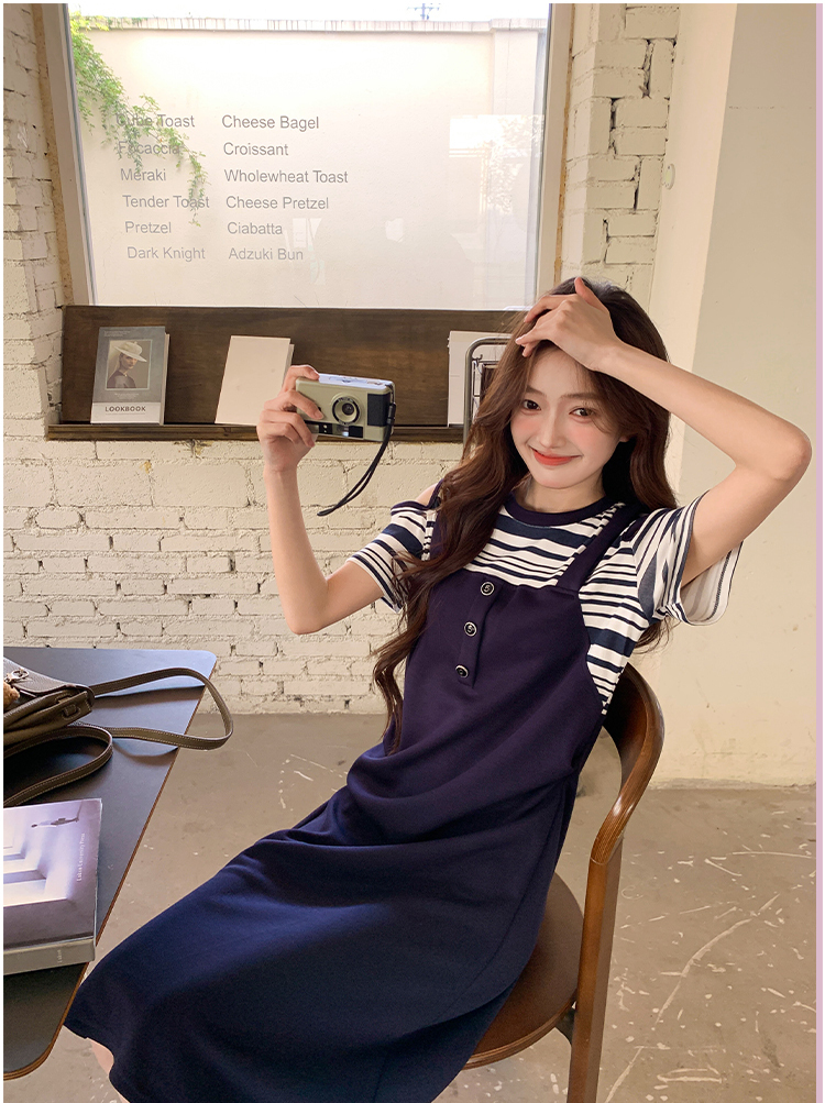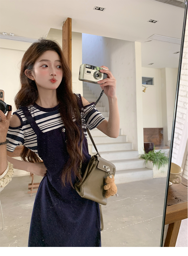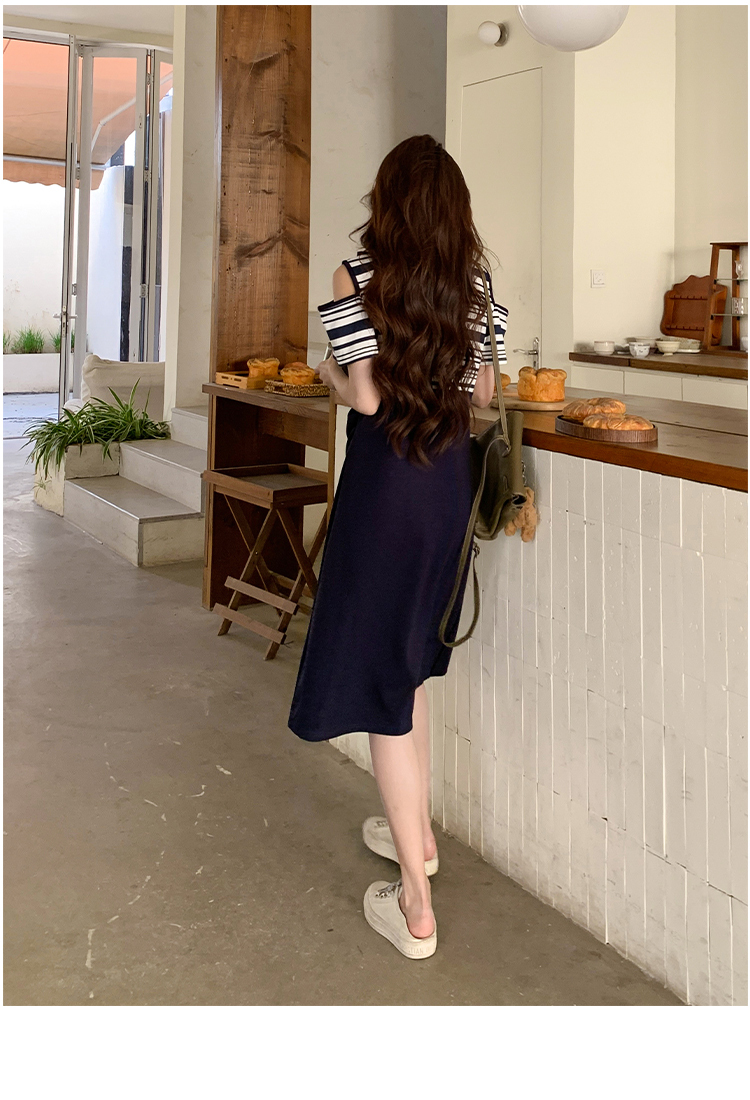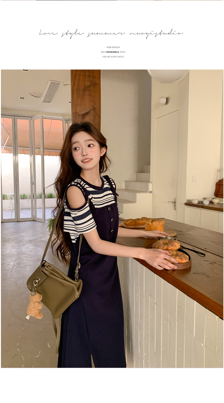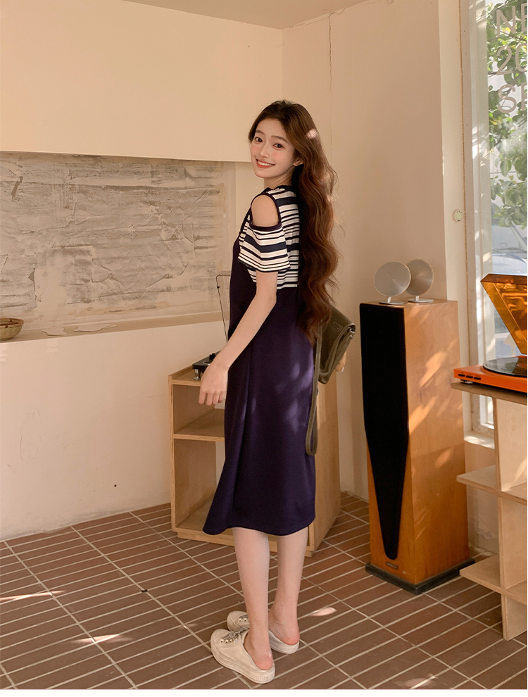 獨家訂製│假2件連衣裙 韓系微性感露肩條紋拼接連衣裙(04A1172)