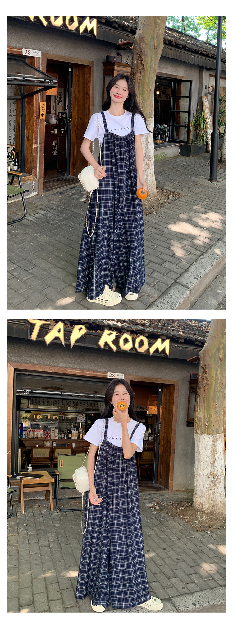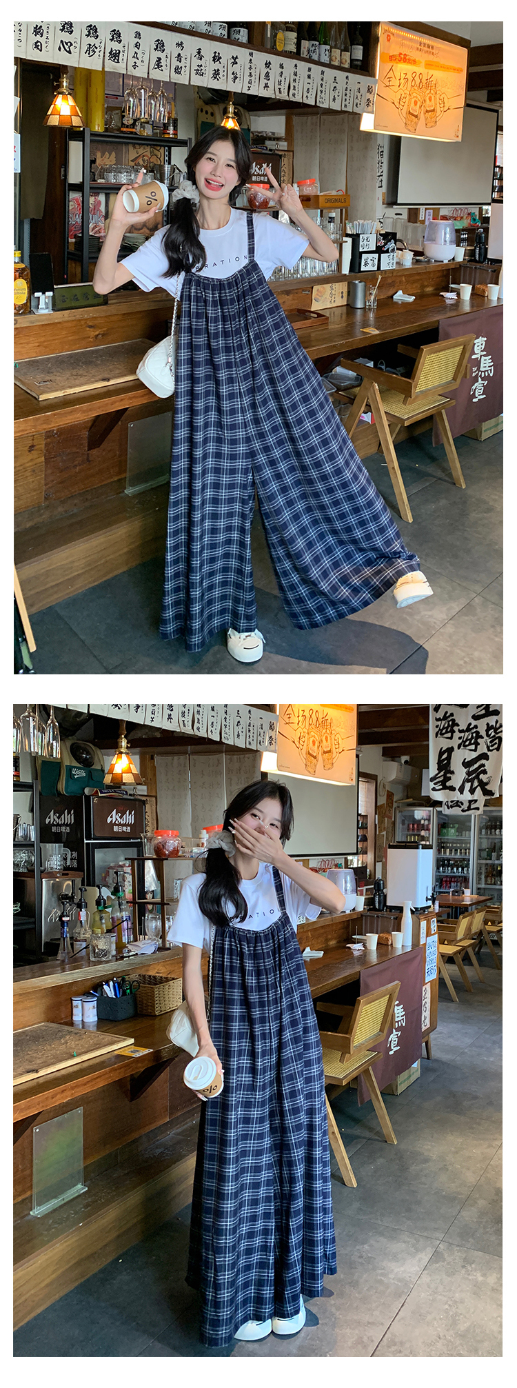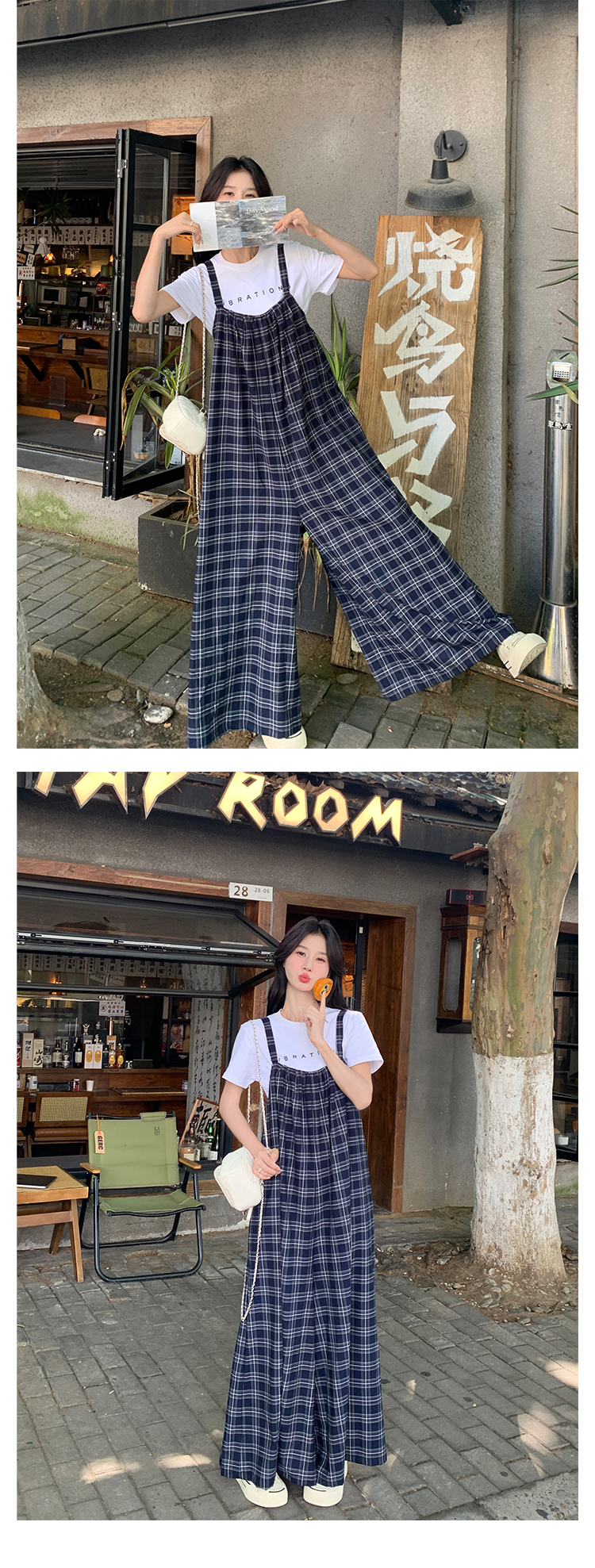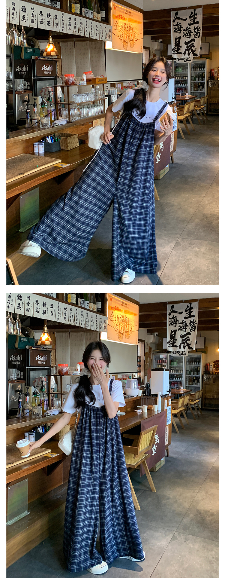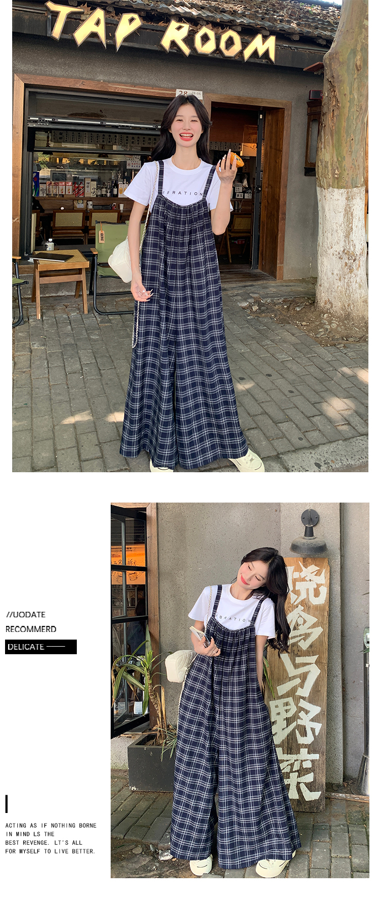 獨家訂製│韓系文藝感格紋大闊腿吊帶褲(04A1210)