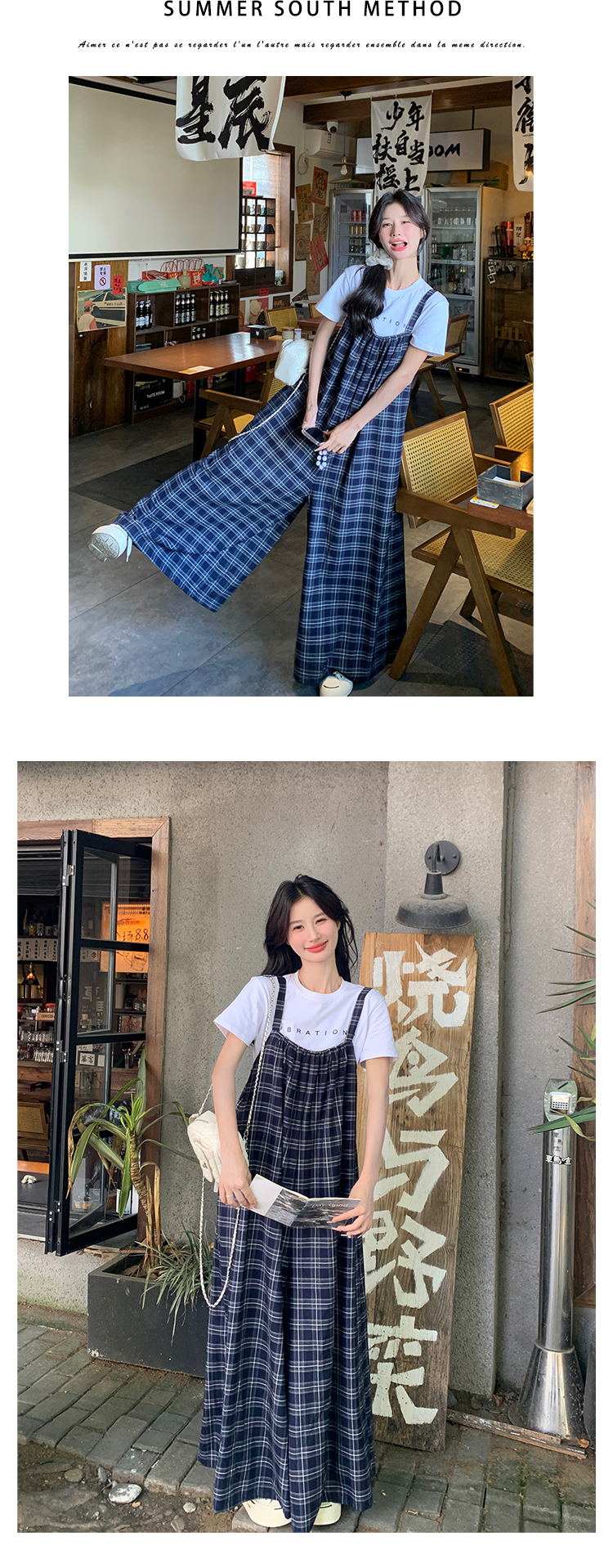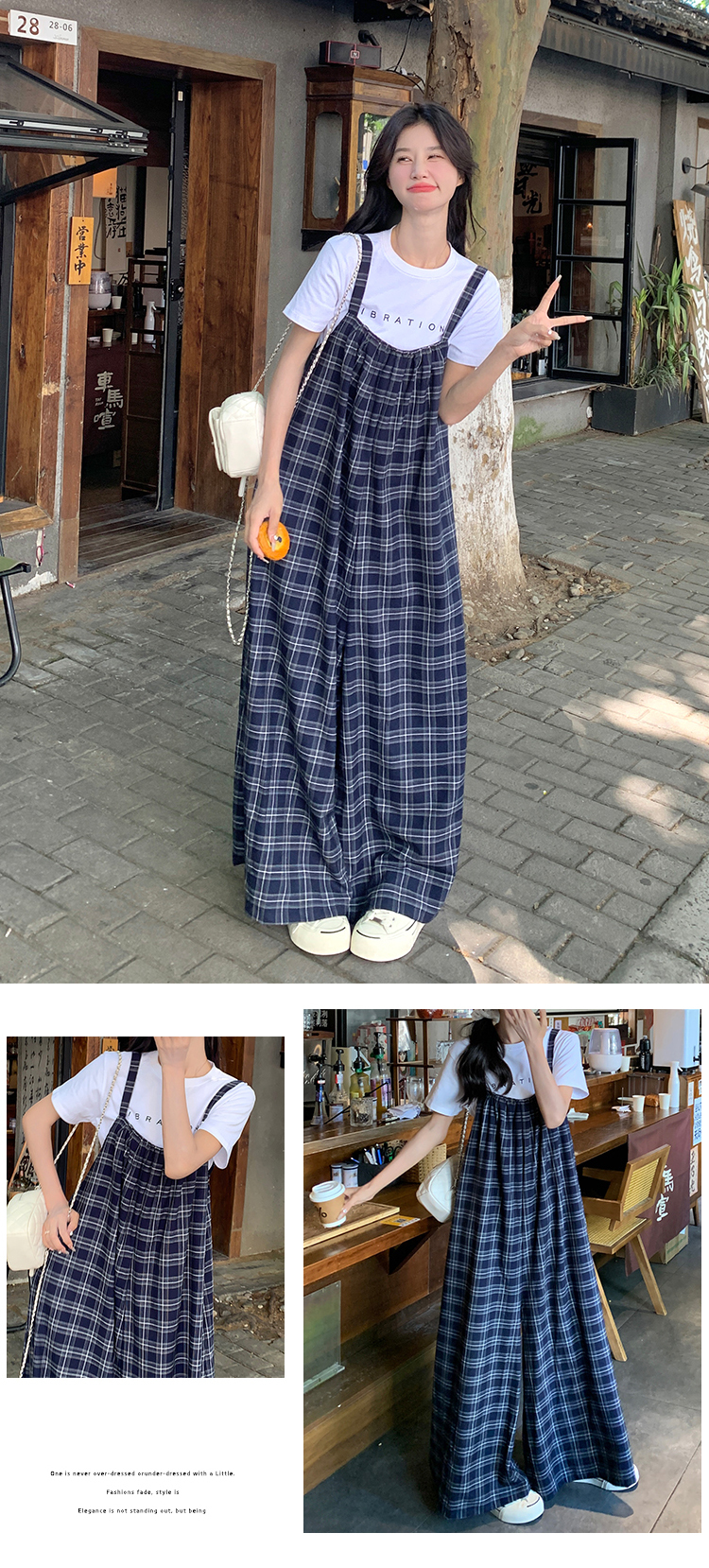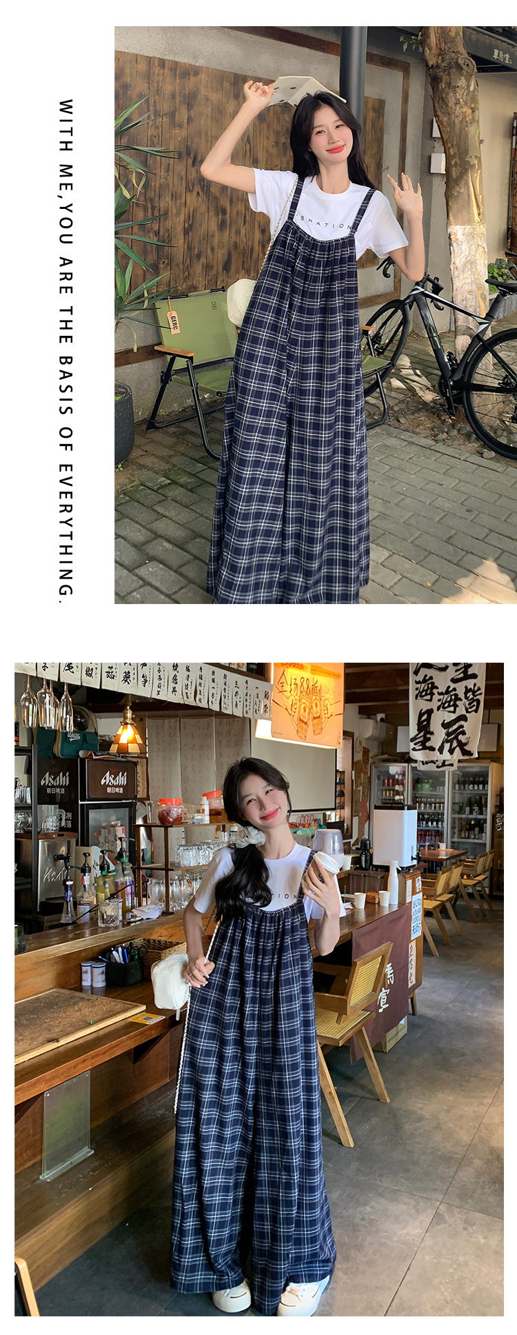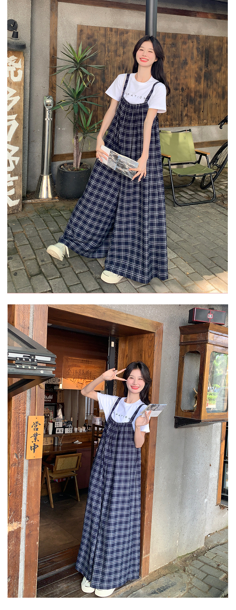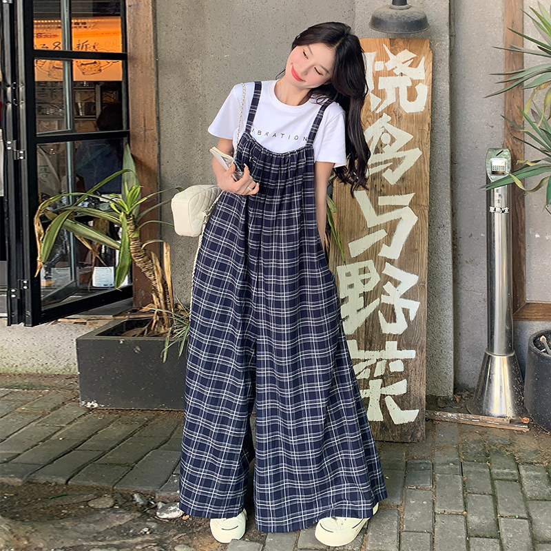 獨家訂製│韓系文藝感格紋大闊腿吊帶褲(04A1210)