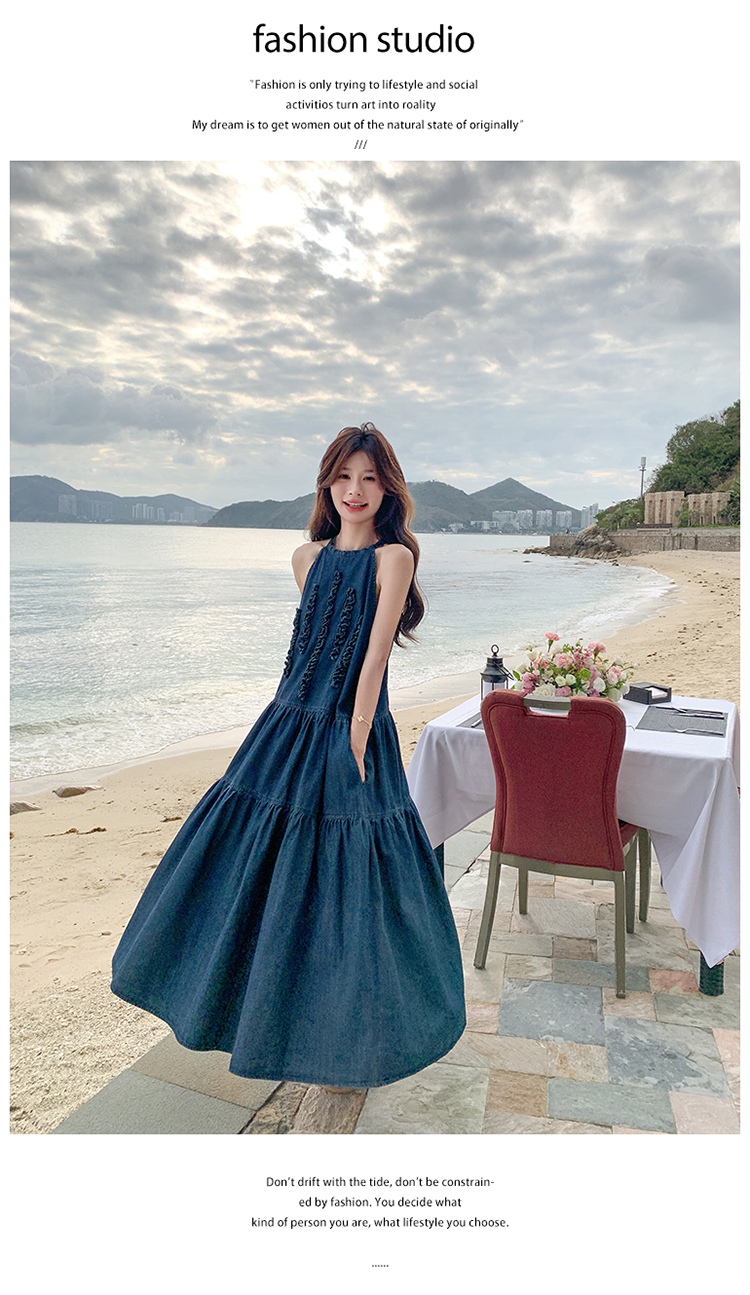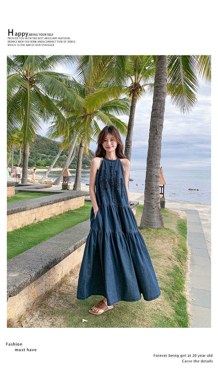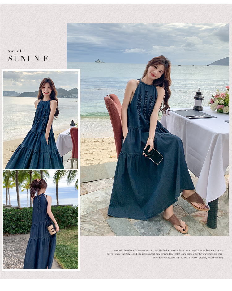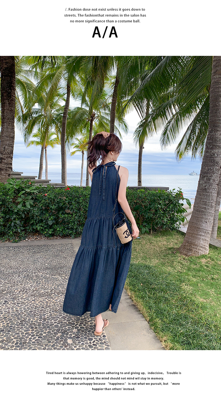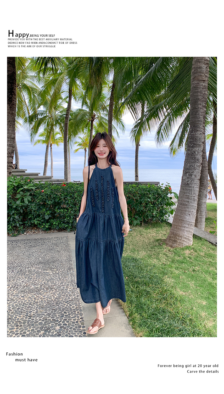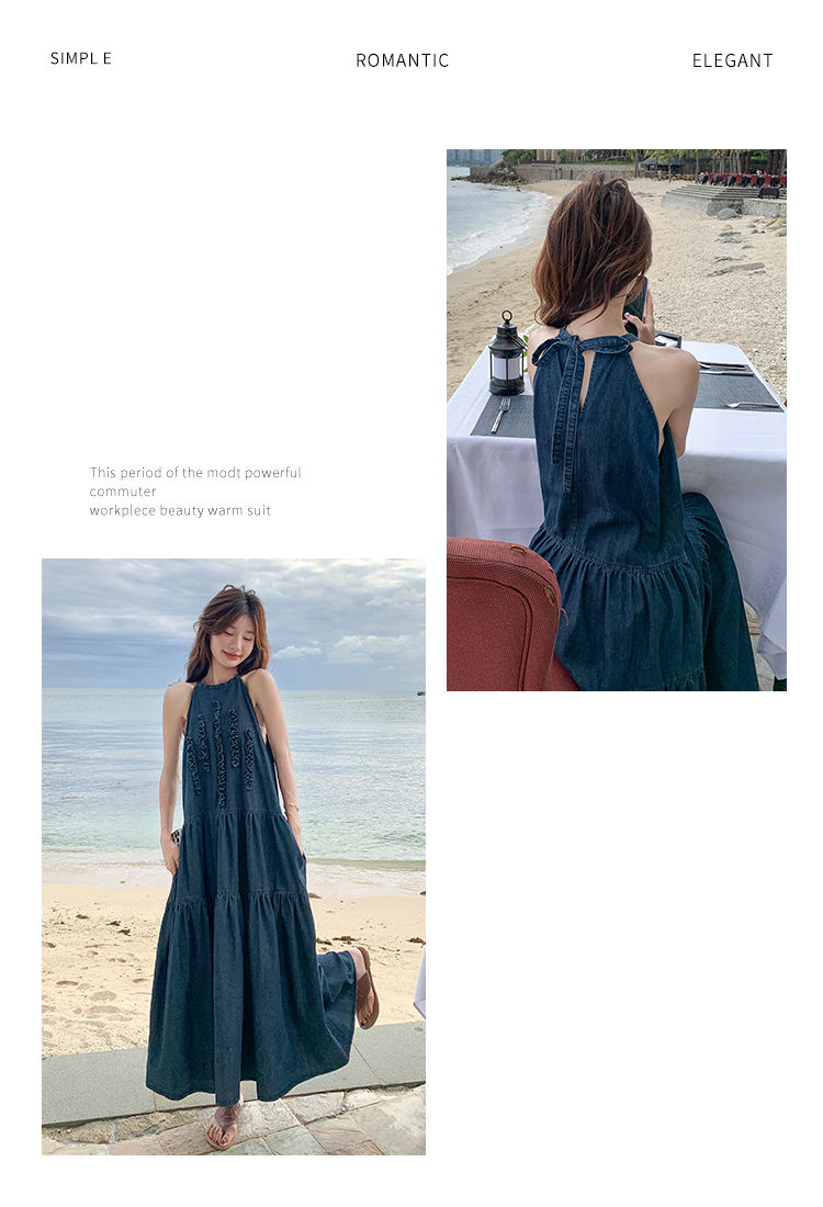 獨家訂製│韓系性感渡假風繞脖綁帶牛仔連衣裙(04A1221)