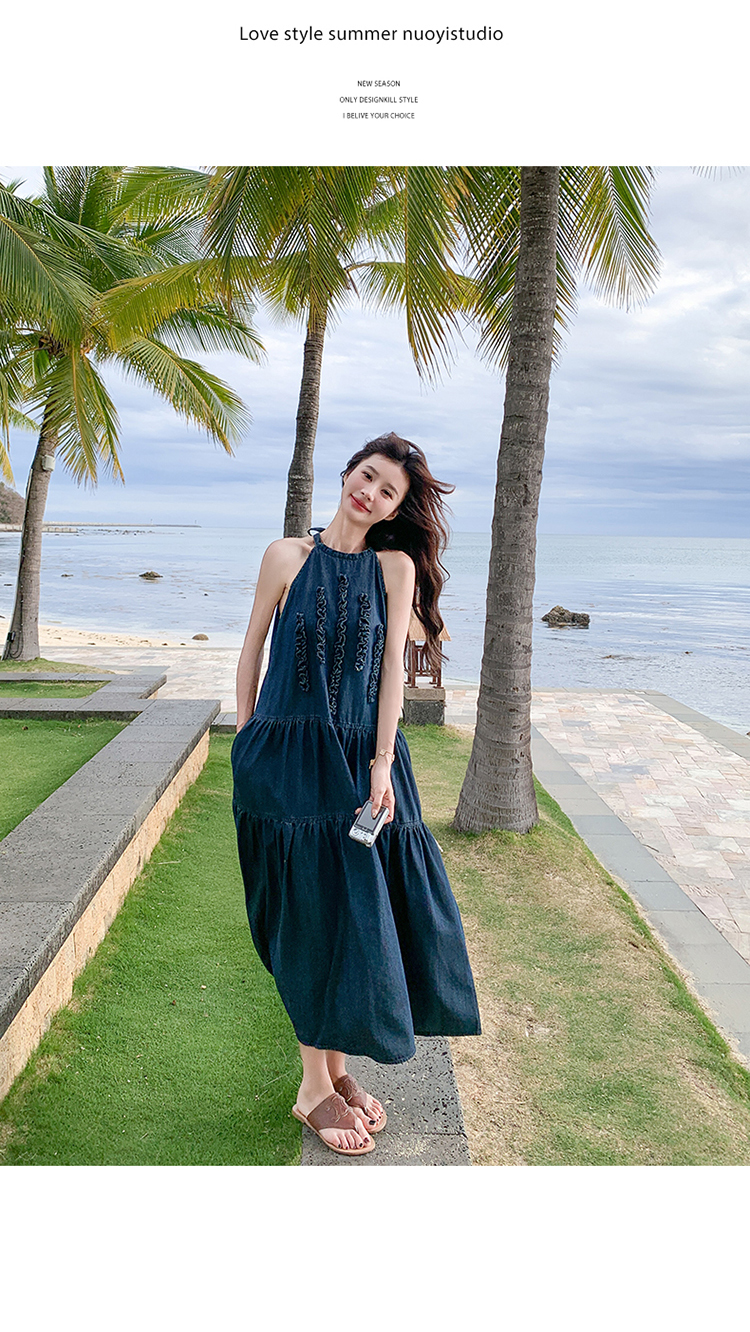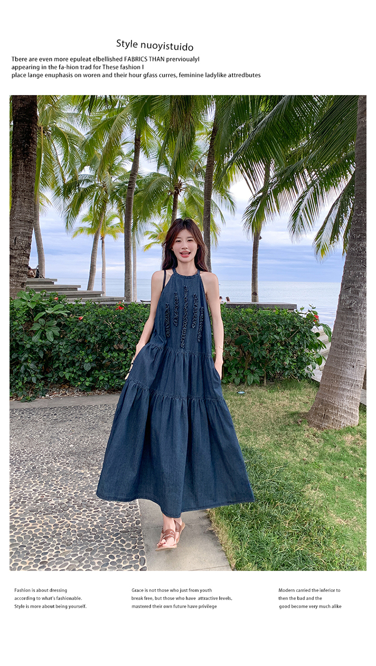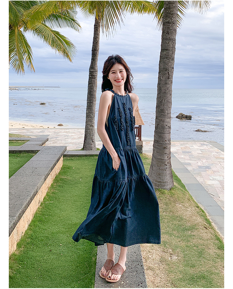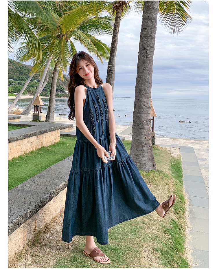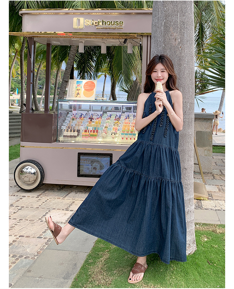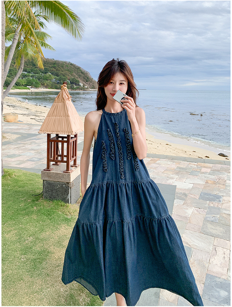 獨家訂製│韓系性感渡假風繞脖綁帶牛仔連衣裙(04A1221)