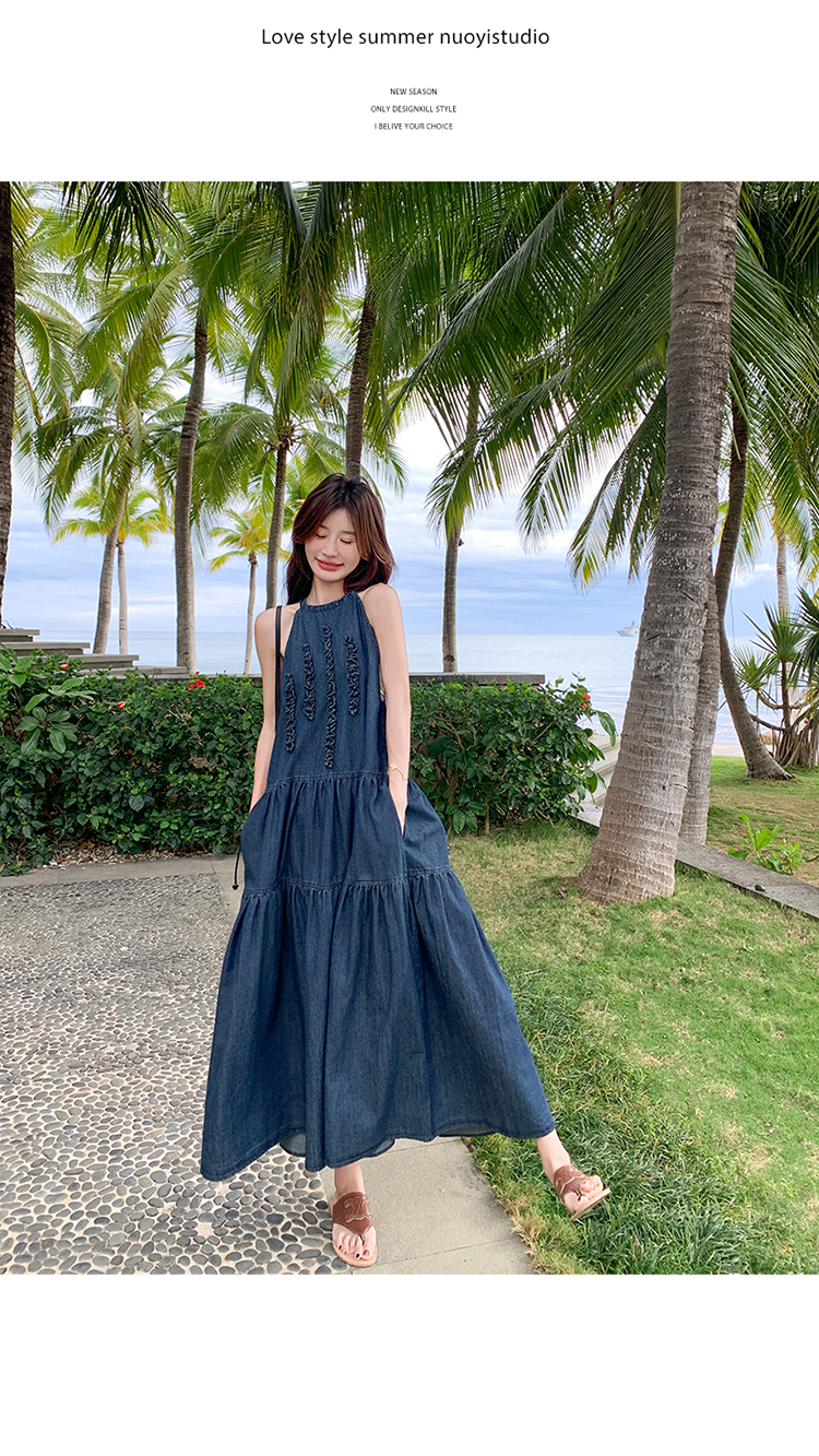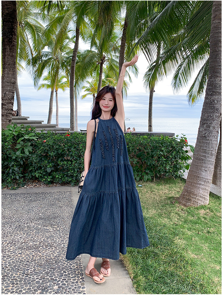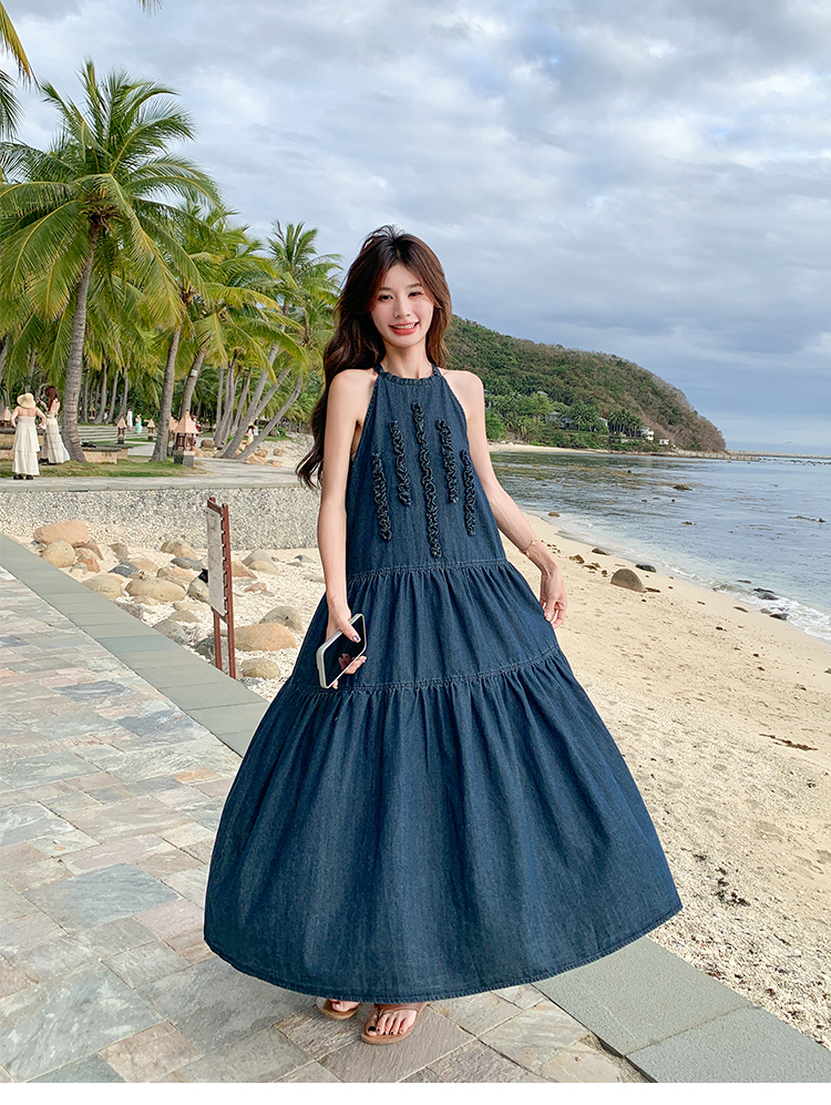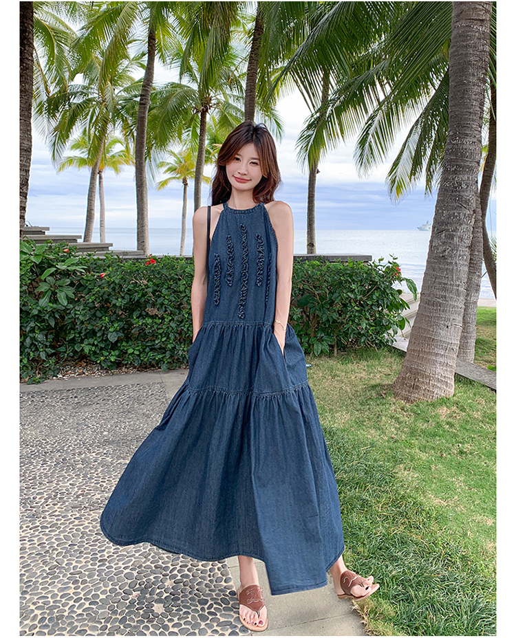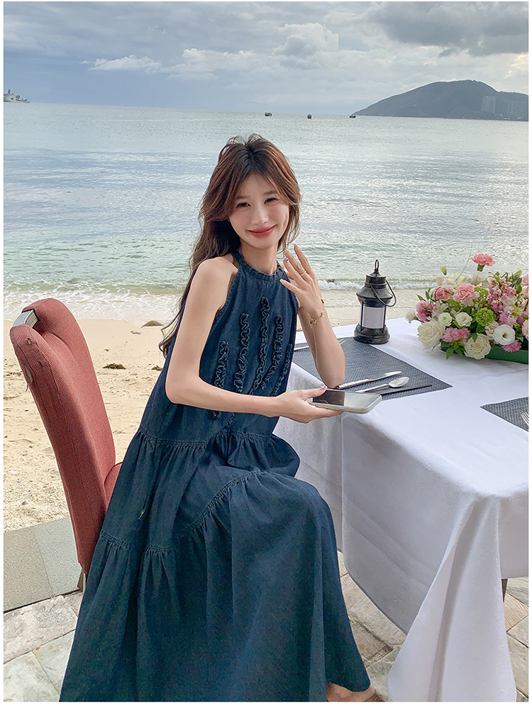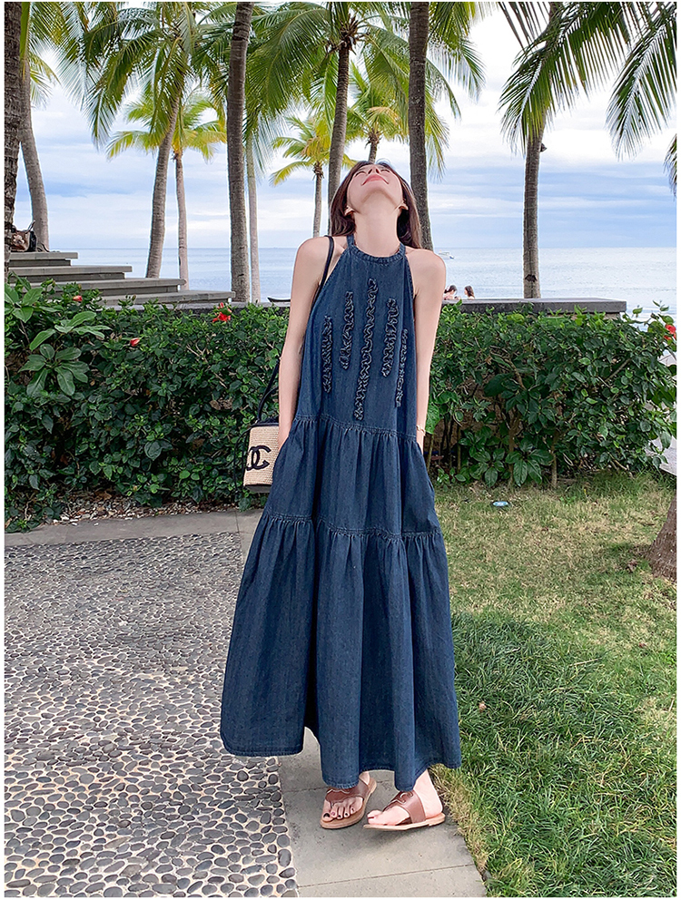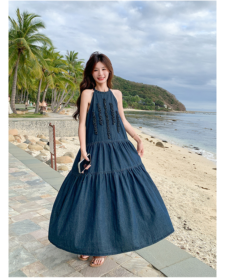 獨家訂製│韓系性感渡假風繞脖綁帶牛仔連衣裙(04A1221)
