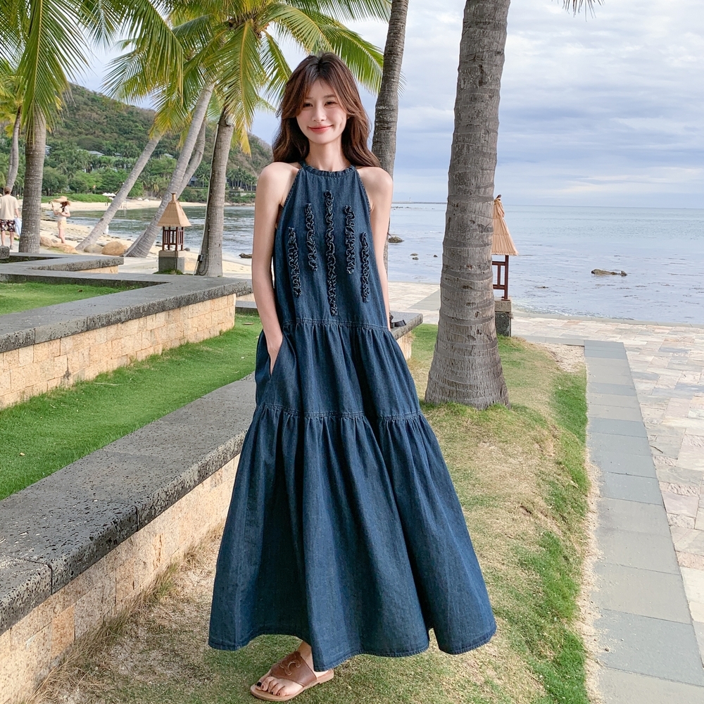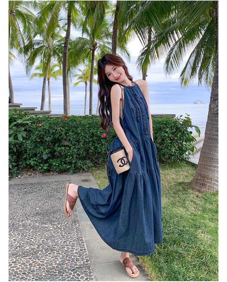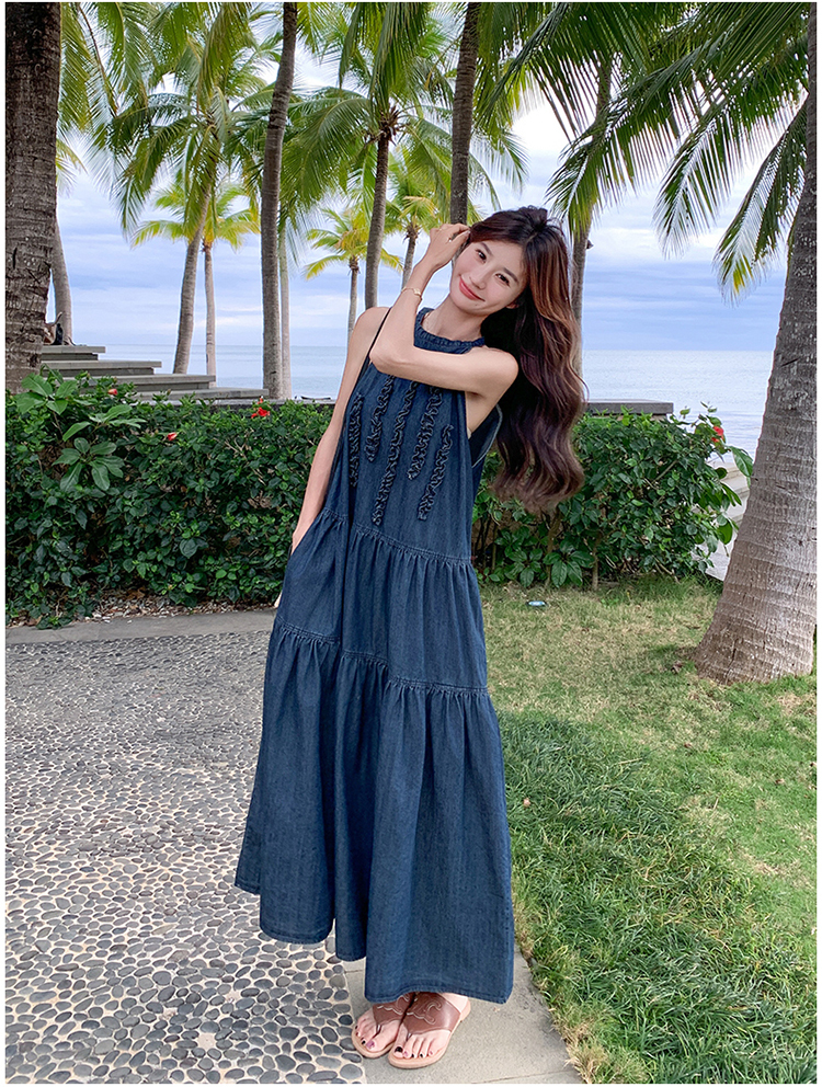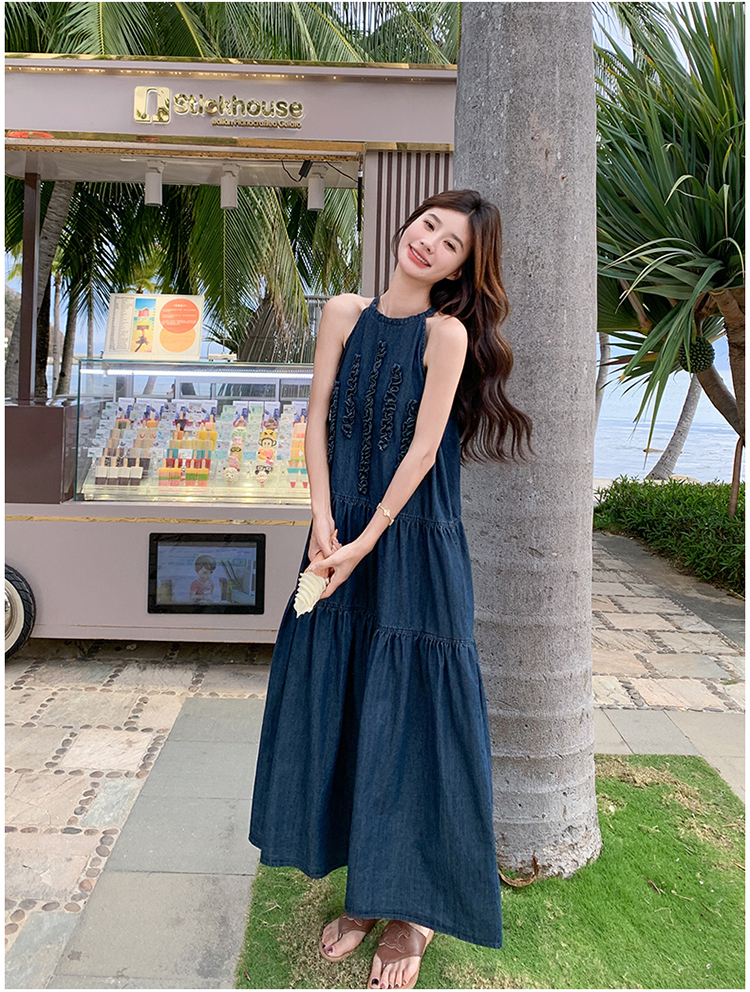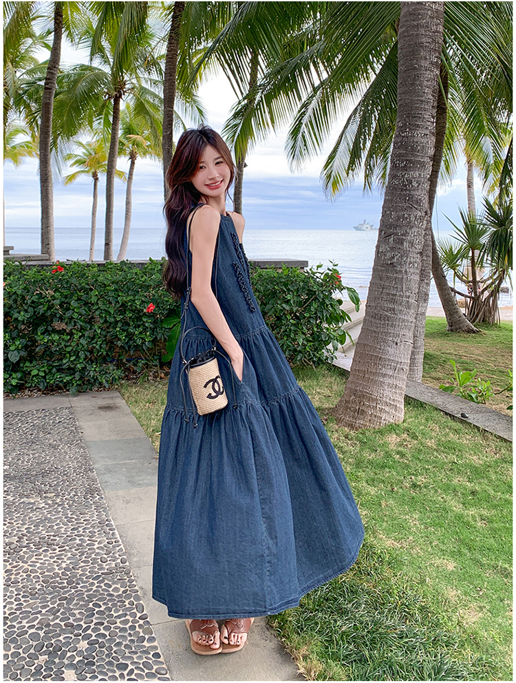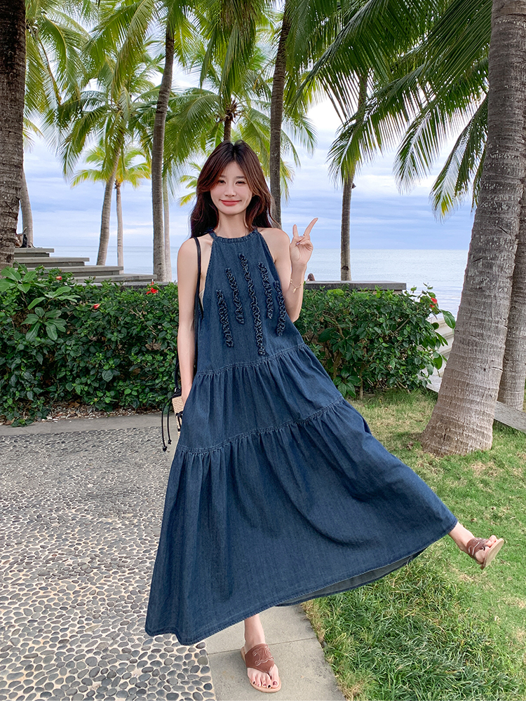 獨家訂製│韓系性感渡假風繞脖綁帶牛仔連衣裙(04A1221)
