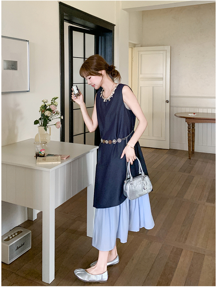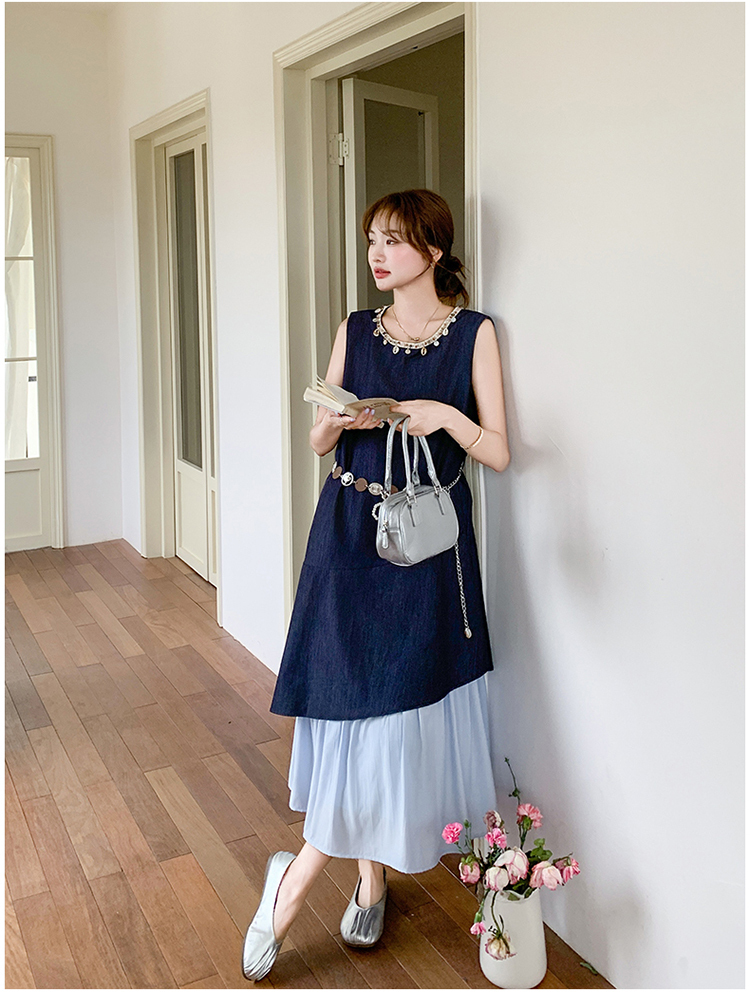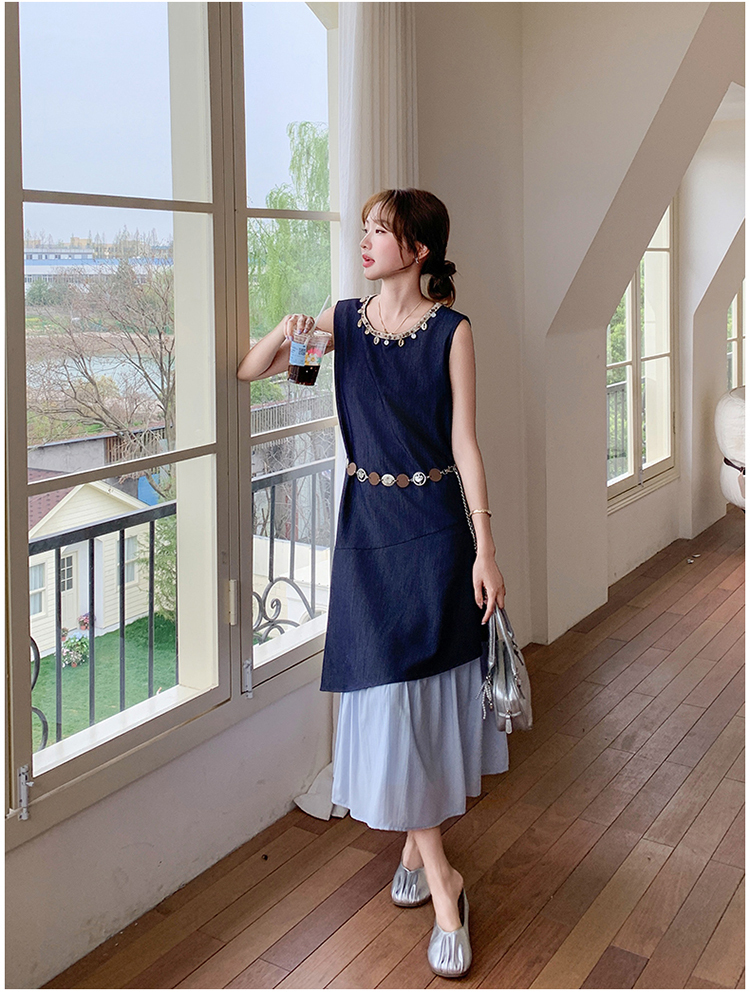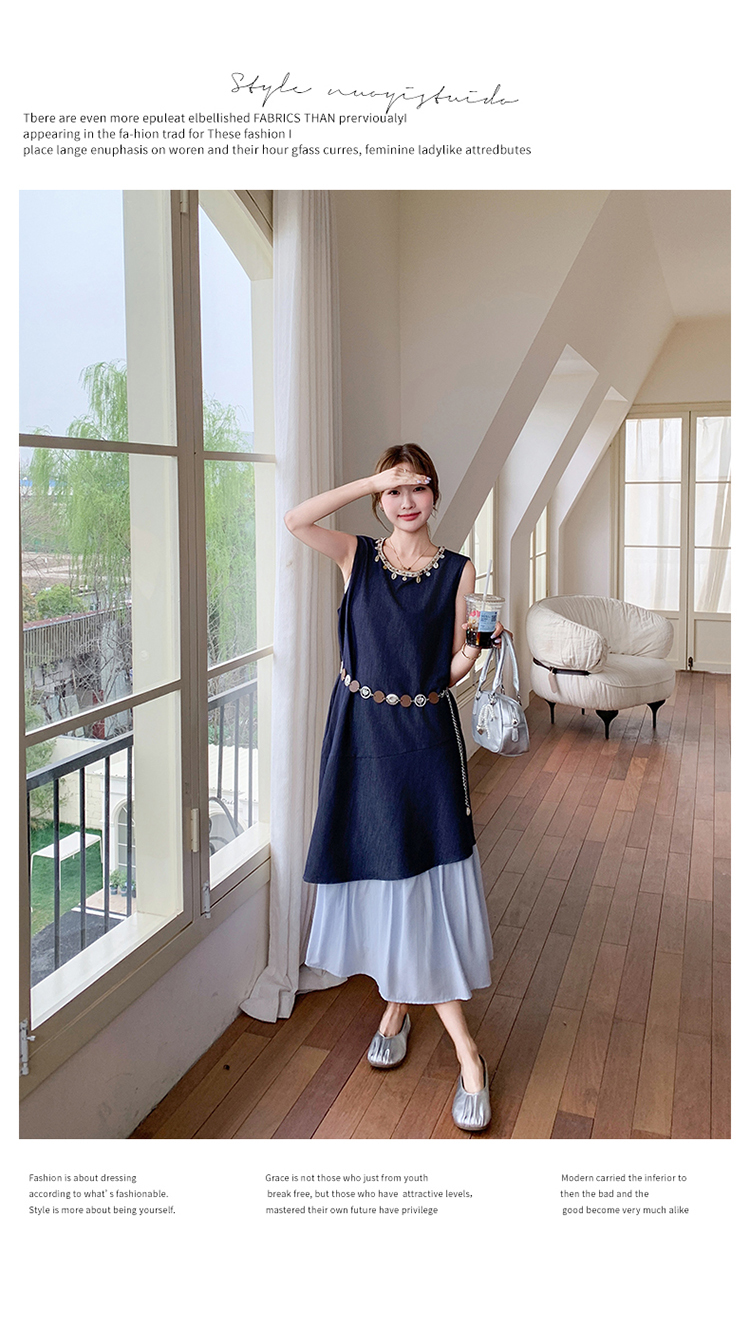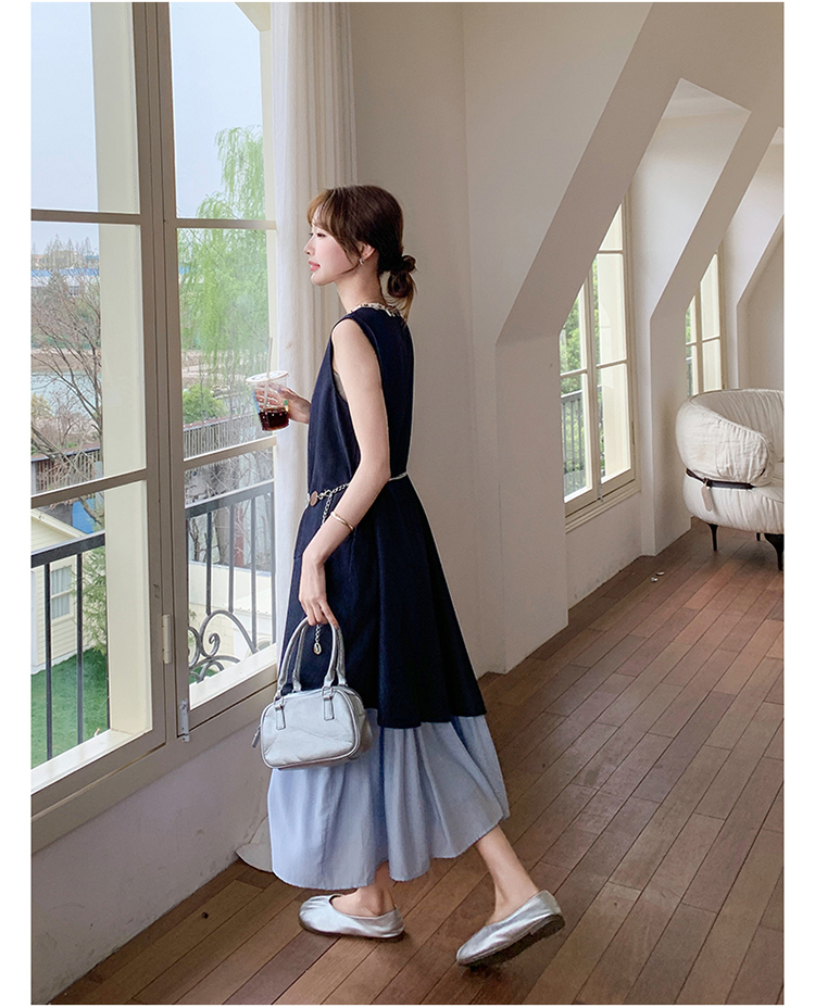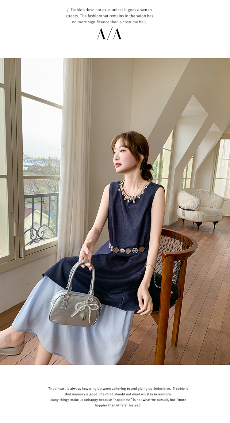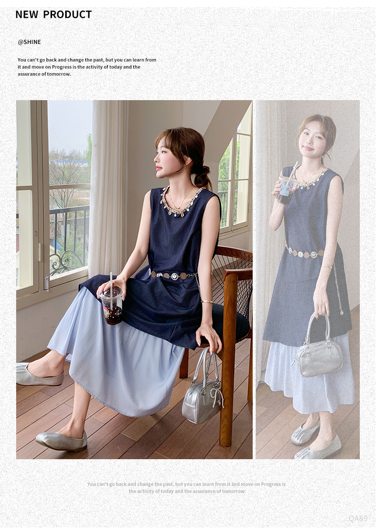 獨家訂製│假2件連衣裙 韓系氣質裙襬拼接亮片圓領連衣裙(04A1261)