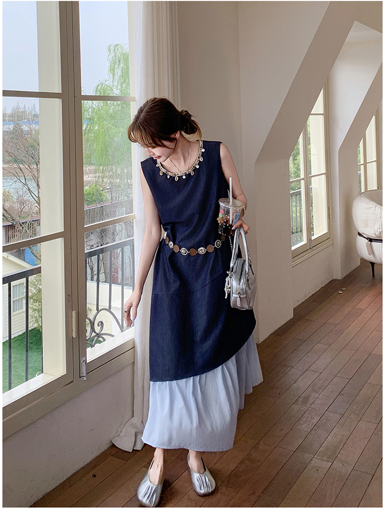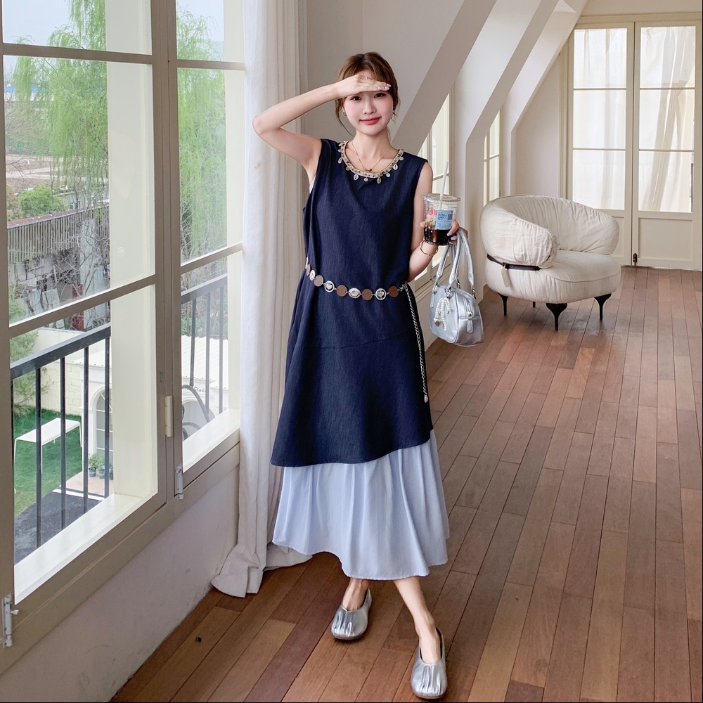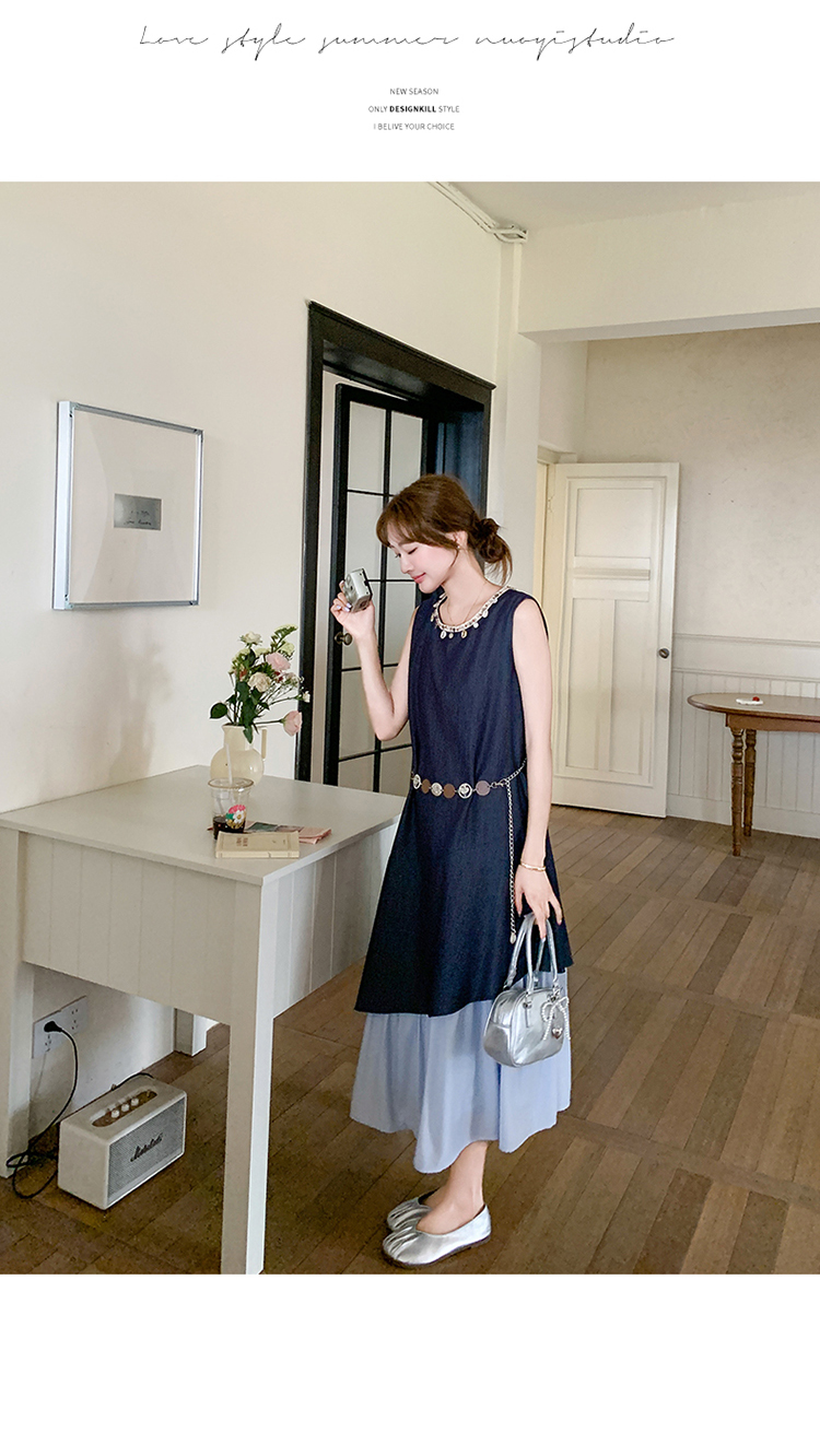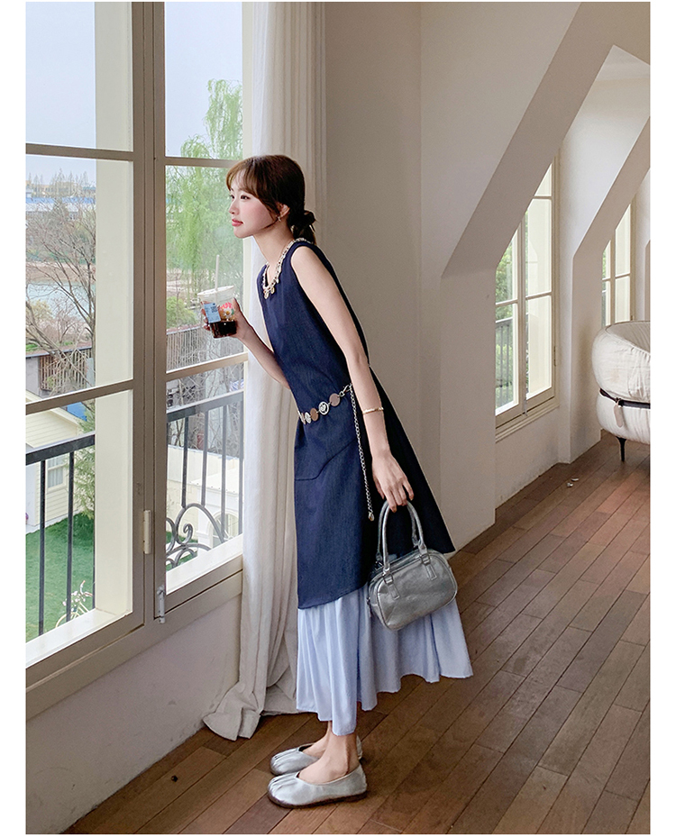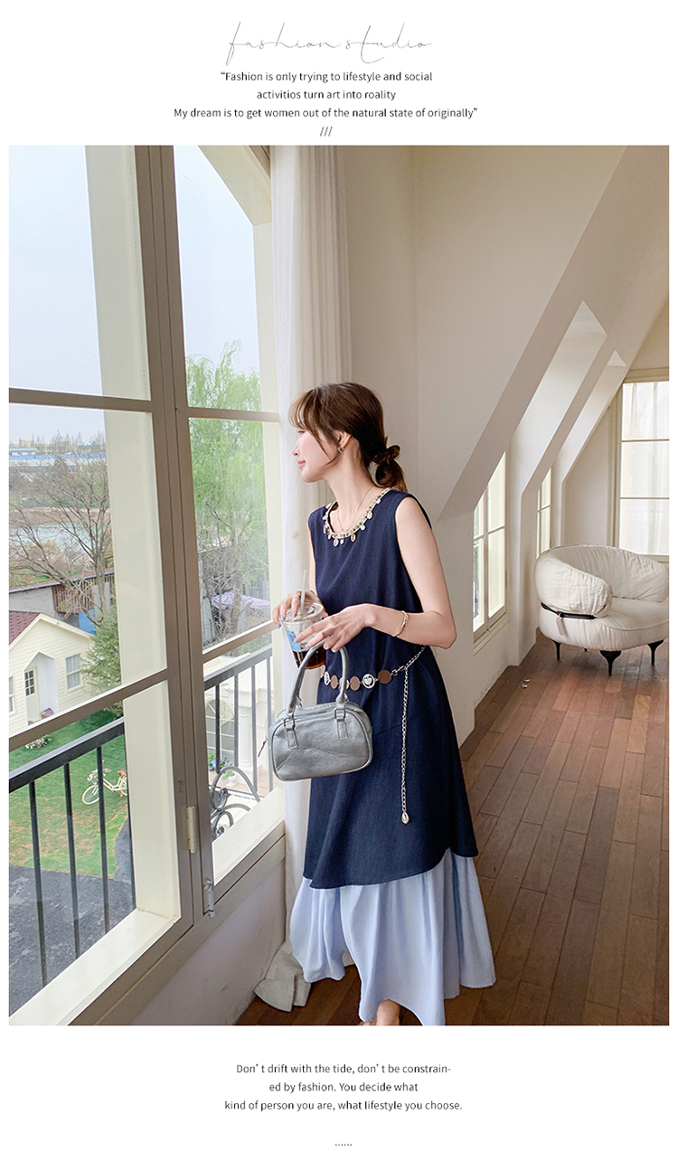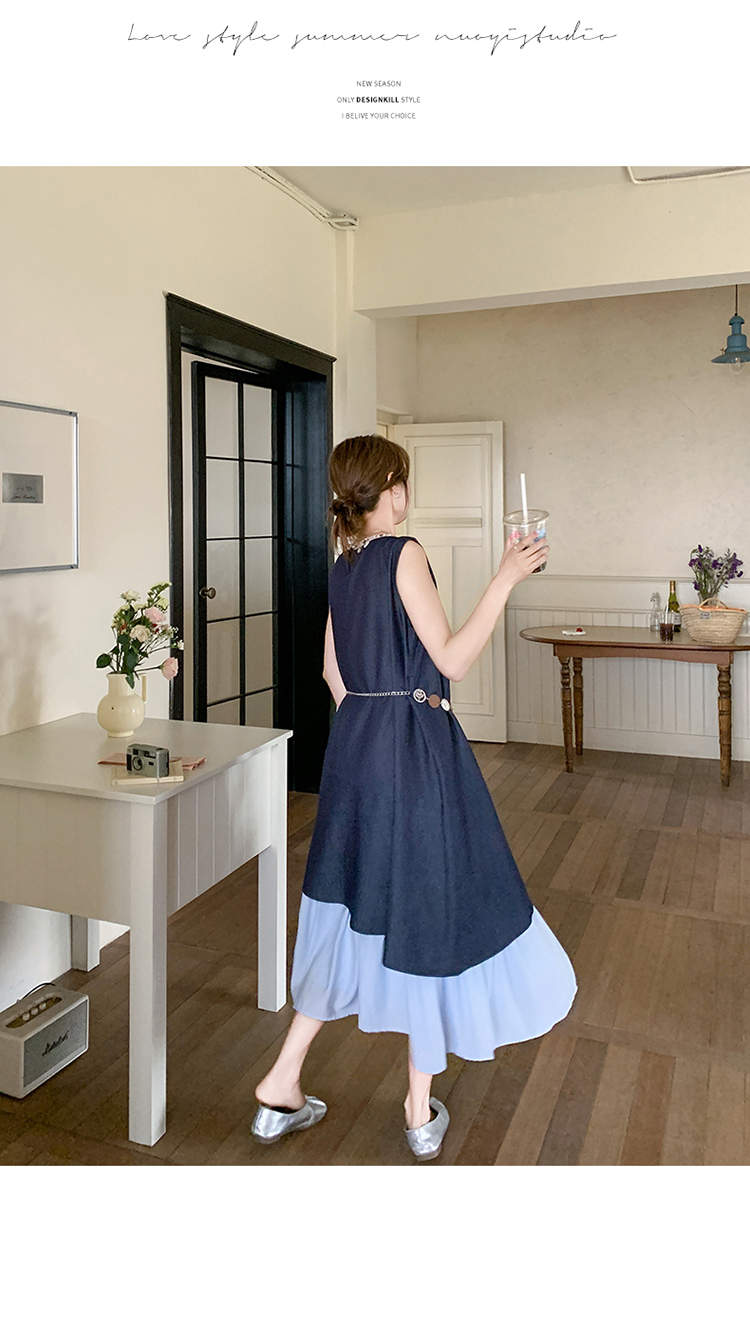 獨家訂製│假2件連衣裙 韓系氣質裙襬拼接亮片圓領連衣裙(04A1261)
