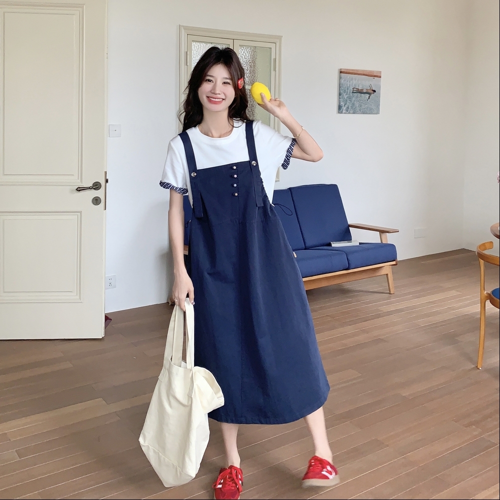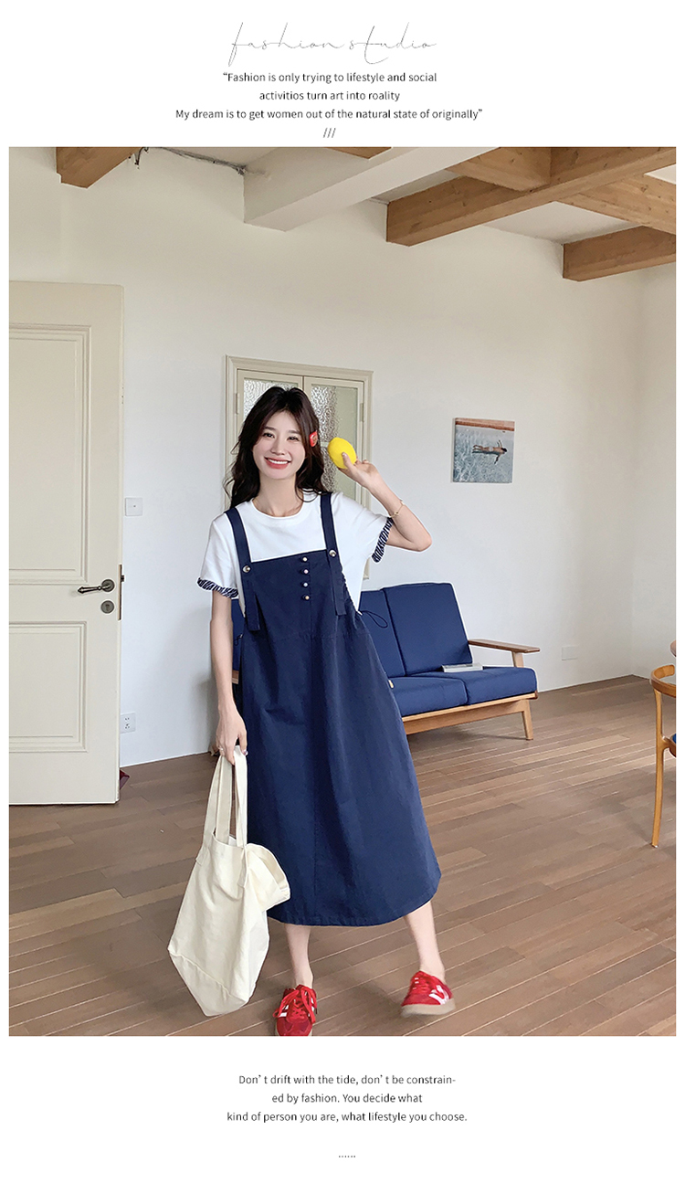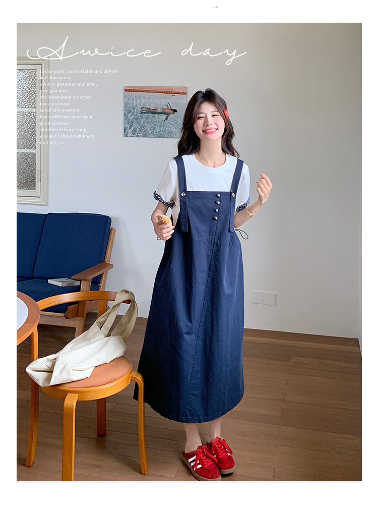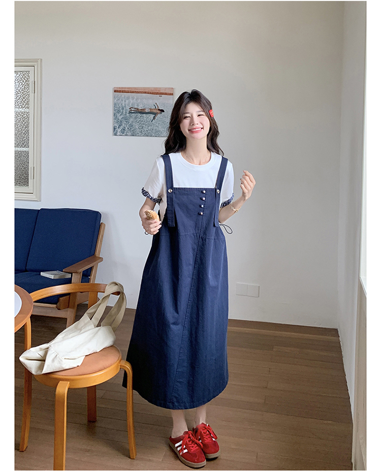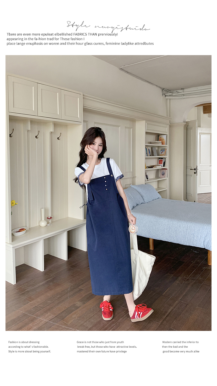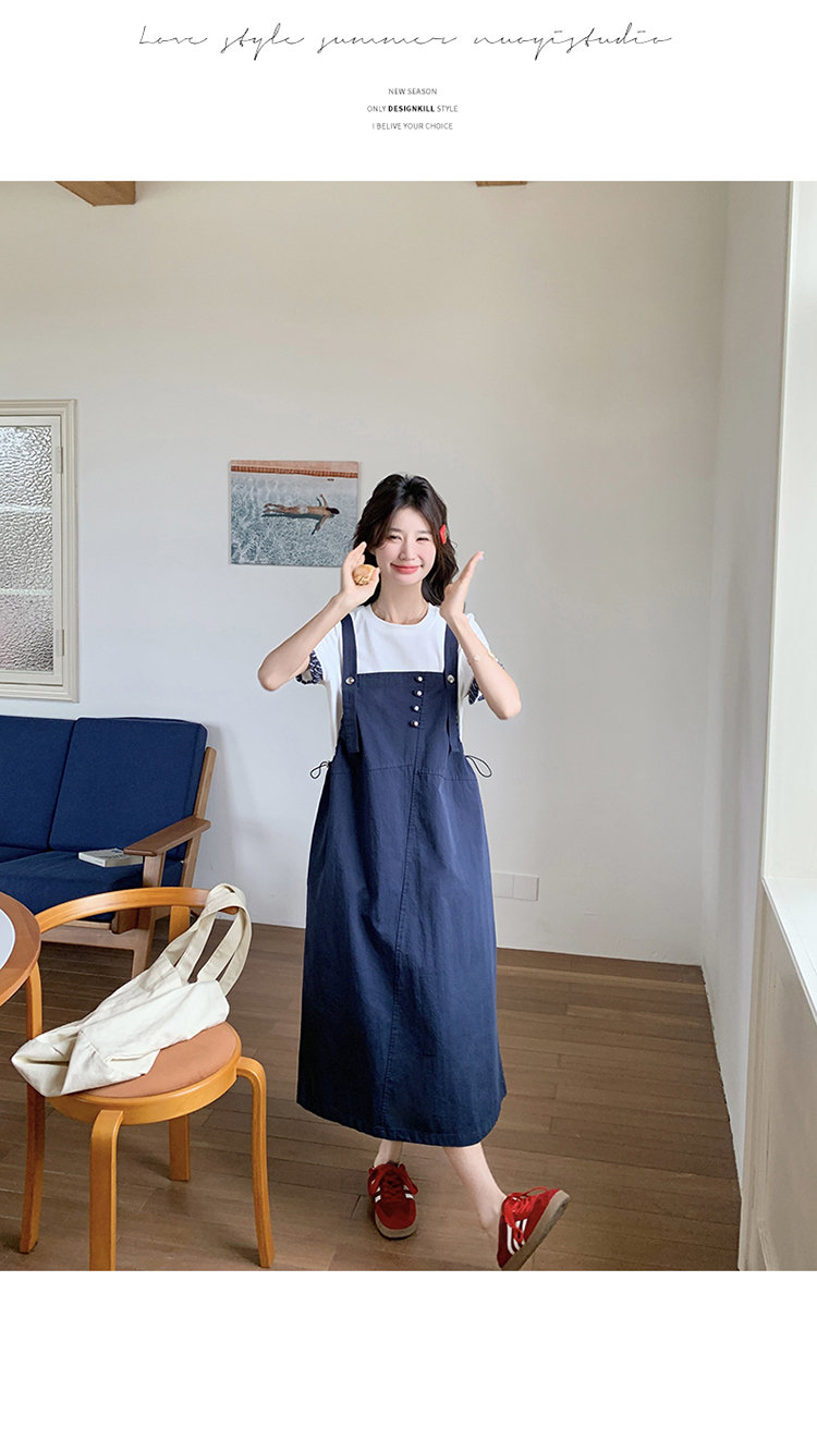 獨家訂製│2件式 韓系小清新撞色上衣+抽繩收腰吊帶裙(04A1268)