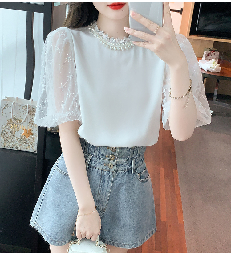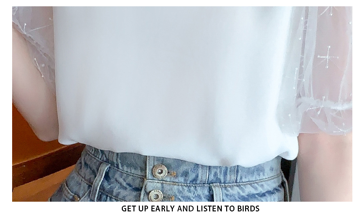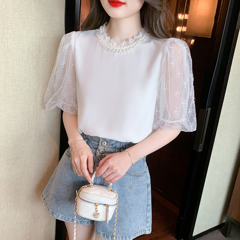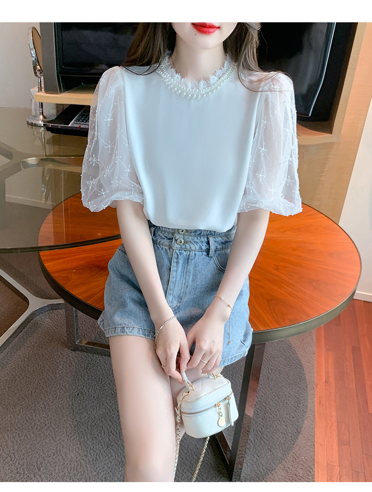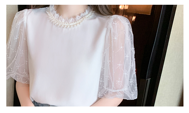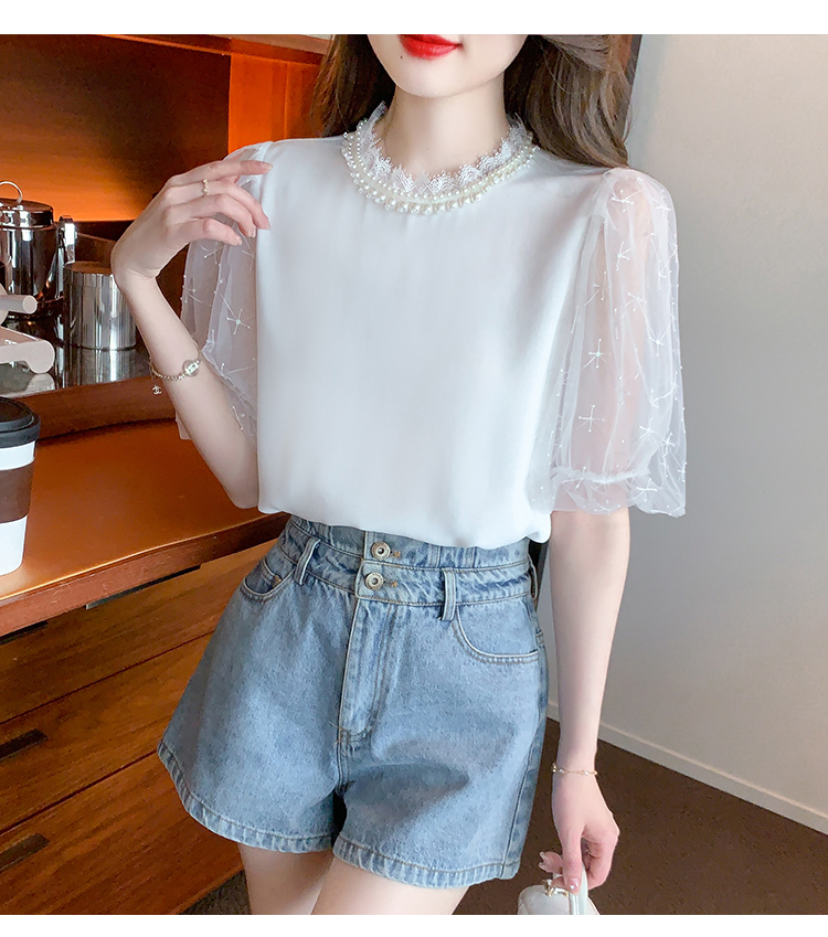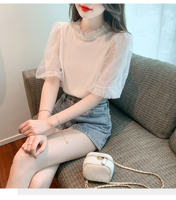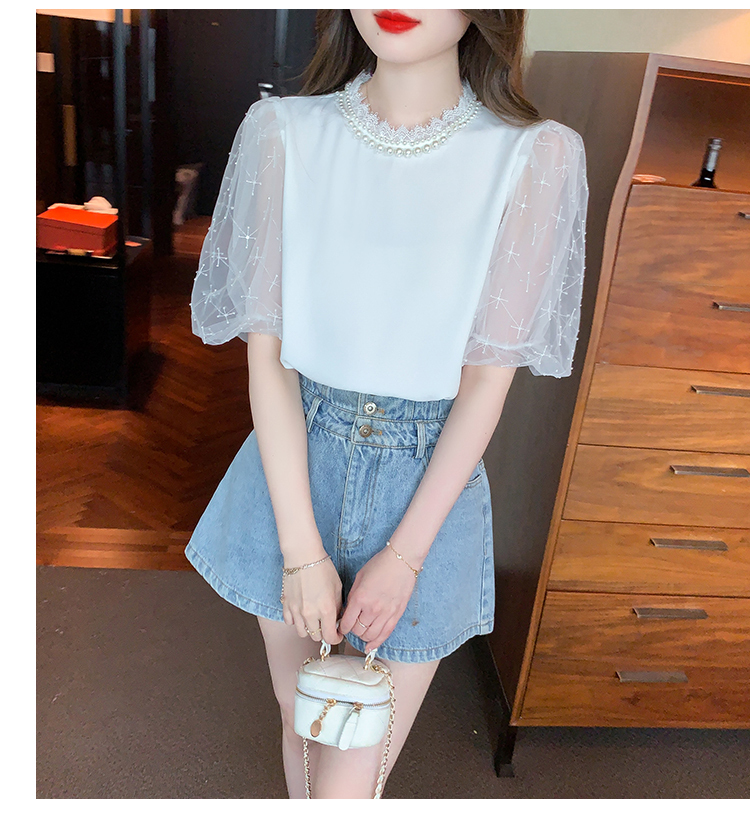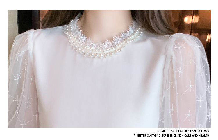 限量特惠|氣質釘珠蕾絲立領拼接透膚袖雪紡衫(04H3402)