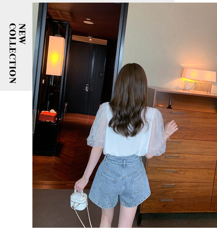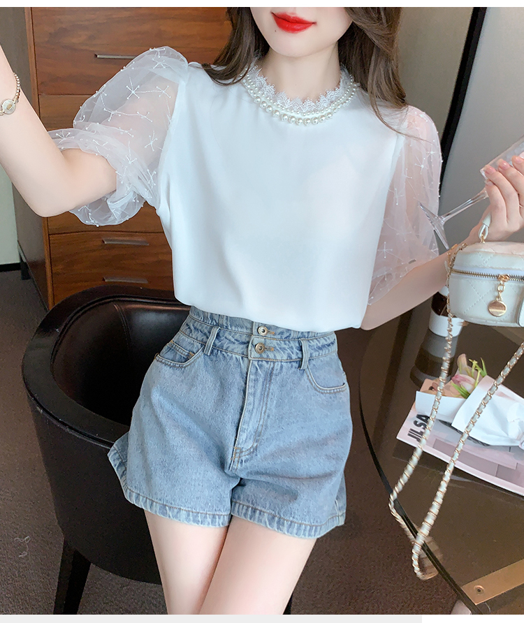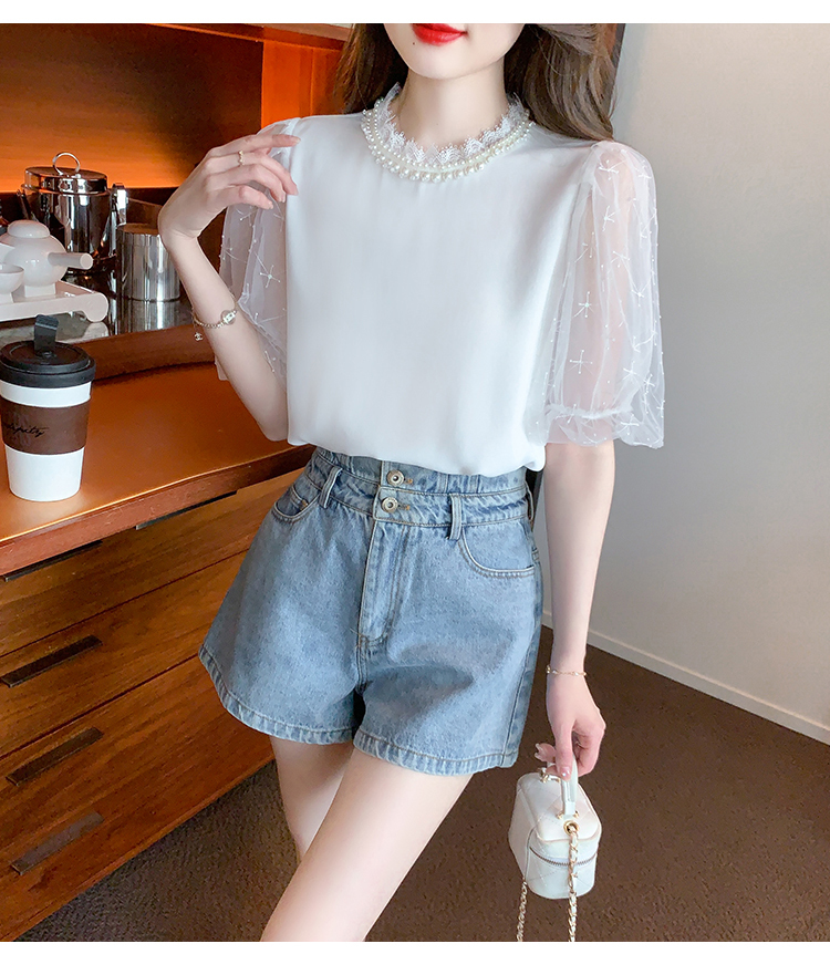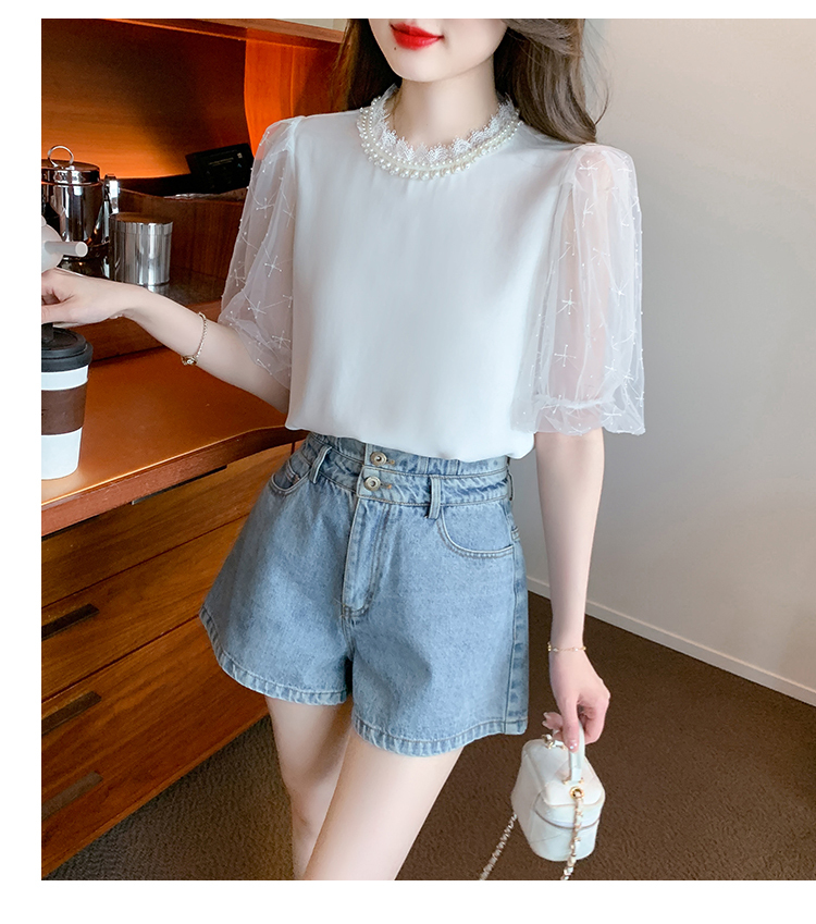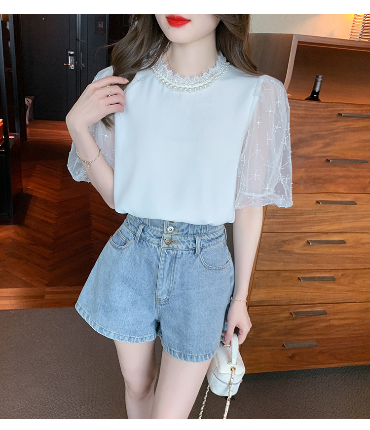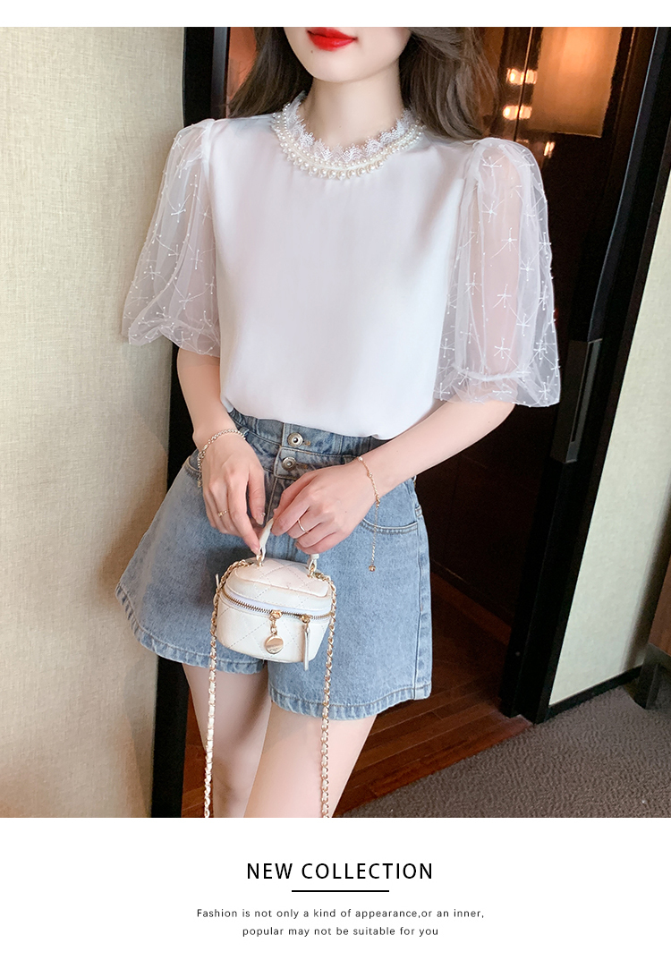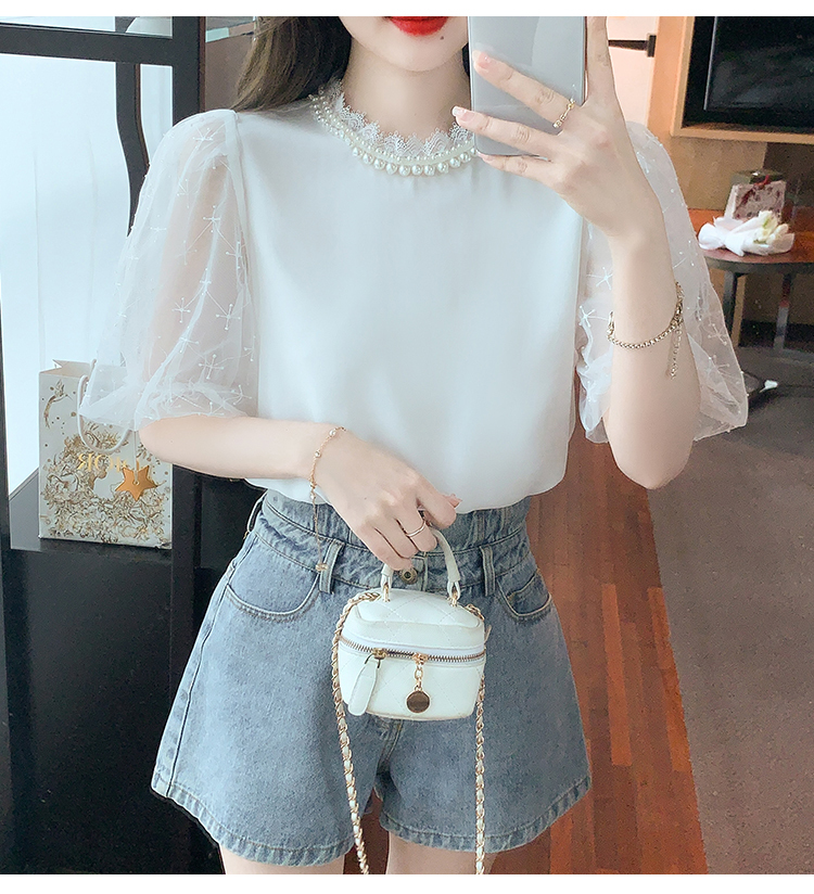 限量特惠|氣質釘珠蕾絲立領拼接透膚袖雪紡衫(04H3402)