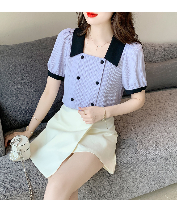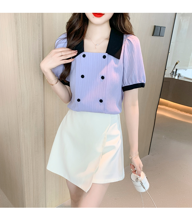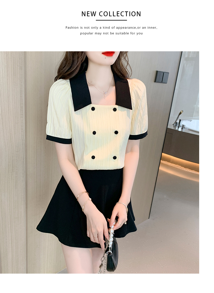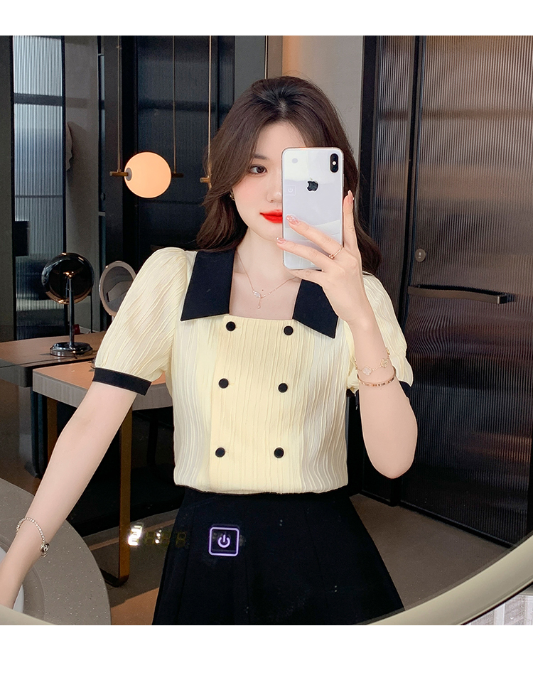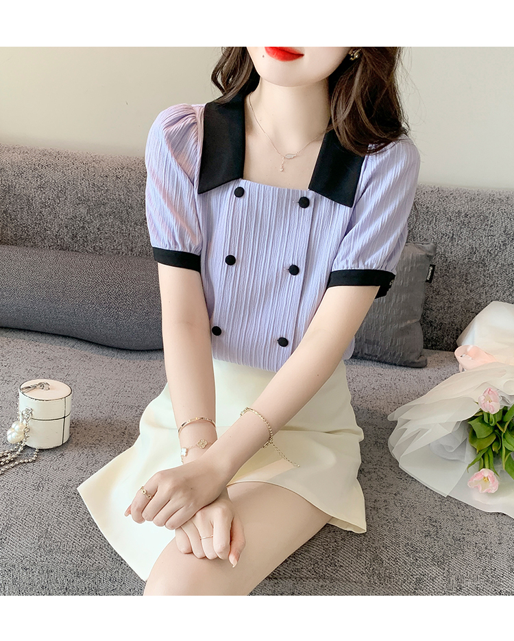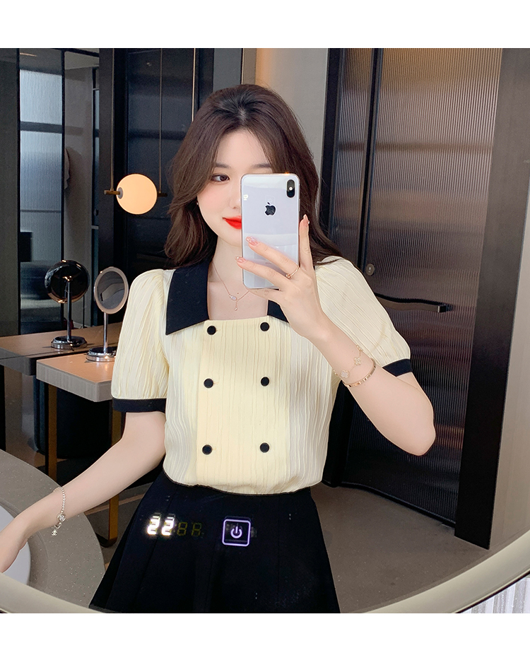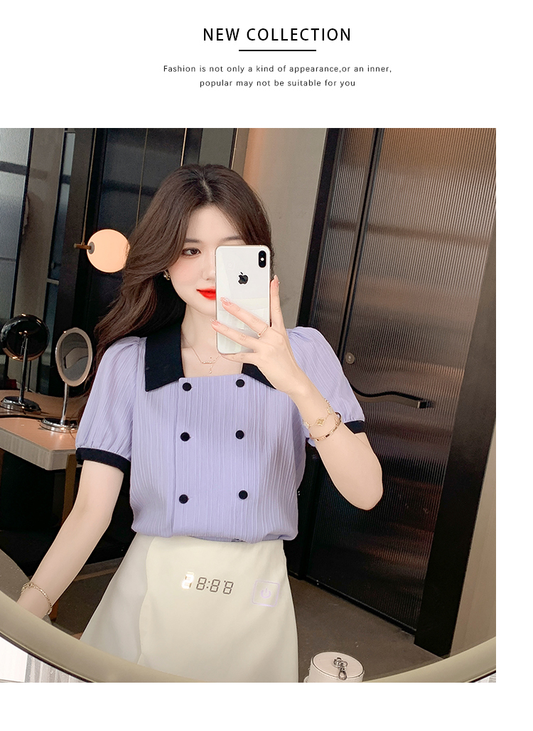 限量特惠|法式撞色翻領雙排扣雪紡衫-3色(04H3434)