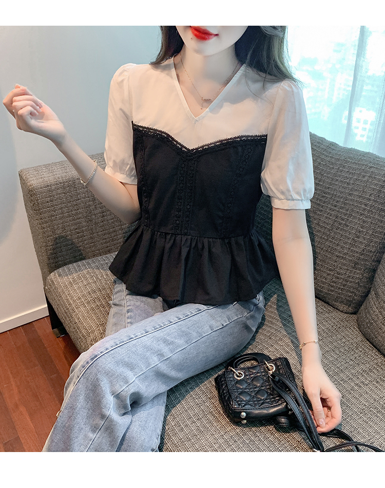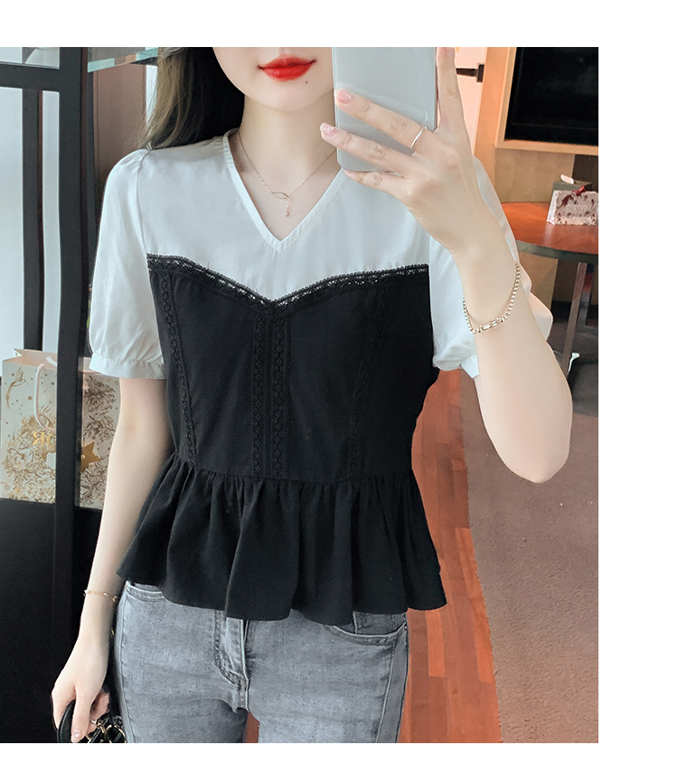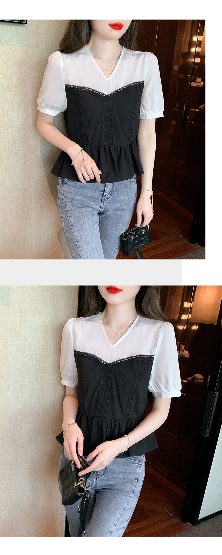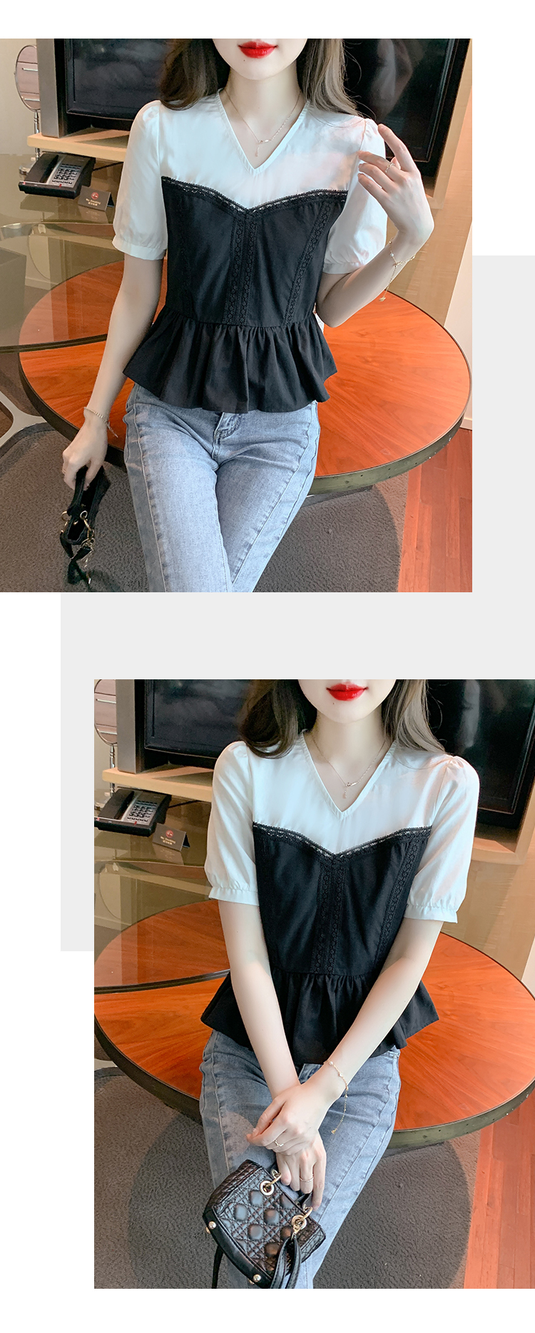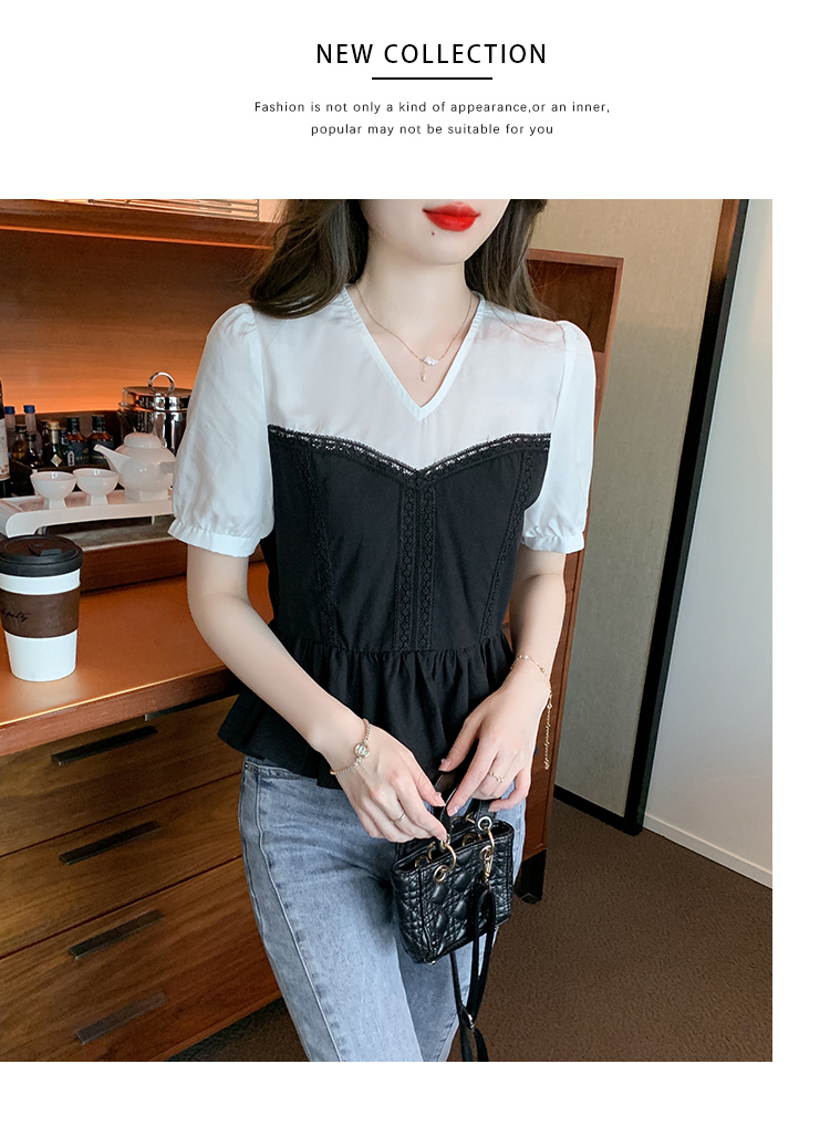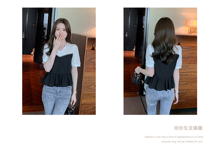 限量特惠|舒適氣質拼接刺繡撞色收腰上衣(04H3518)