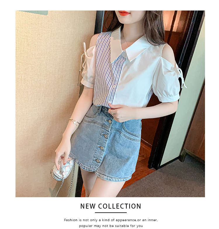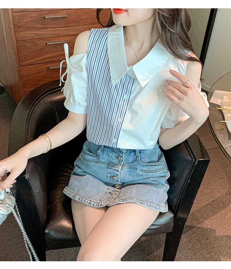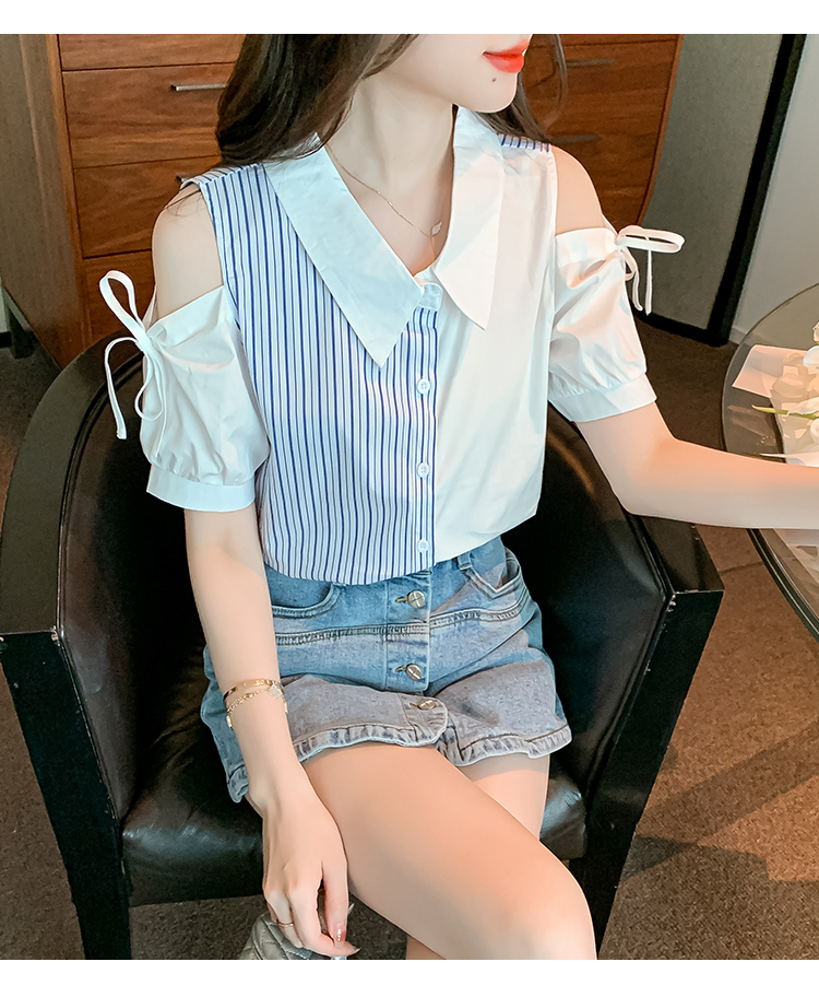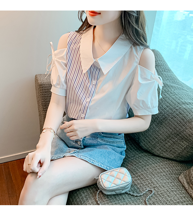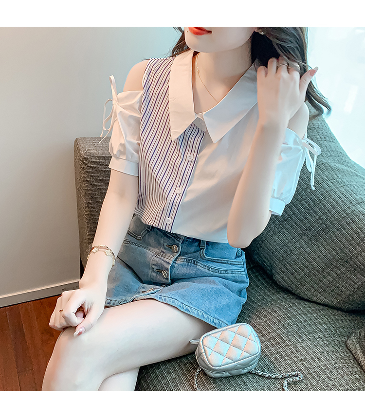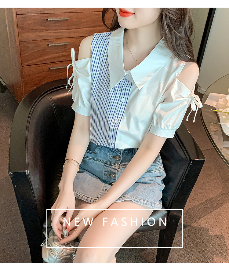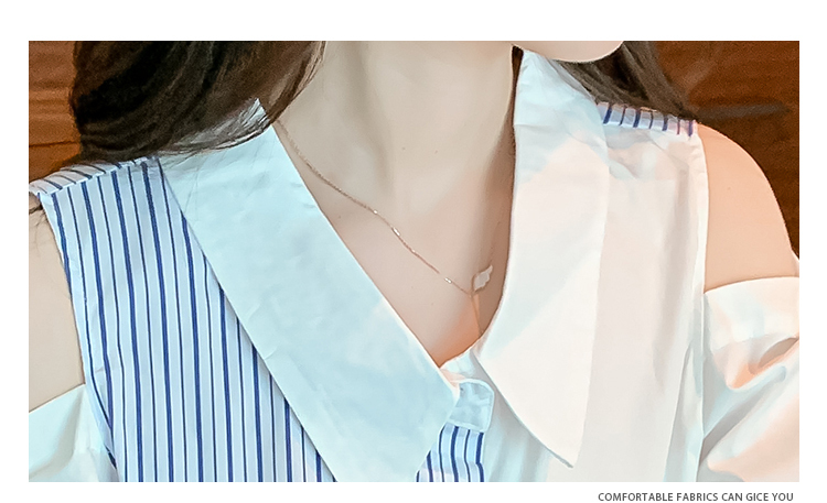 限量特惠|氣質翻領條紋拼接繫帶露肩襯衫(04H3519)
