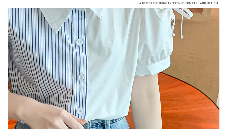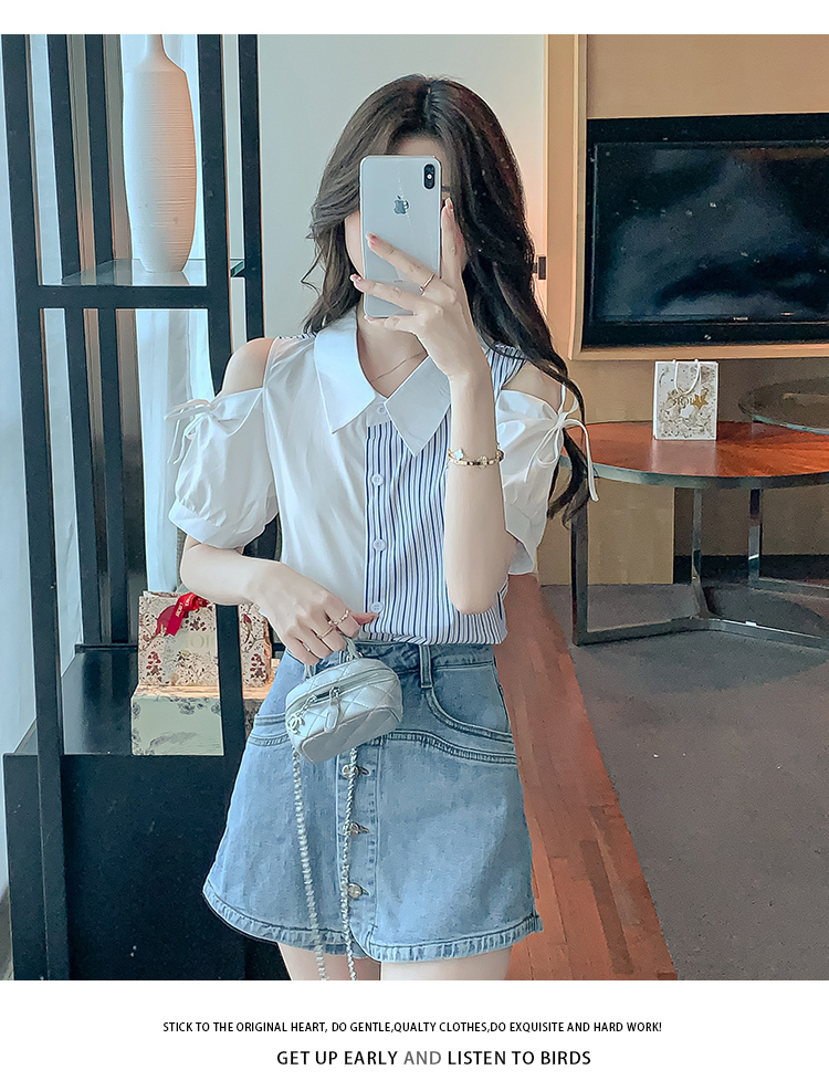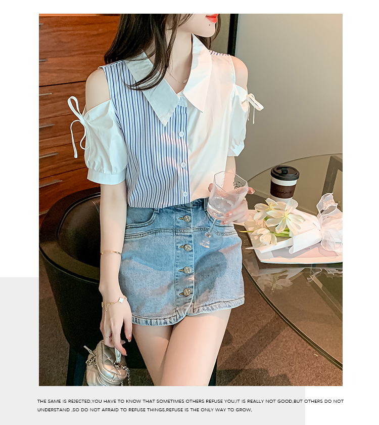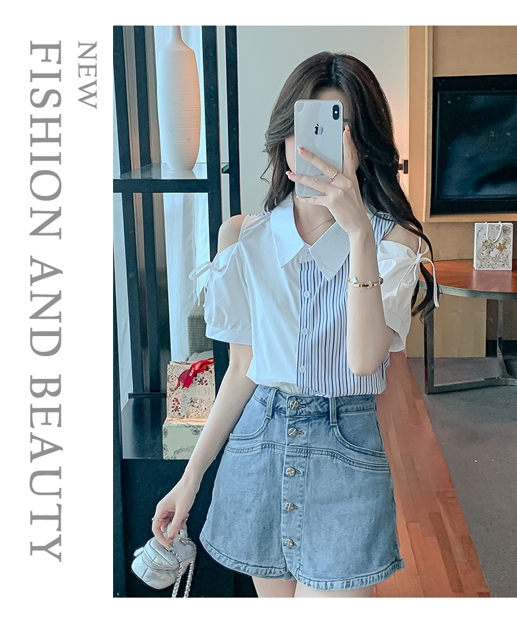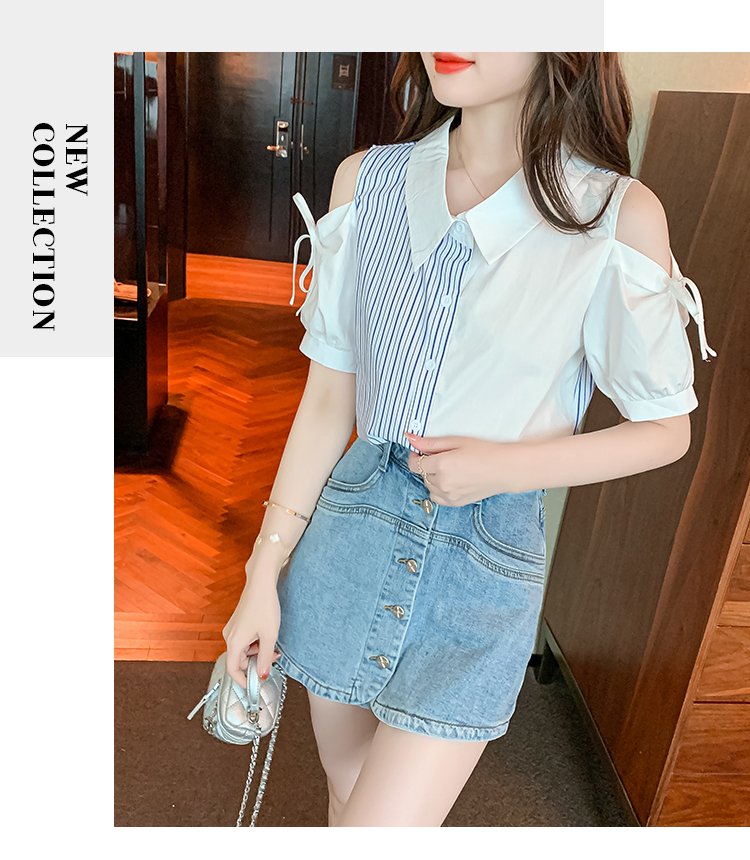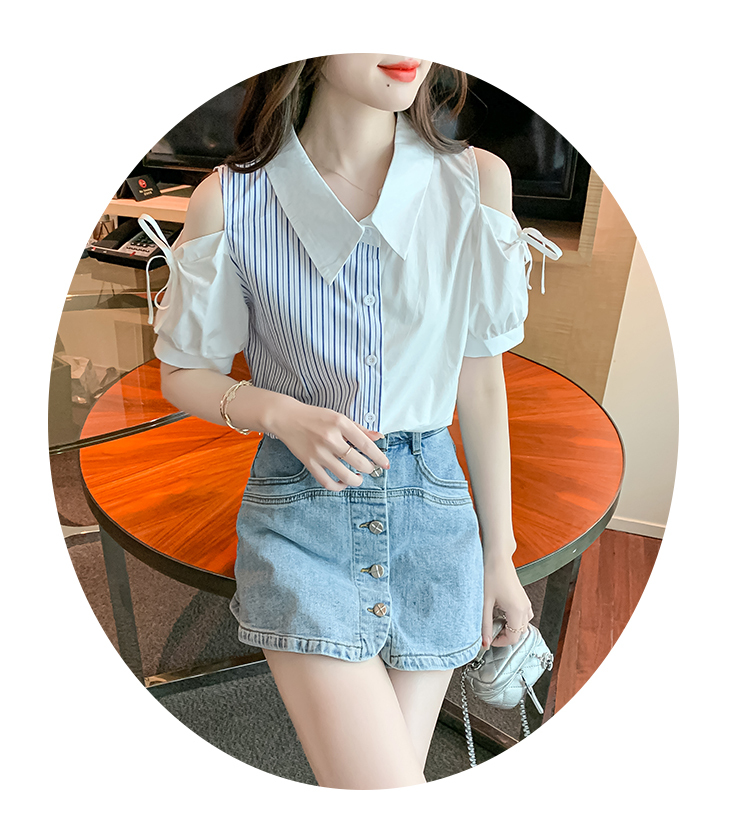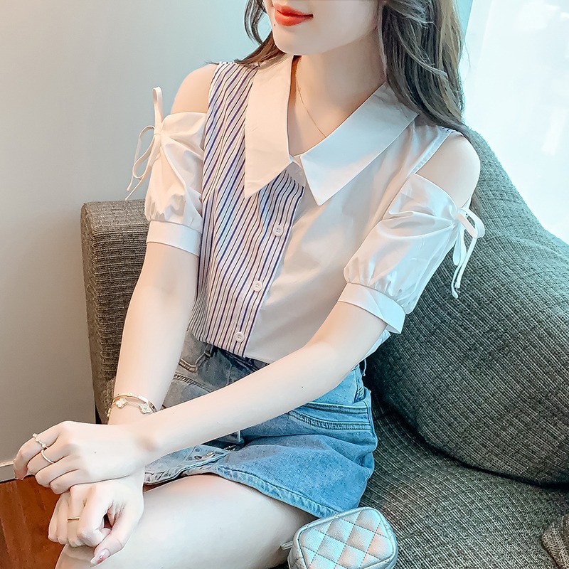 限量特惠|氣質翻領條紋拼接繫帶露肩襯衫(04H3519)
