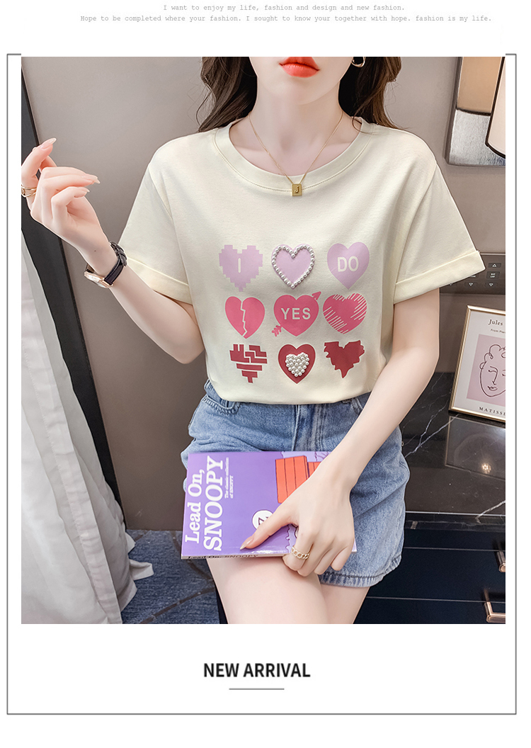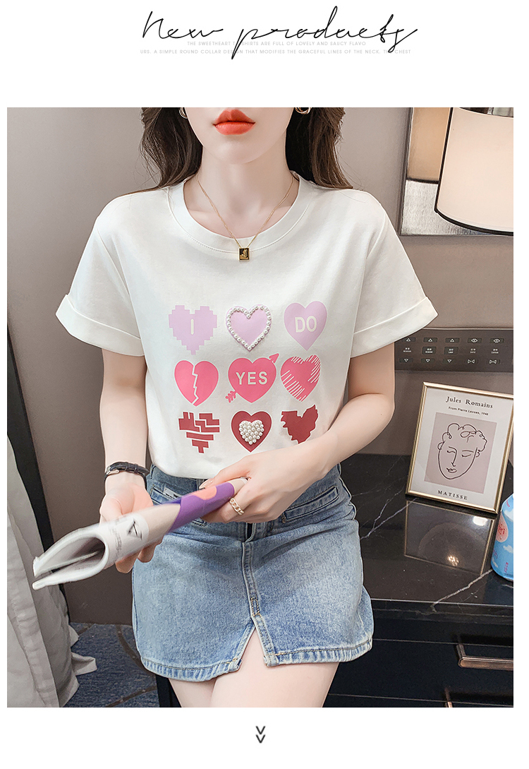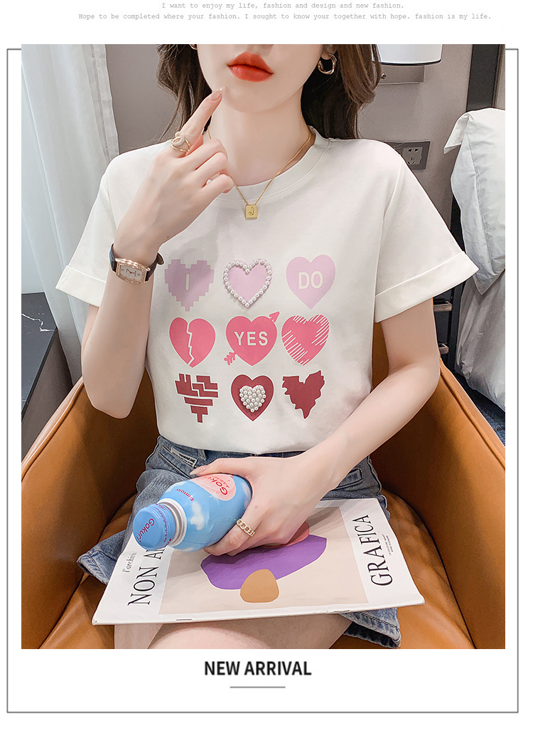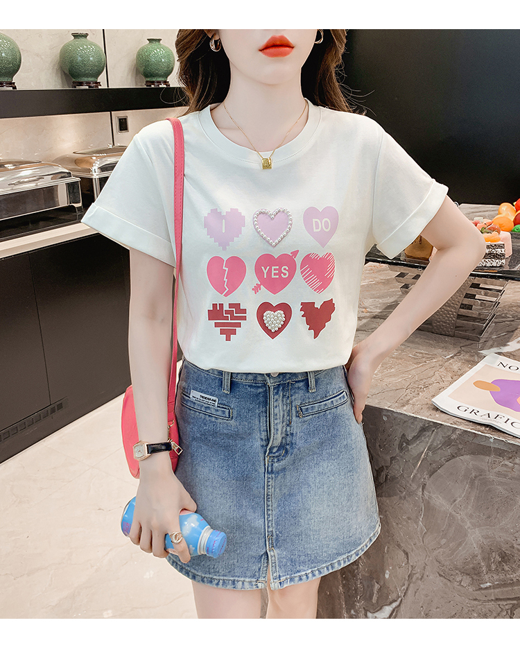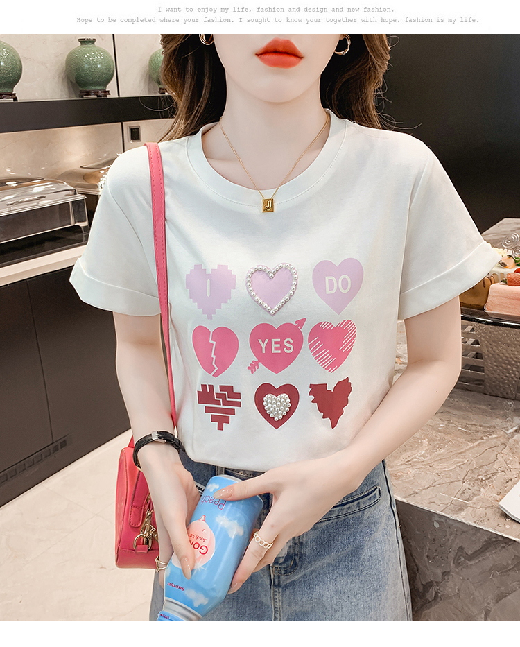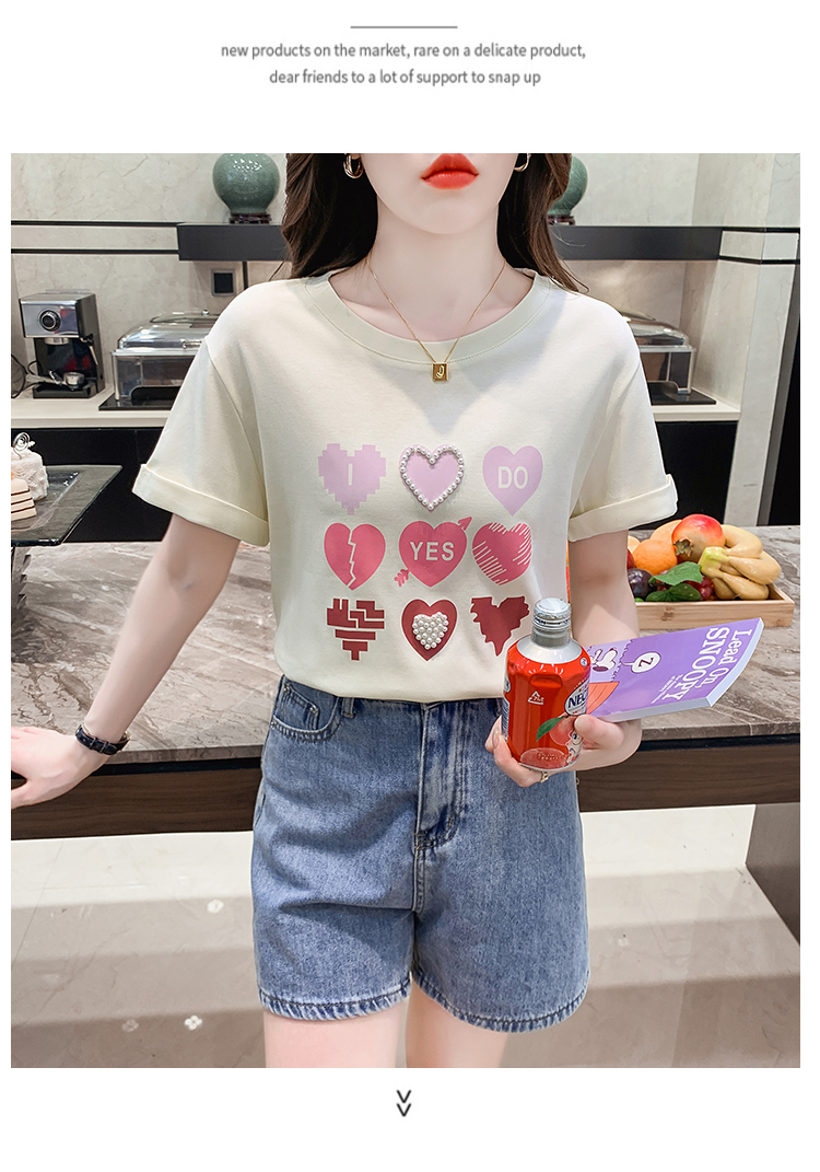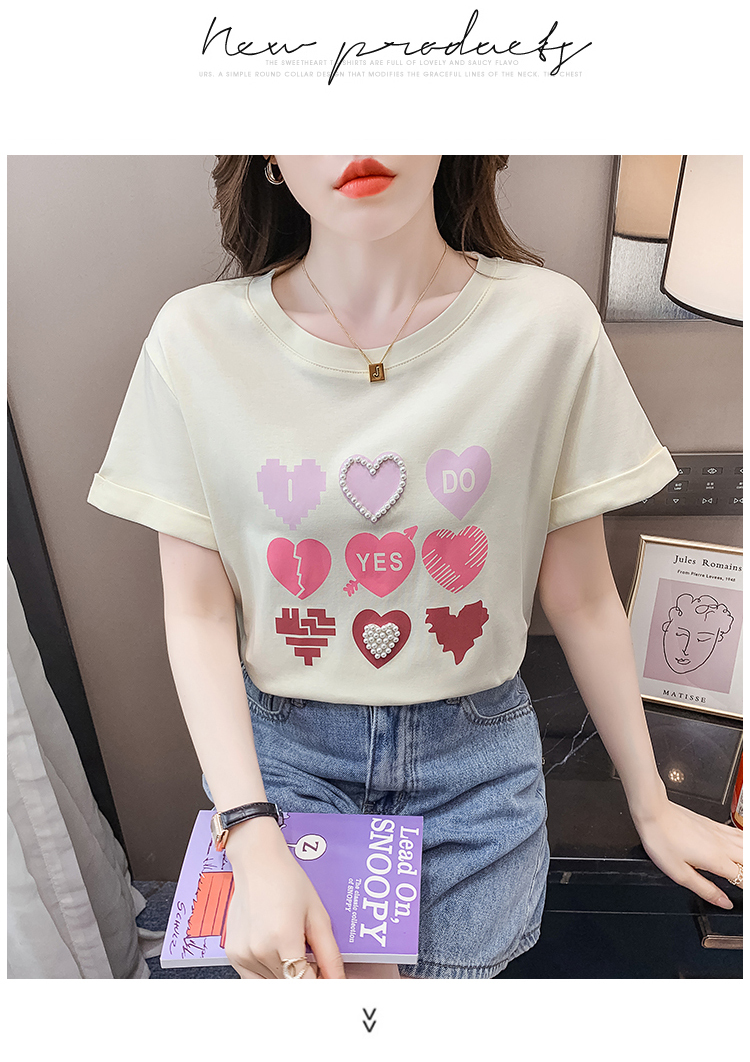 限量特惠|舒適釘珠愛心印花捲邊袖T恤-2色(04TA3387)