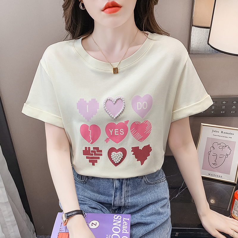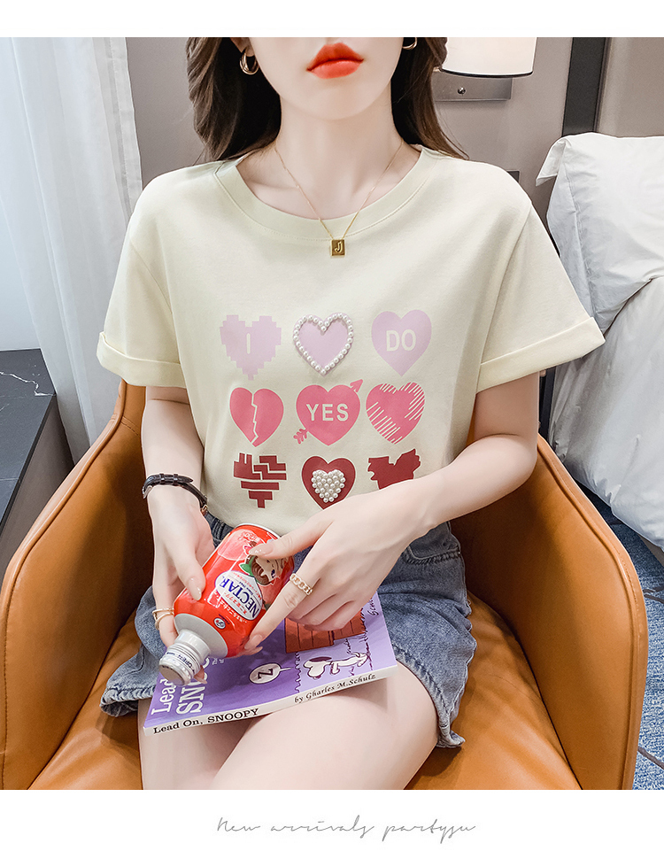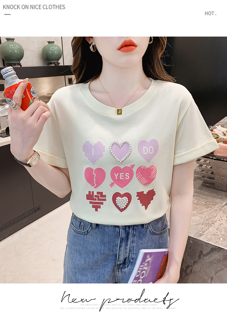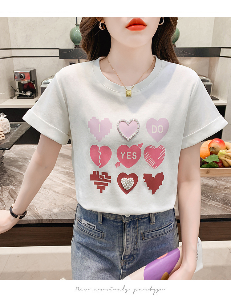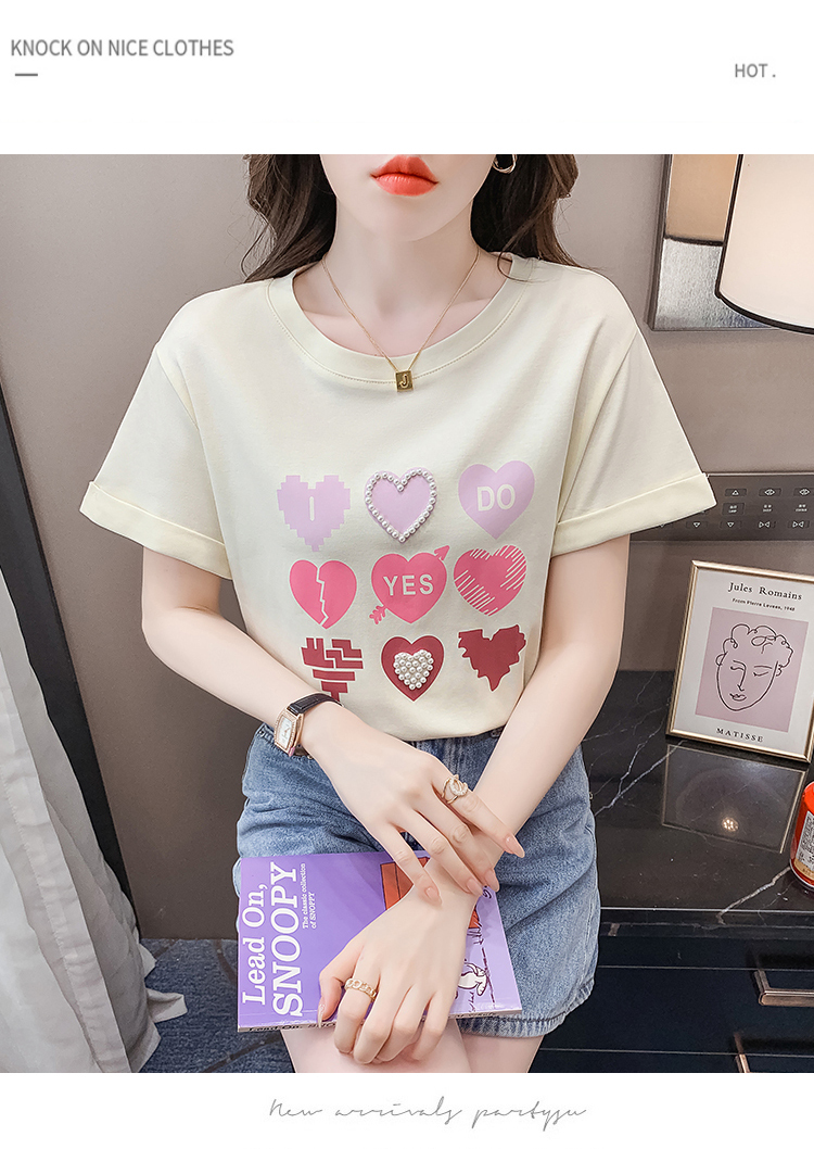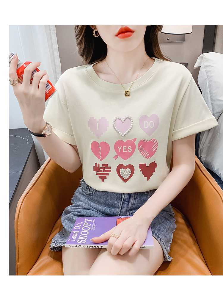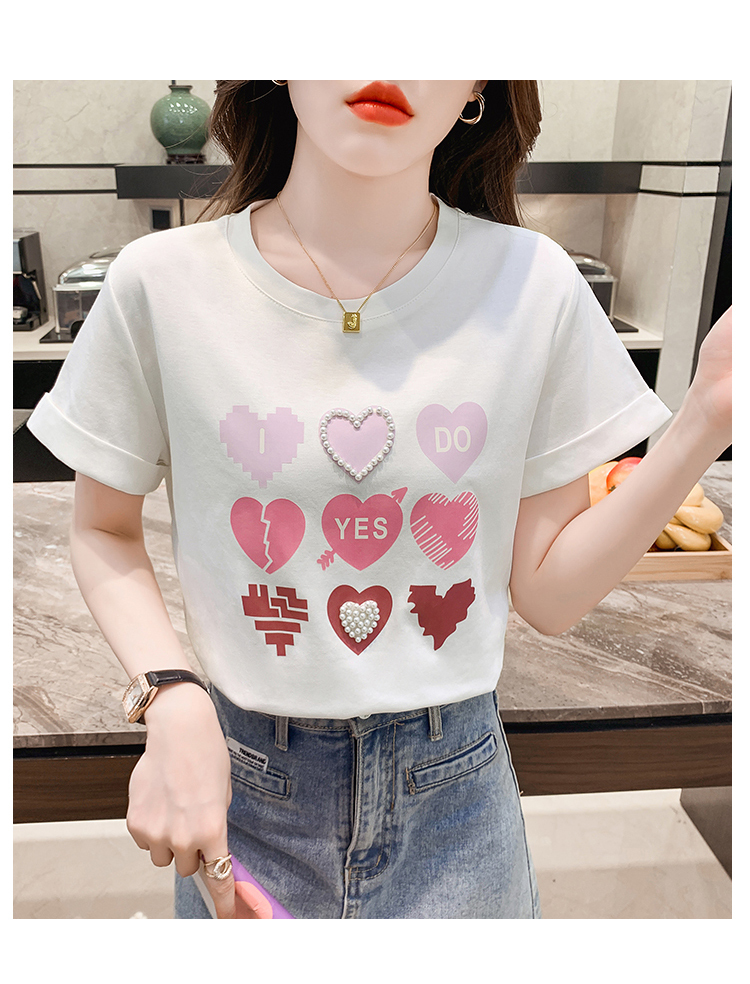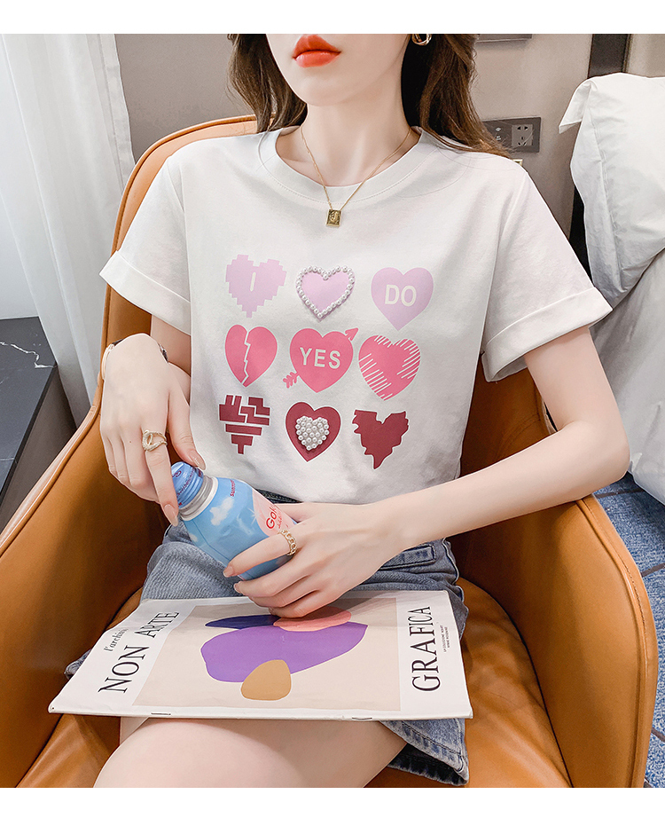限量特惠|舒適釘珠愛心印花捲邊袖T恤-2色(04TA3387)