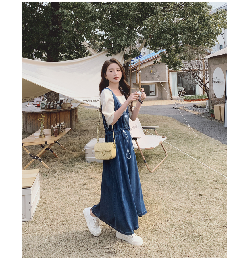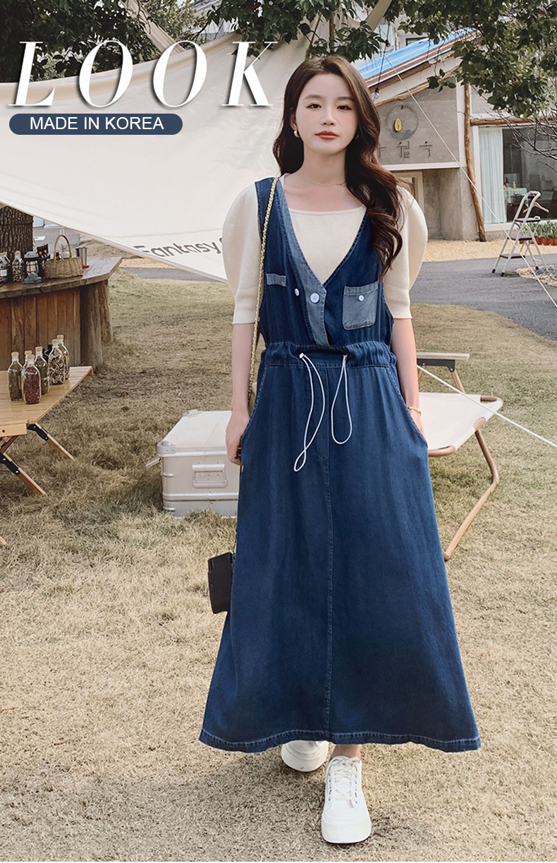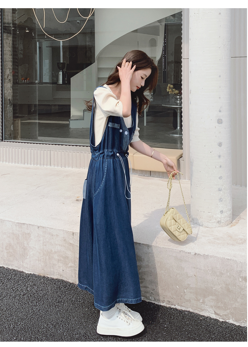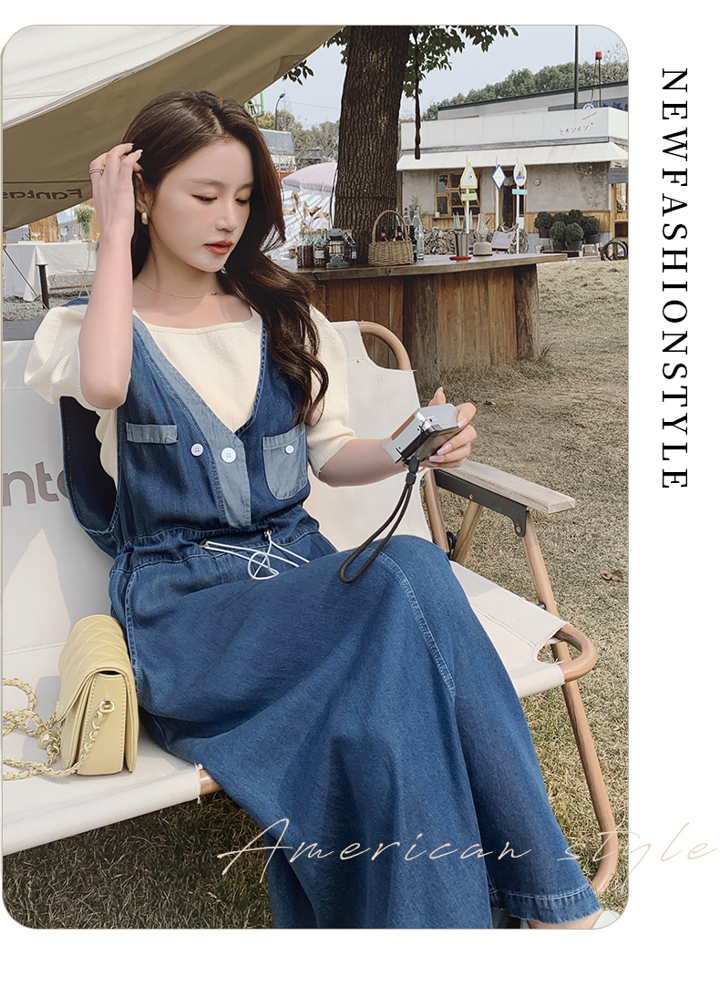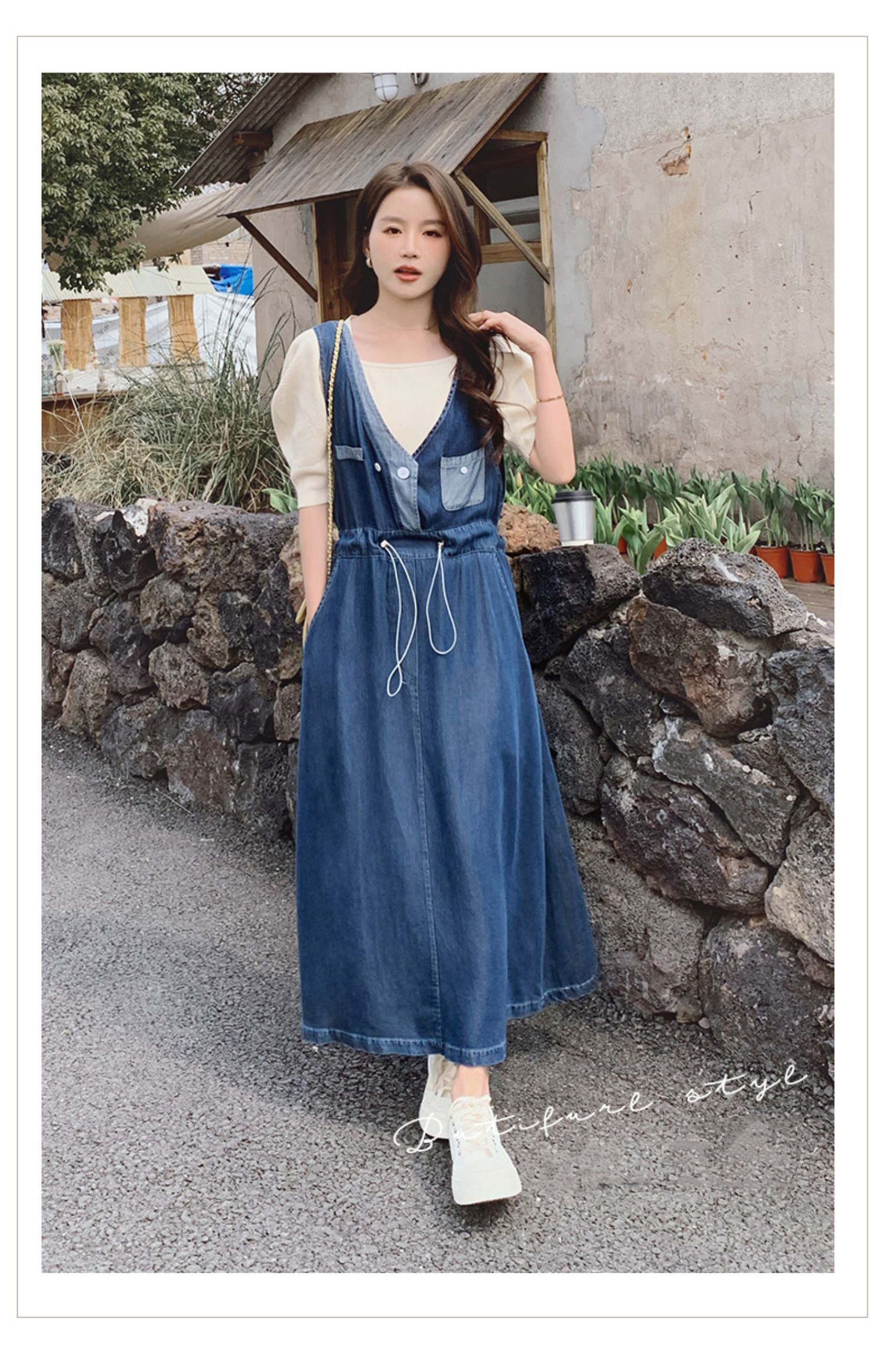 獨家訂製│韓系氣質抽繩收腰牛仔吊帶裙(04TA3396)