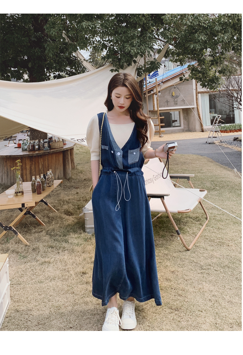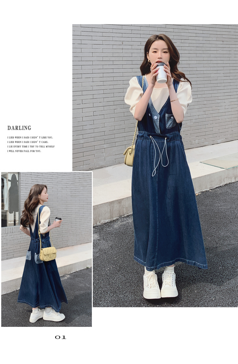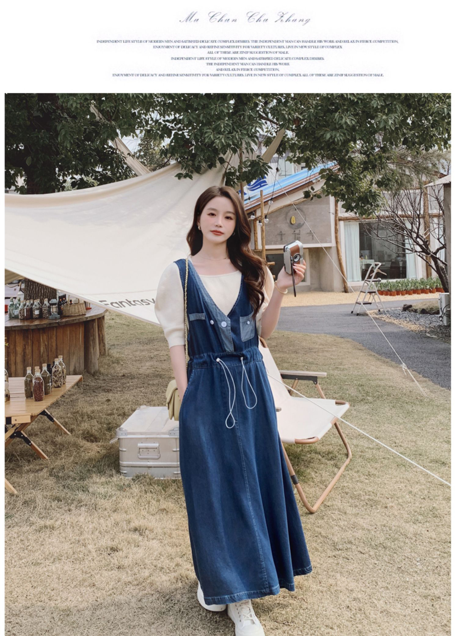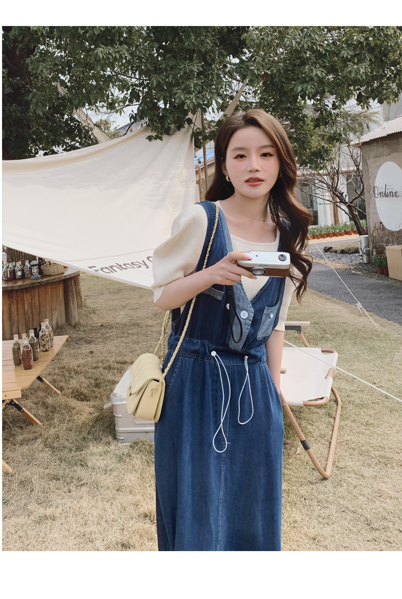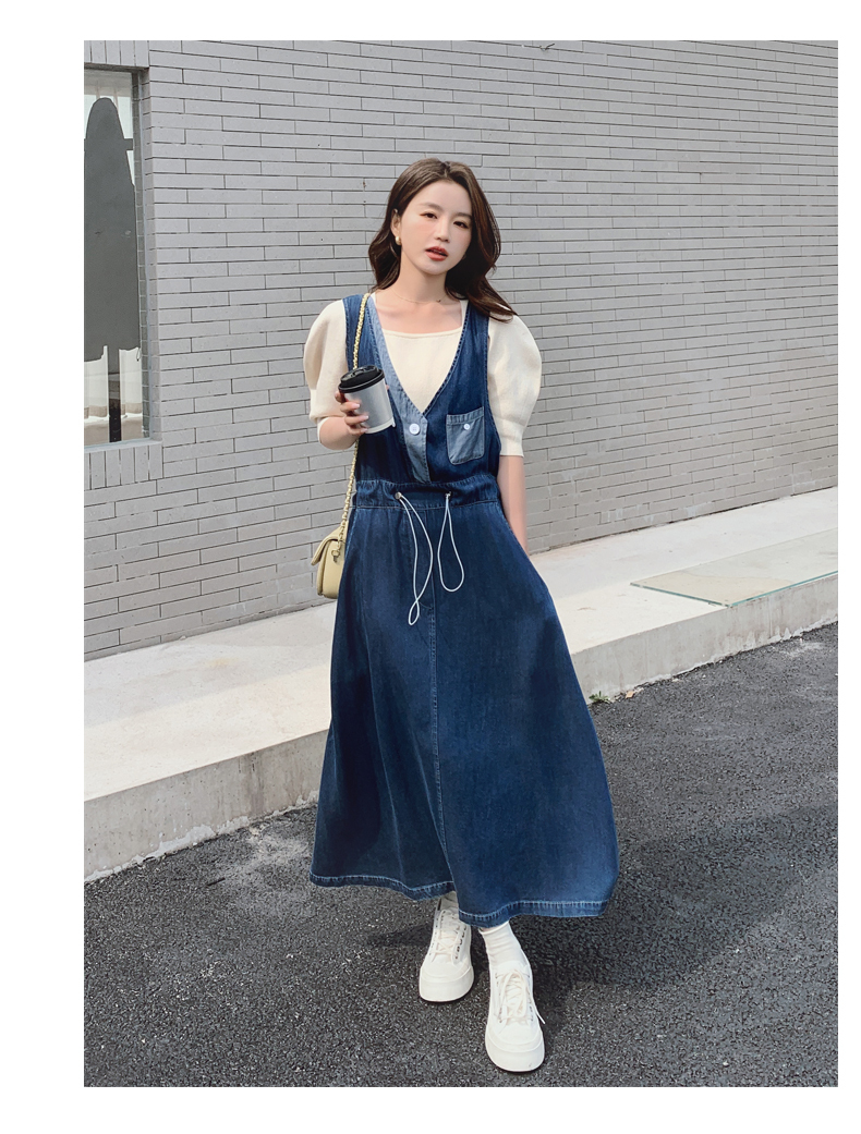 獨家訂製│韓系氣質抽繩收腰牛仔吊帶裙(04TA3396)