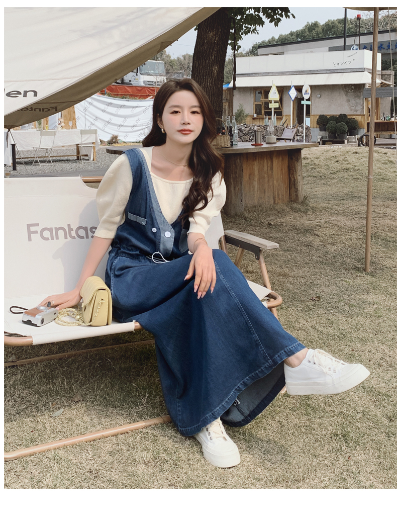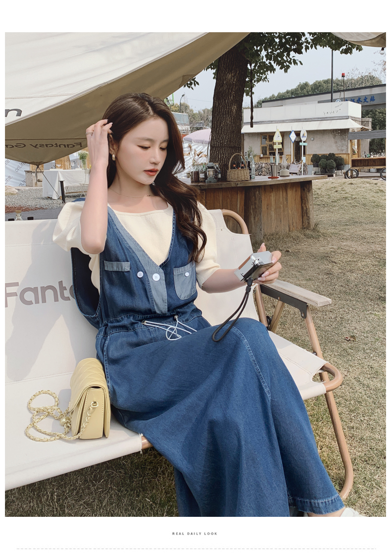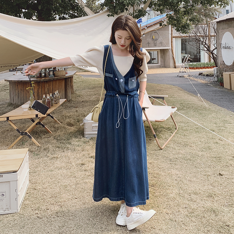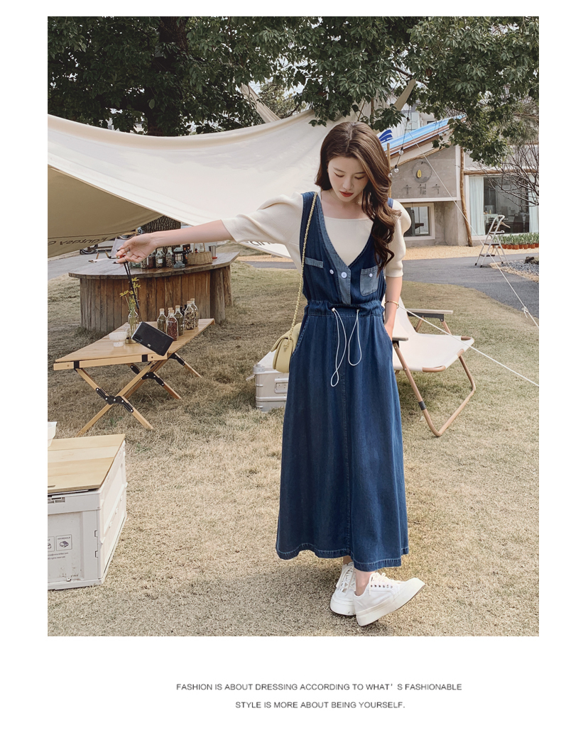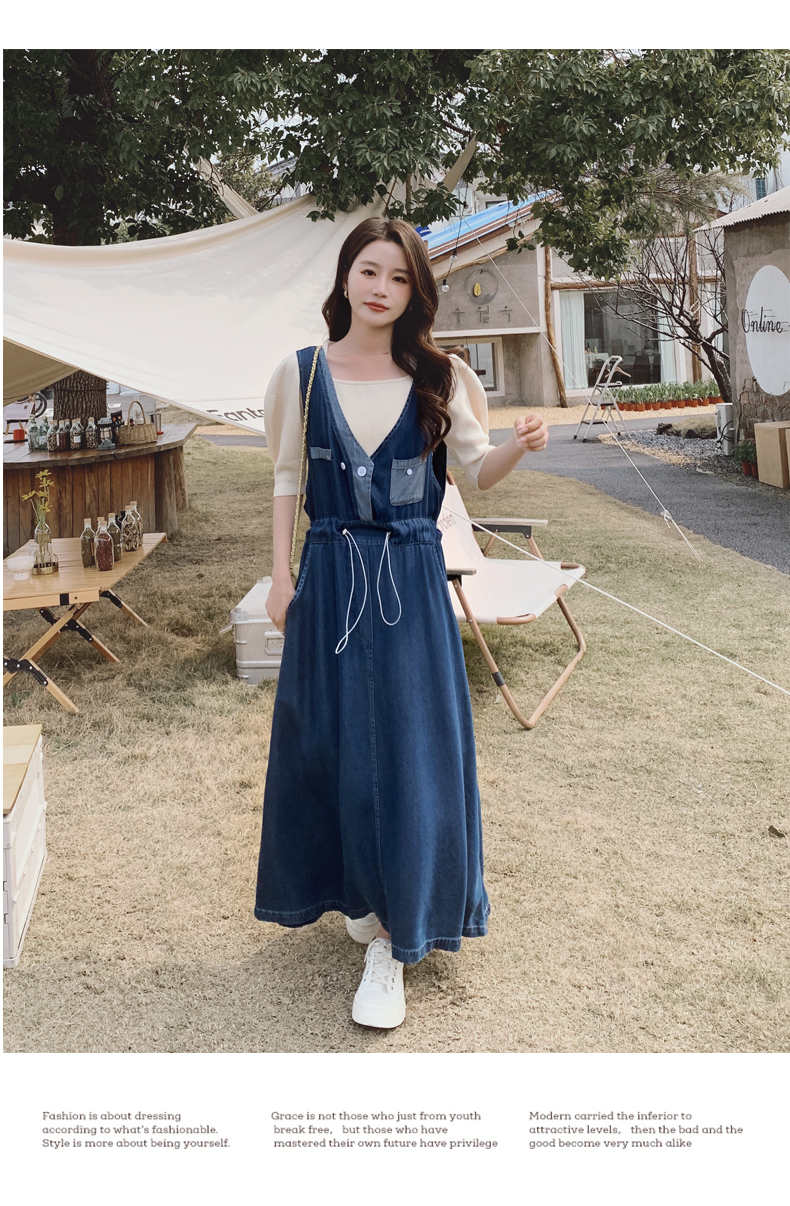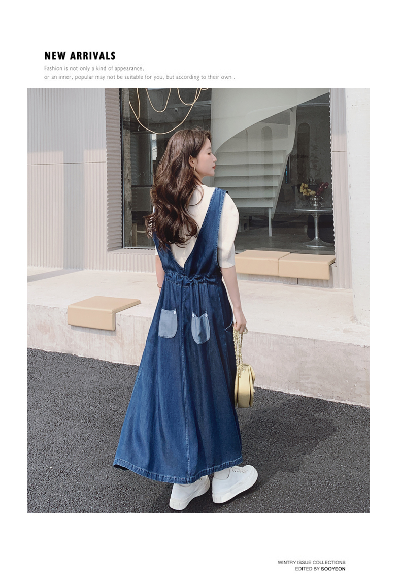 獨家訂製│韓系氣質抽繩收腰牛仔吊帶裙(04TA3396)