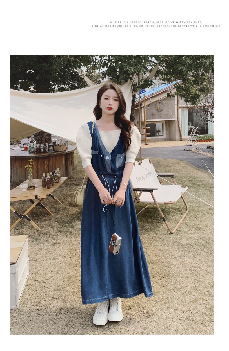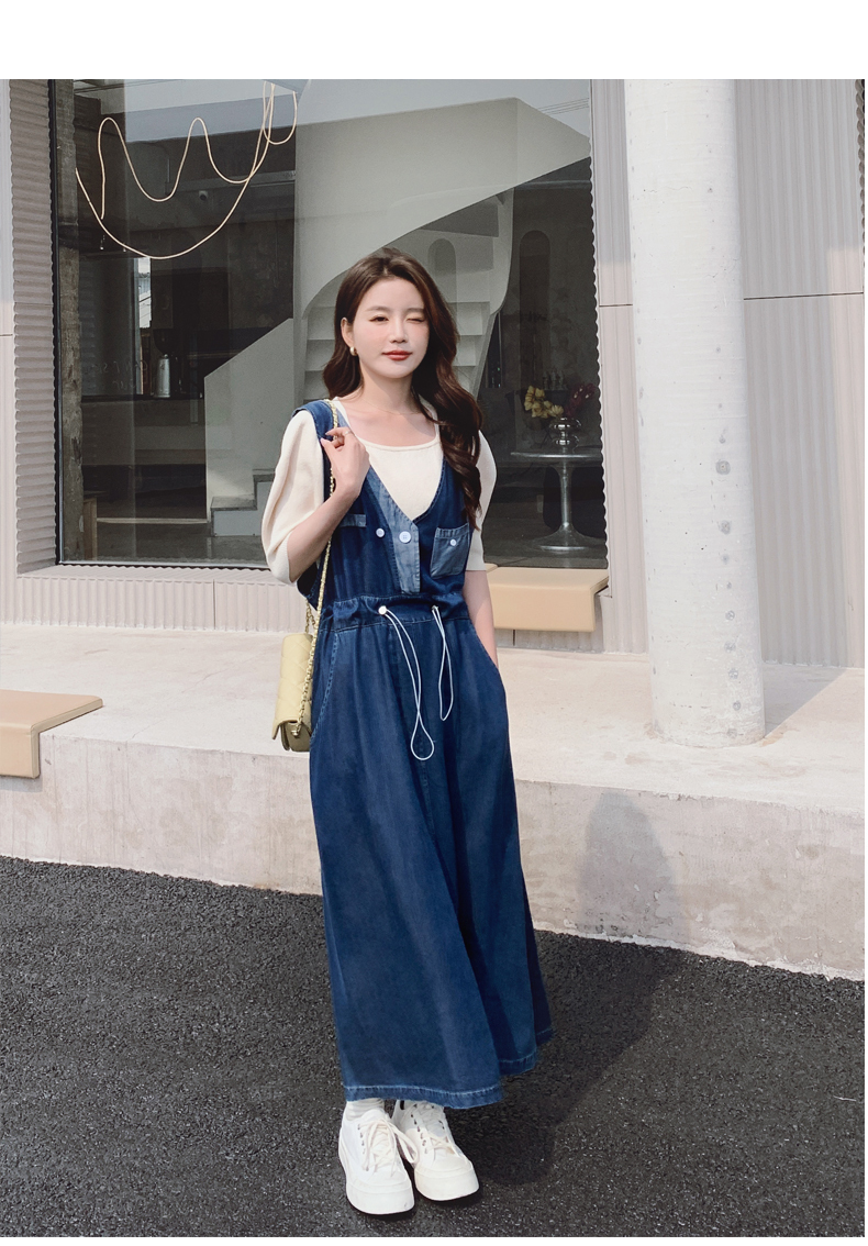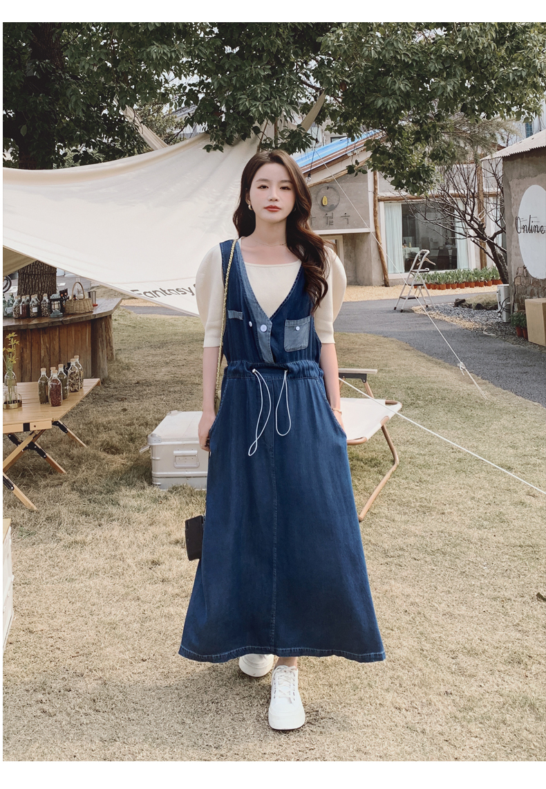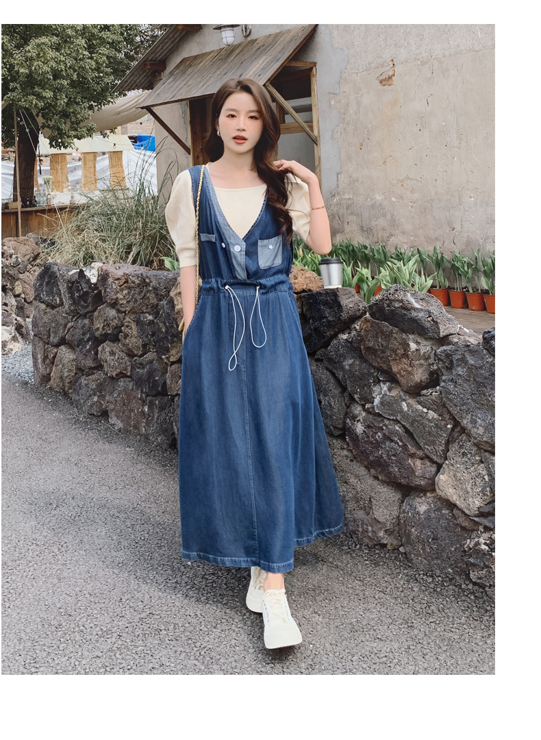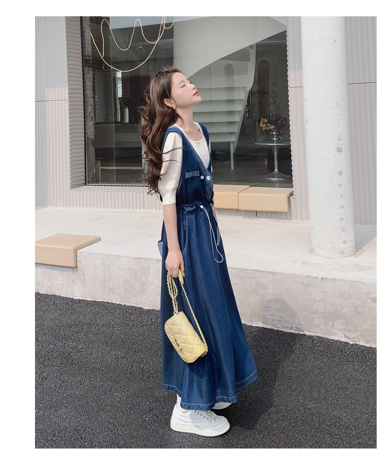 獨家訂製│韓系氣質抽繩收腰牛仔吊帶裙(04TA3396)