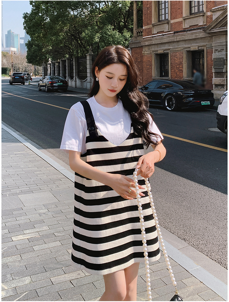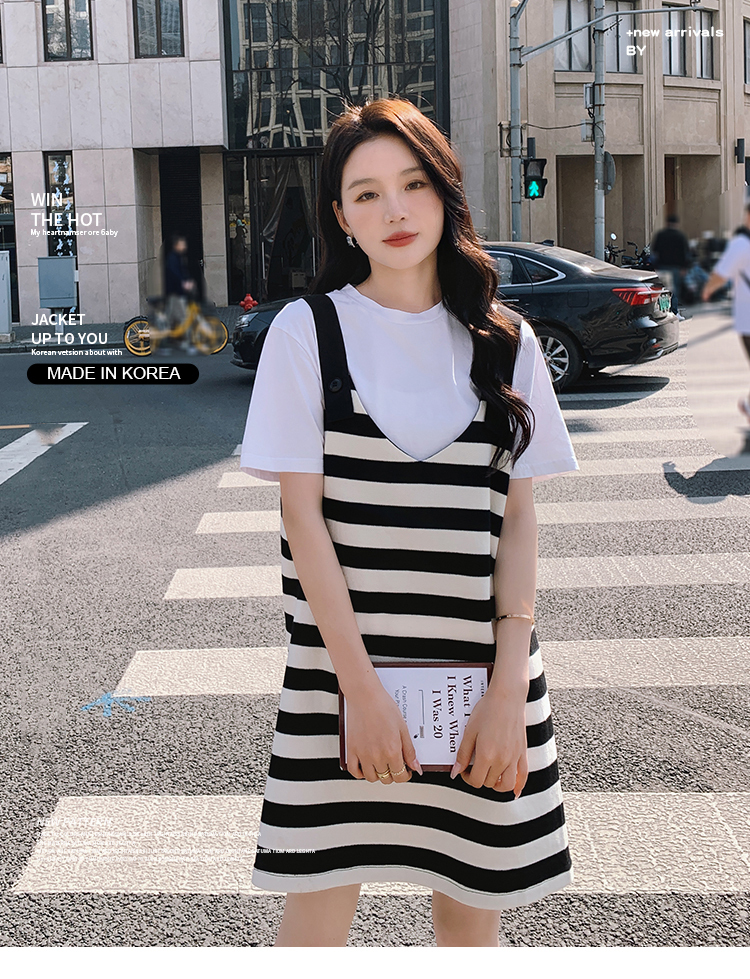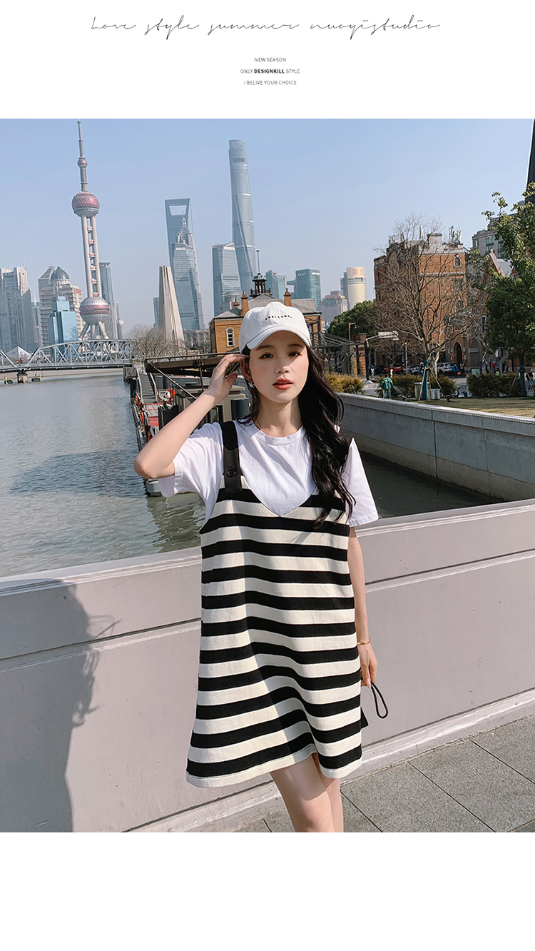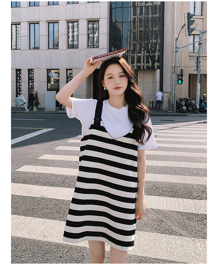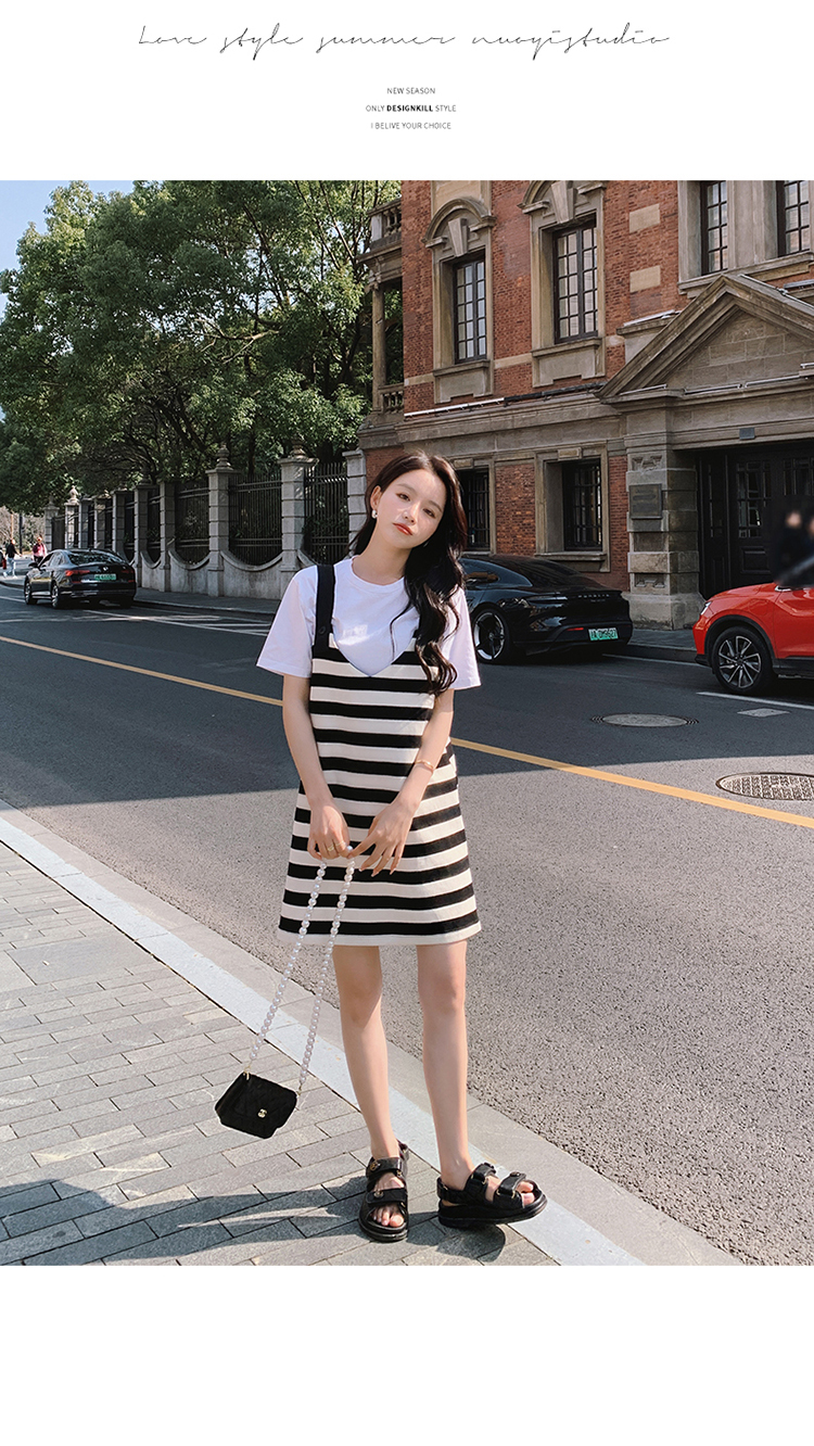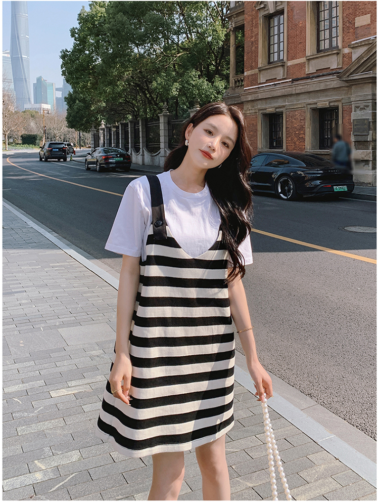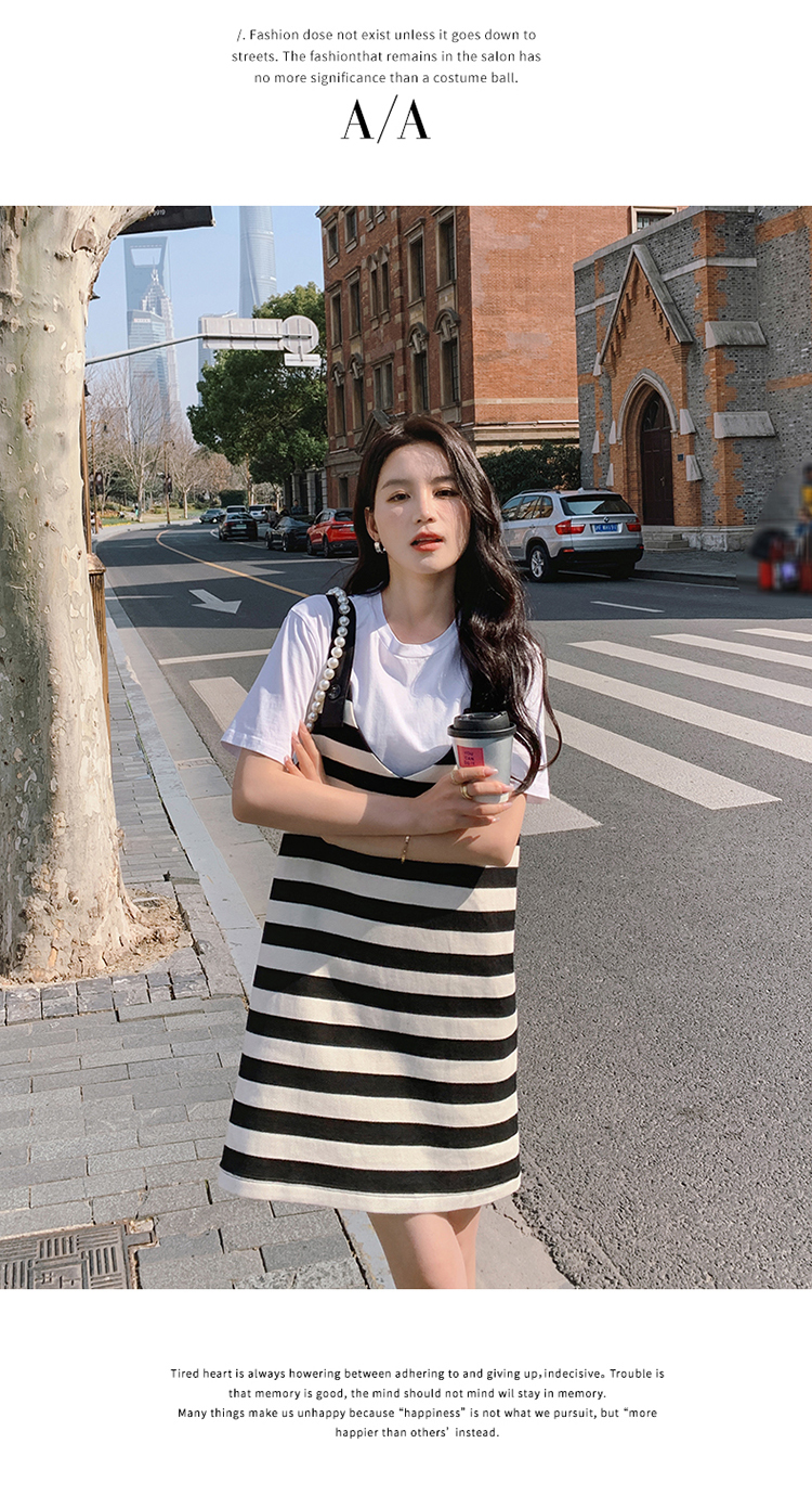 獨家訂製│韓系減齡感純色T恤+條紋吊帶裙兩件式套裝組(04TA3402)