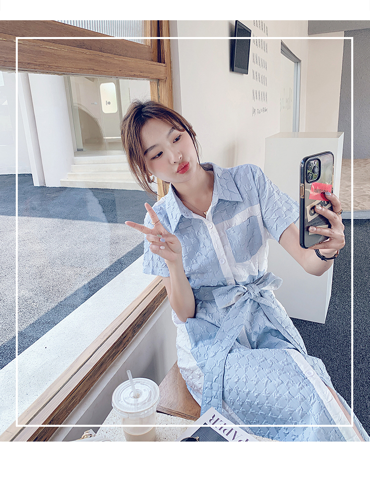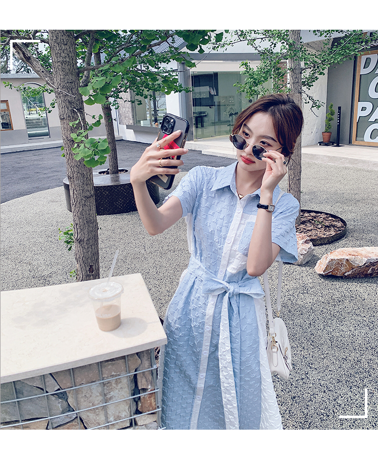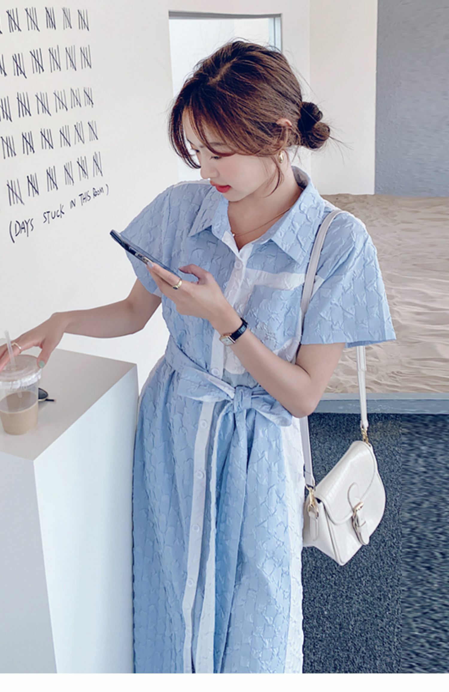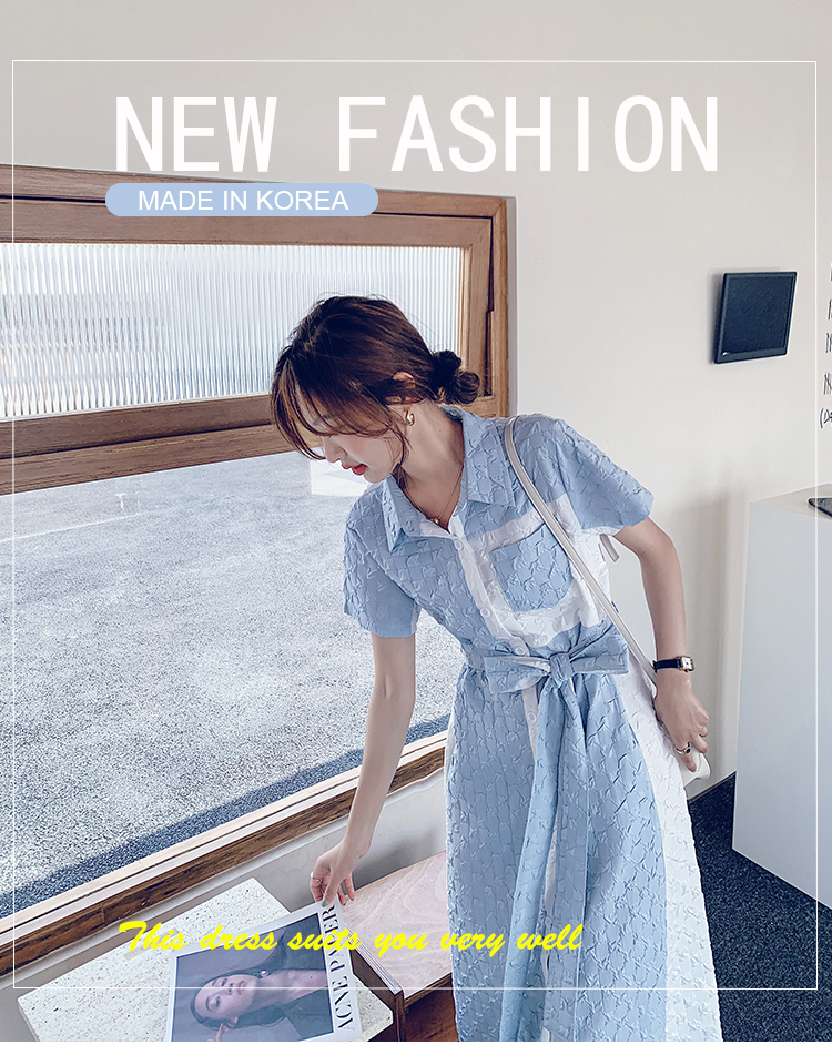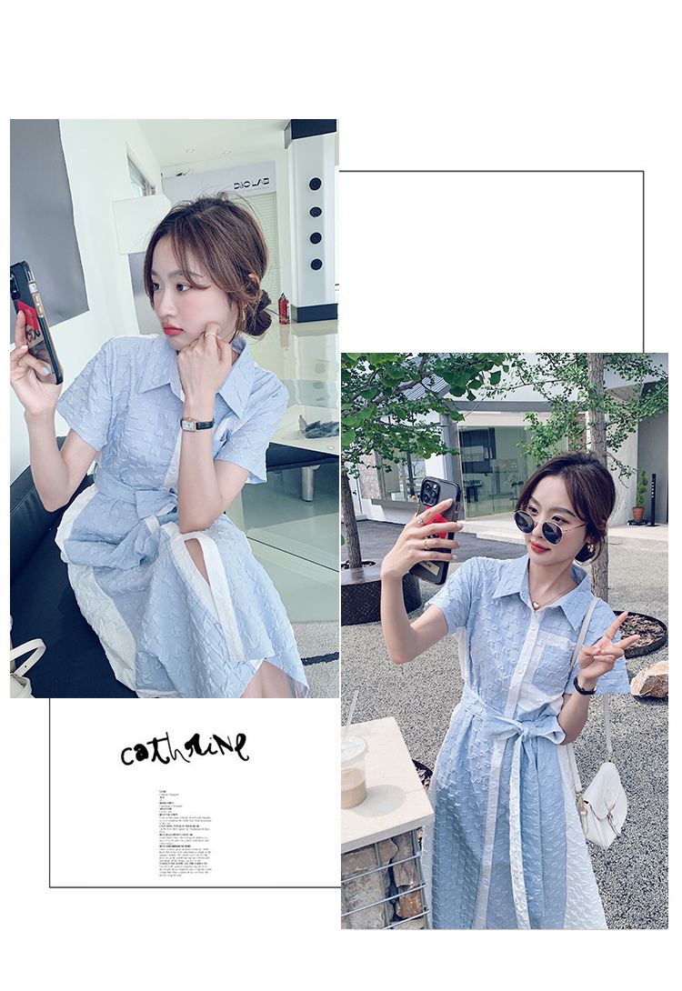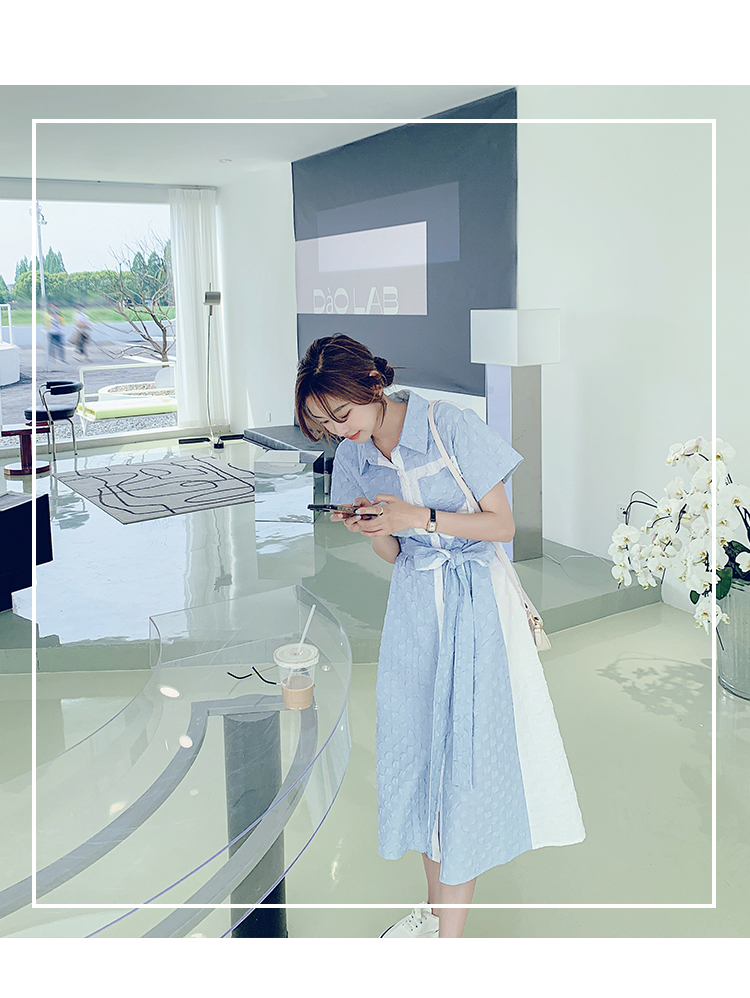 獨家訂製│韓系氣質感撞色壓紋繫帶連衣裙(04TA3414)